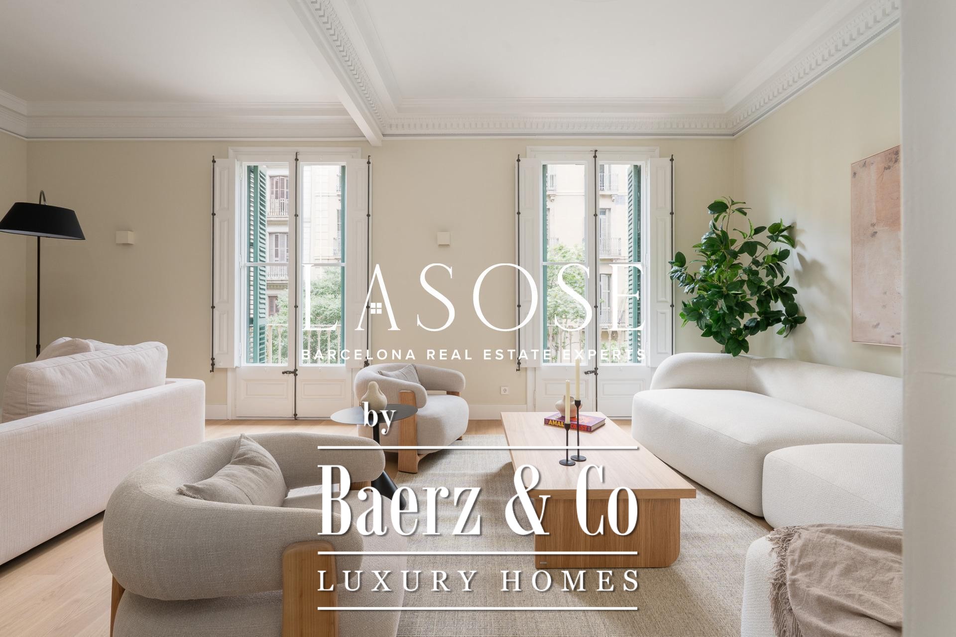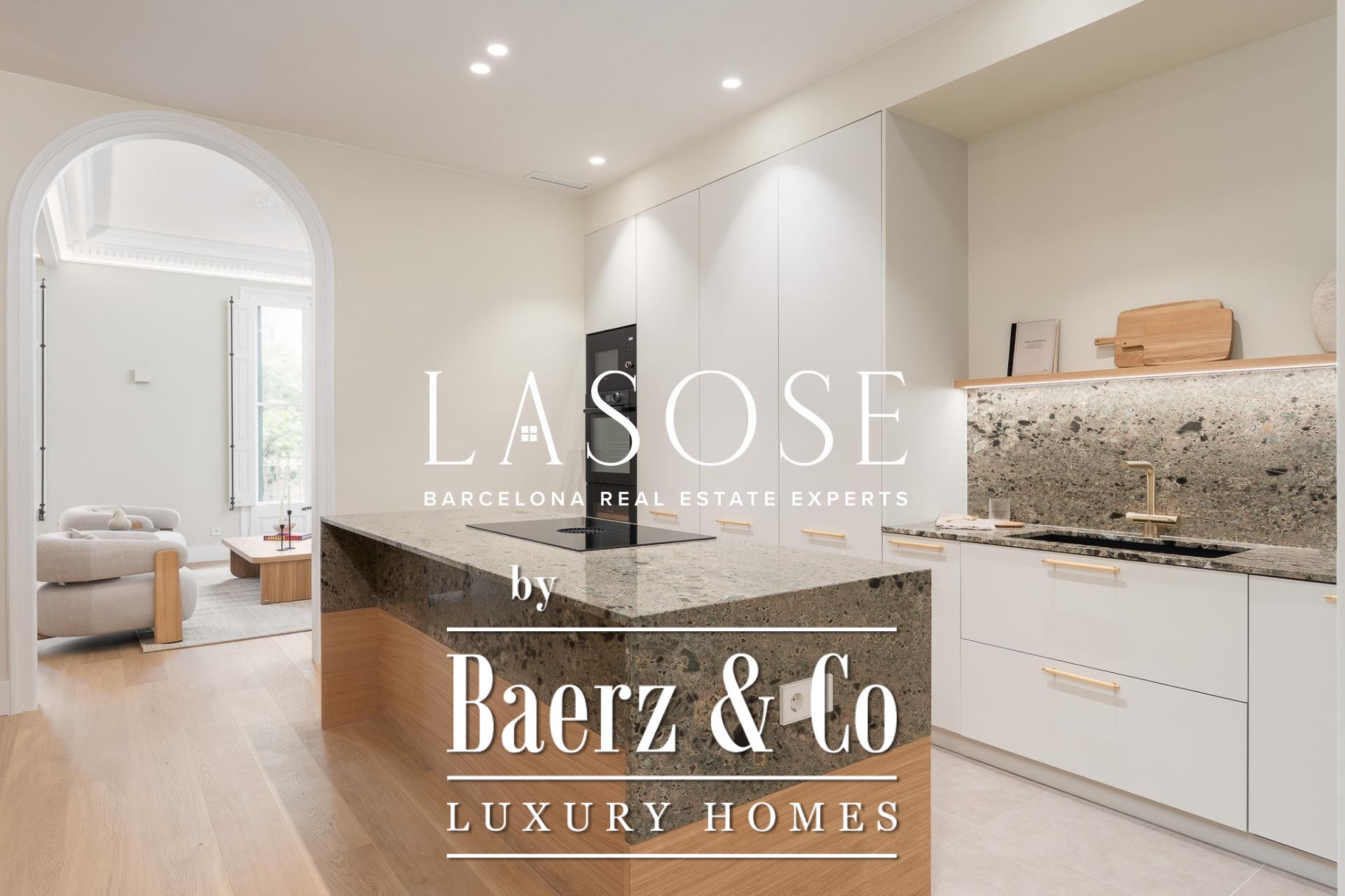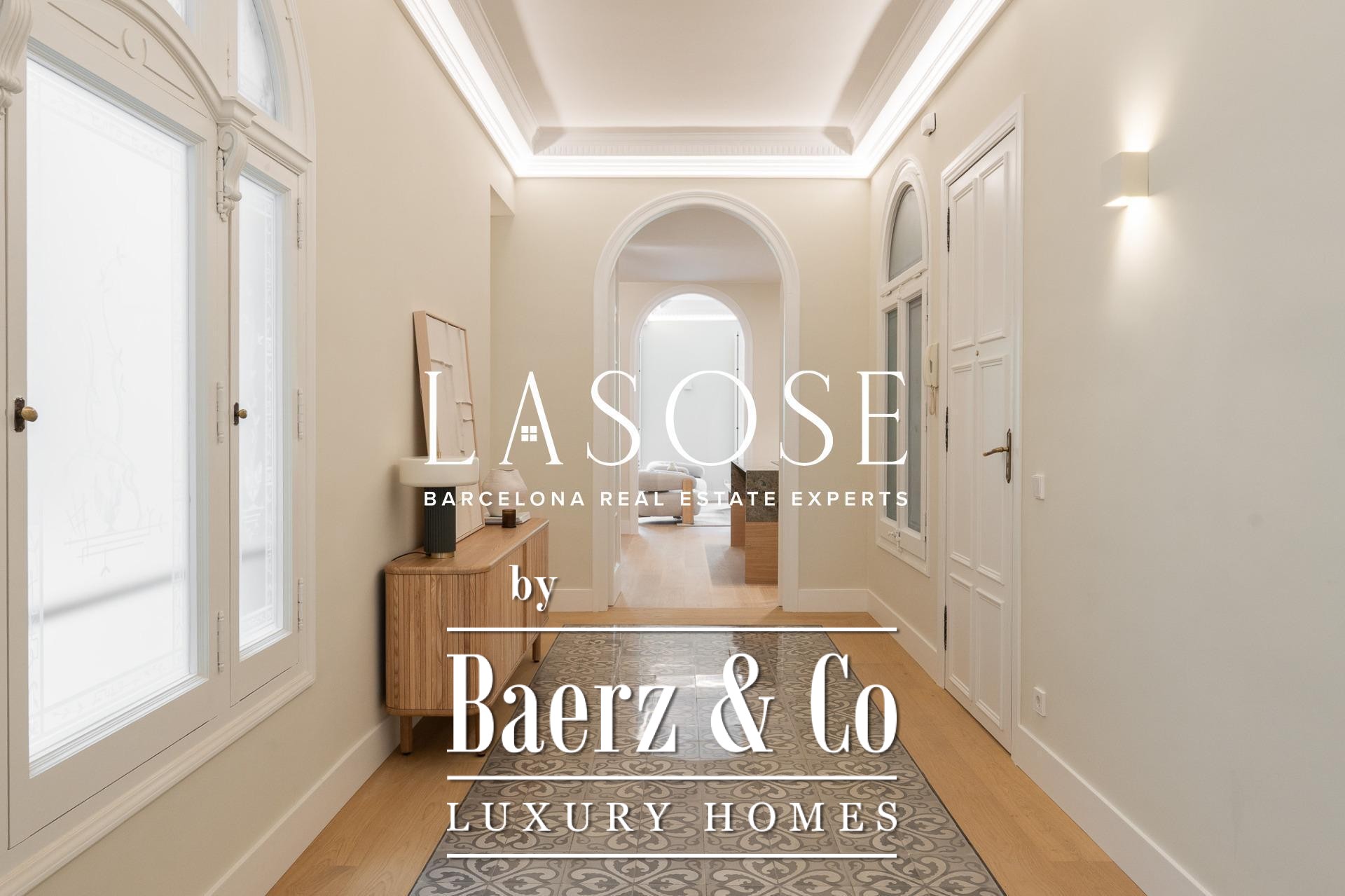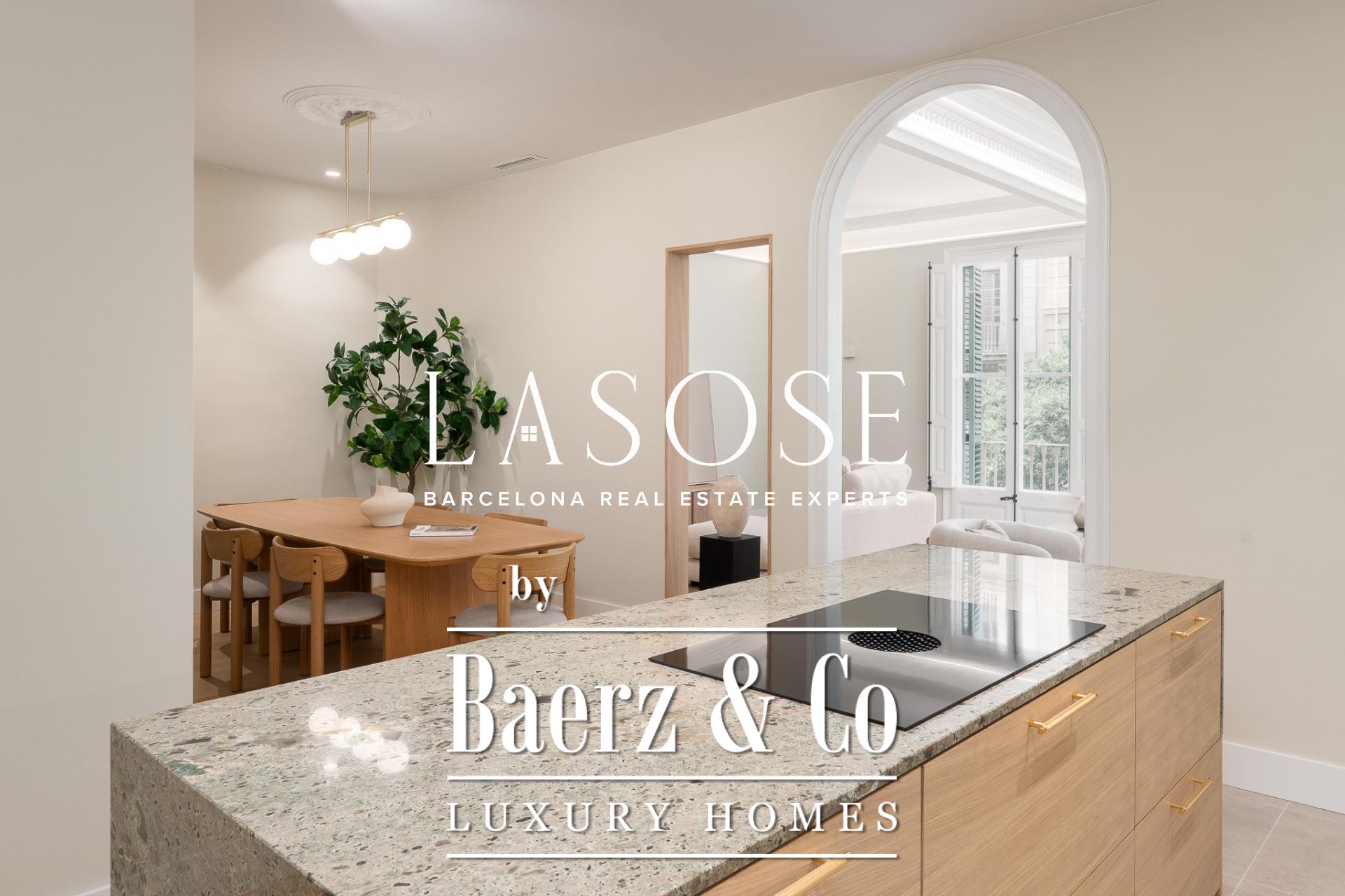 LASOSE is privileged to present this magnificent high-end residence, located in the heart of Barcelona's coveted Eixample district.. . Located in an elegant listed royal estate dating from 1900, this property stands out for its stately architecture, its historical value and its unmistakable character. It is a unique apartment, where the charm of Barcelona's modernism merges with the most demanding comfort and contemporary design.. . Located on a bright 2nd floor with double orientation, the property enjoys abundant natural light throughout the day. Its careful distribution maximizes every corner, offering spacious, functional and stylish spaces.. . The property has three elegant double suites, all with full bathroom, and one of them equipped with an exclusive glazed gallery, perfect as a chill out corner or as a sophisticated workspace.. . The spacious living-dining room is harmoniously integrated with a designer kitchen with central island, equipped with top-of-the-line materials and appliances: polished marble countertop by Levantina, porcelain flooring, and high-end appliances by De Dietrich, Bora and Liebherr (including refrigerator, dishwasher and wine cooler).. . In addition, the dining room - bathed in natural light - can easily be transformed into a fourth bedroom according to the buyer's needs.. . This exclusive home offers luxury finishes such as natural wood floors, original hydraulic tiles and high ceilings decorated with moldings and rosettes, which