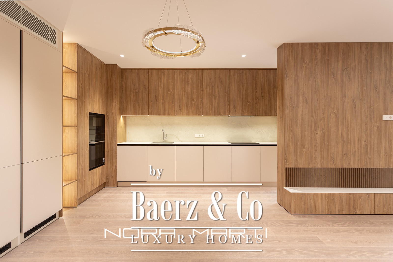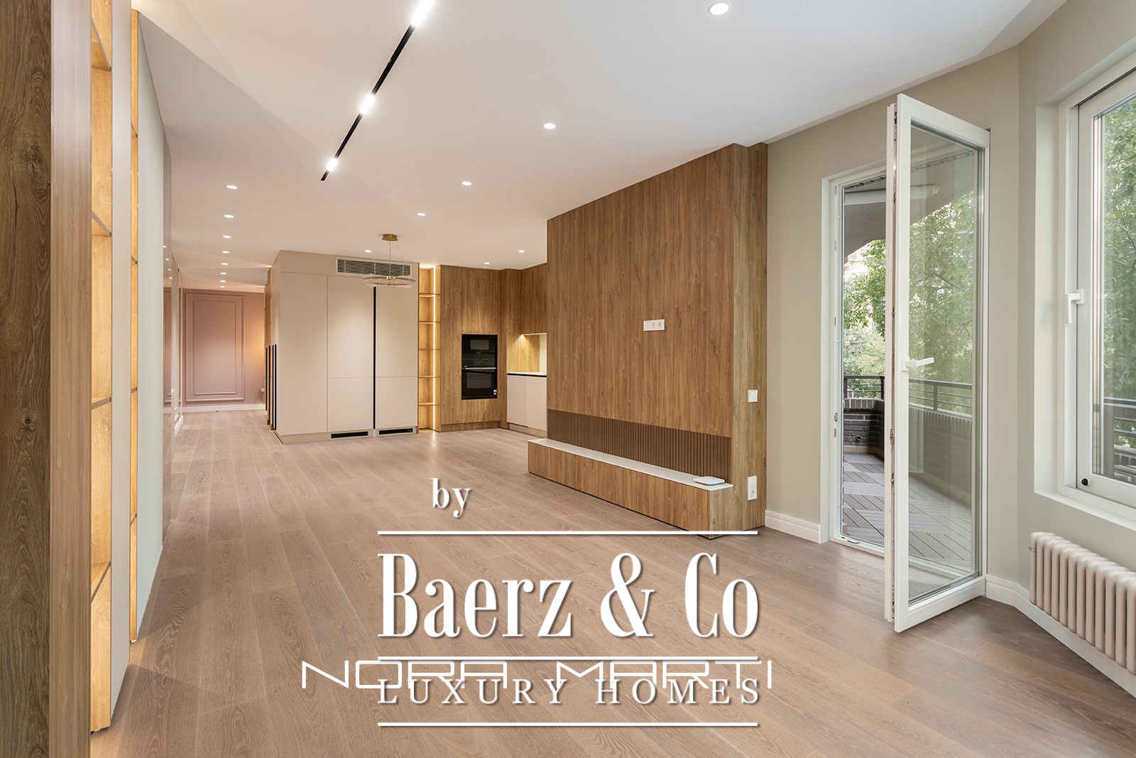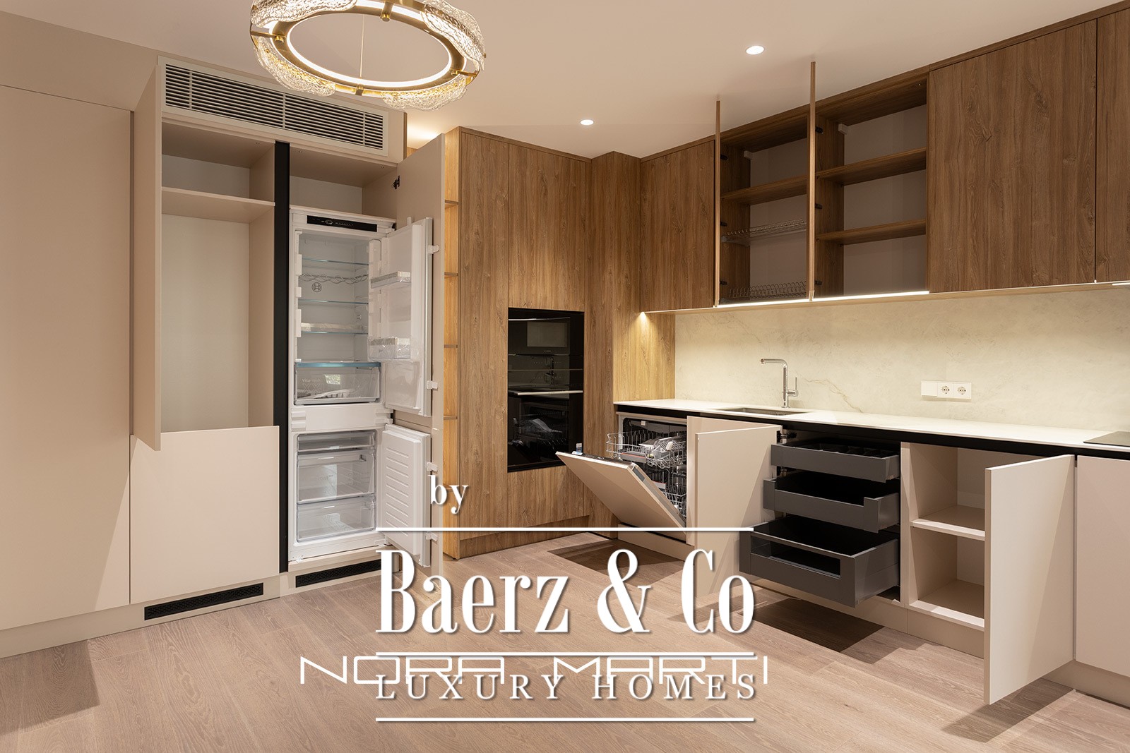 Een royale open woon-, eet- en keukenruimte van circa 51 m² vormt het middelpunt van het appartement en loopt moeiteloos over in een van de twee terrassen, samen goed voor circa 12 m². De keuken is zowel functioneel als elegant, voorzien van Bosch-apparatuur en op maat gemaakte kasten en opbergruimte. Drie dubbele slaapkamers vormen rustige, privé toevluchtsoorden, waaronder een master suite met kleedruimte, eigen badkamer en directe toegang tot het terras. Twee aanvullende dubbele slaapkamers delen een complete badkamer, aangevuld met een discrete gastentoilet.