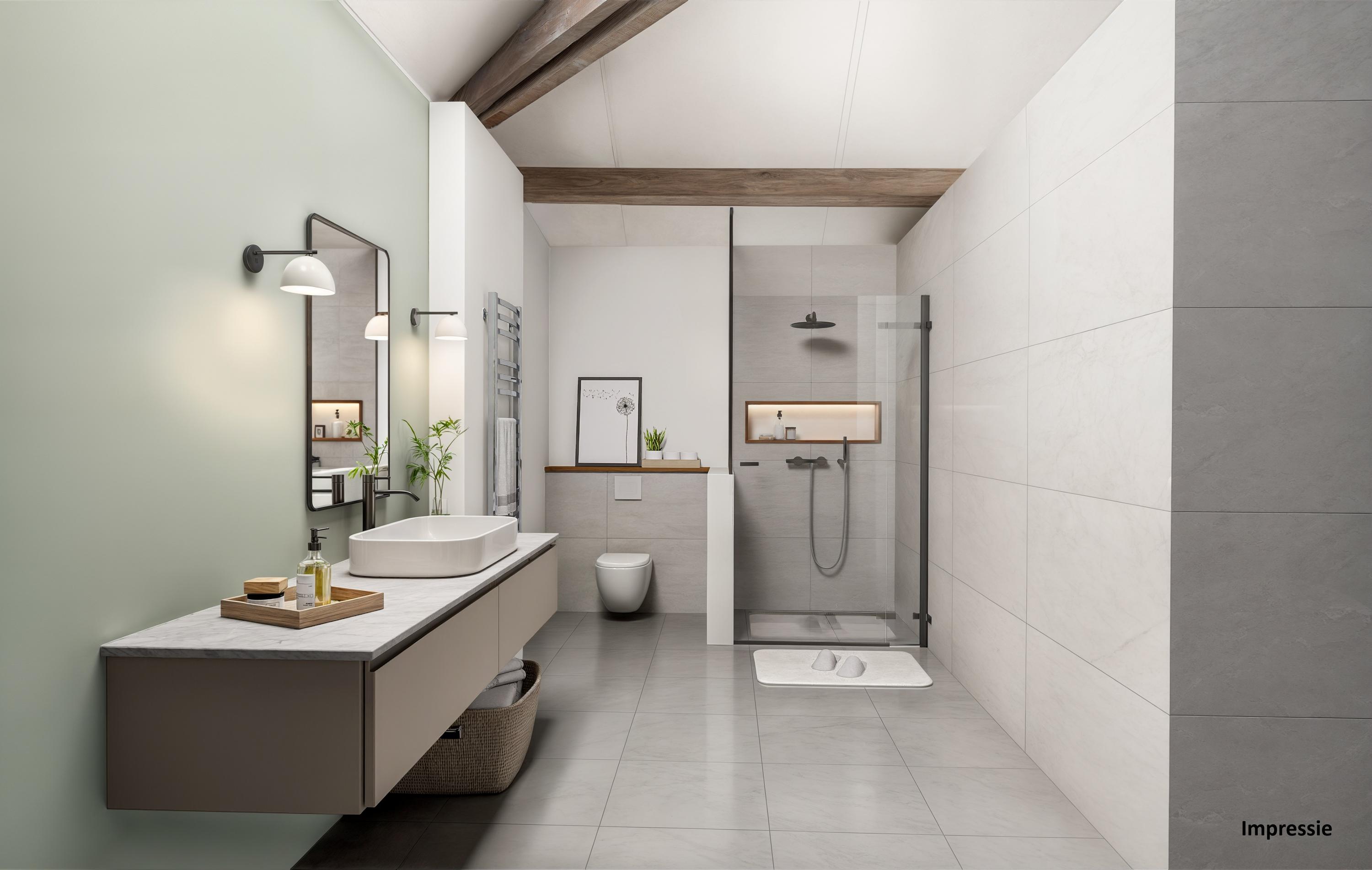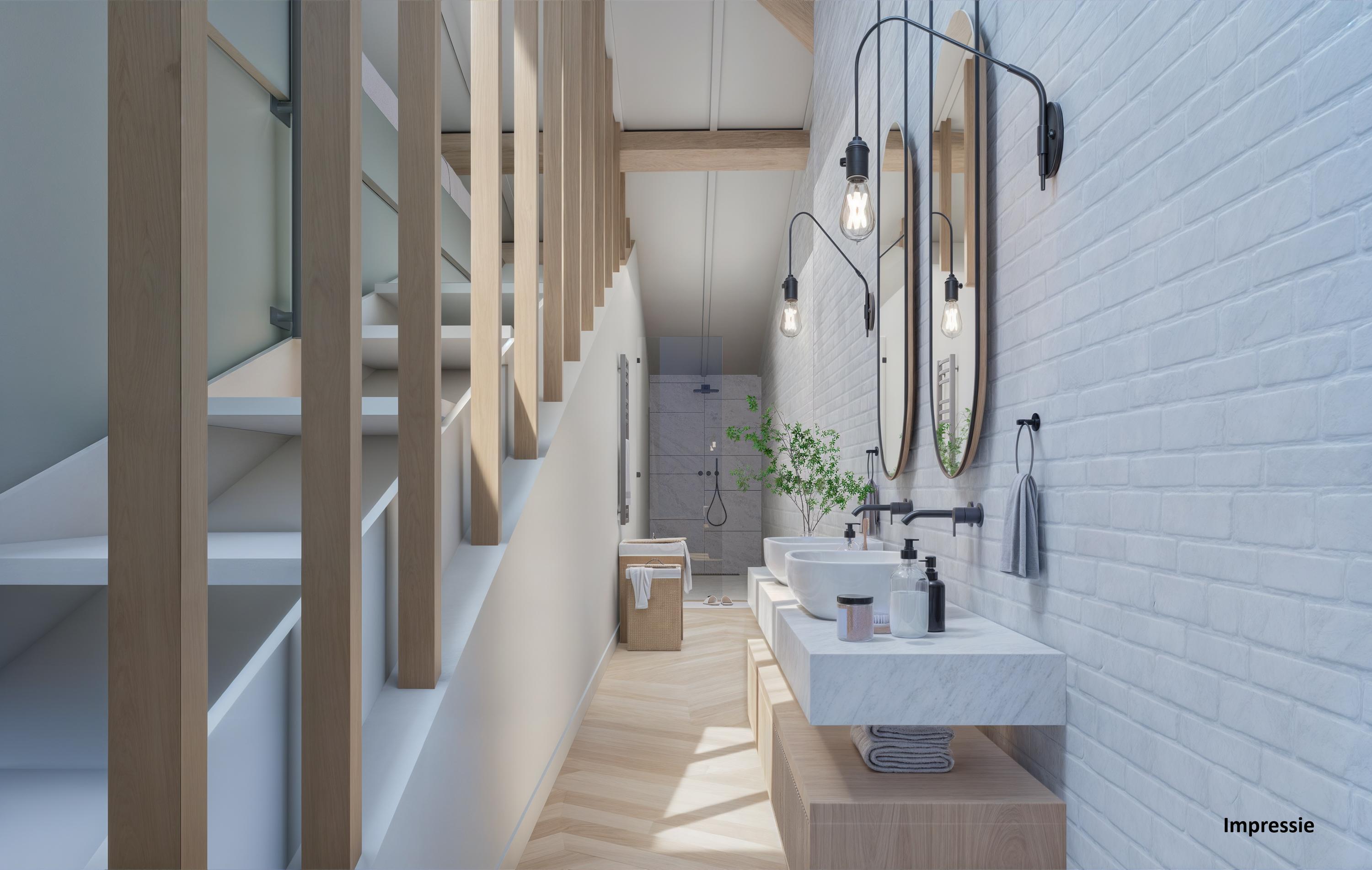 Ruime badkamer met ligbad, inloopdouche, thermostaatkraan, op maat gemaakte wandkast en dubbele wastafel. Dimbare spots verwerkt in de oude balken zorgen voor extra sfeer.