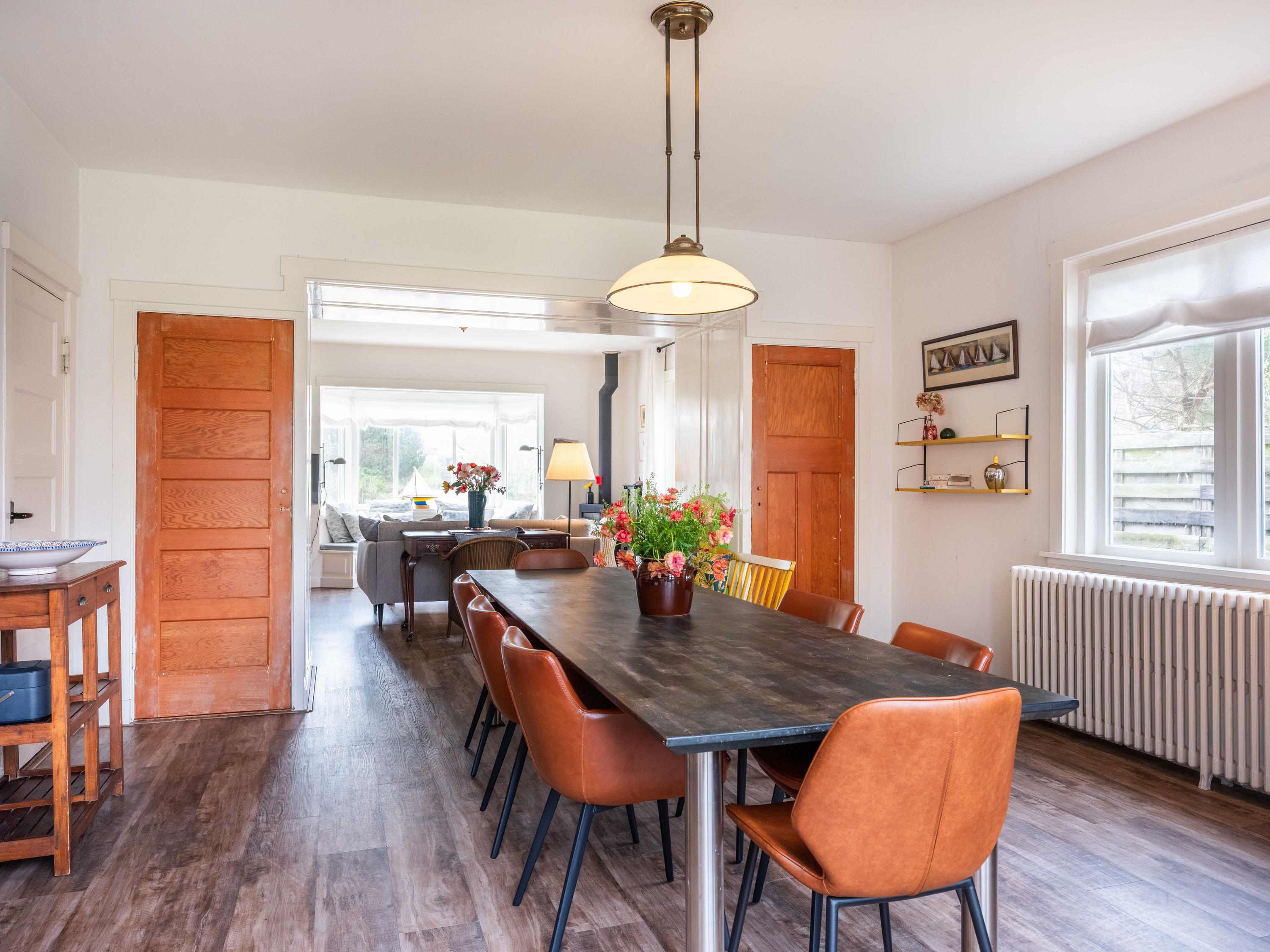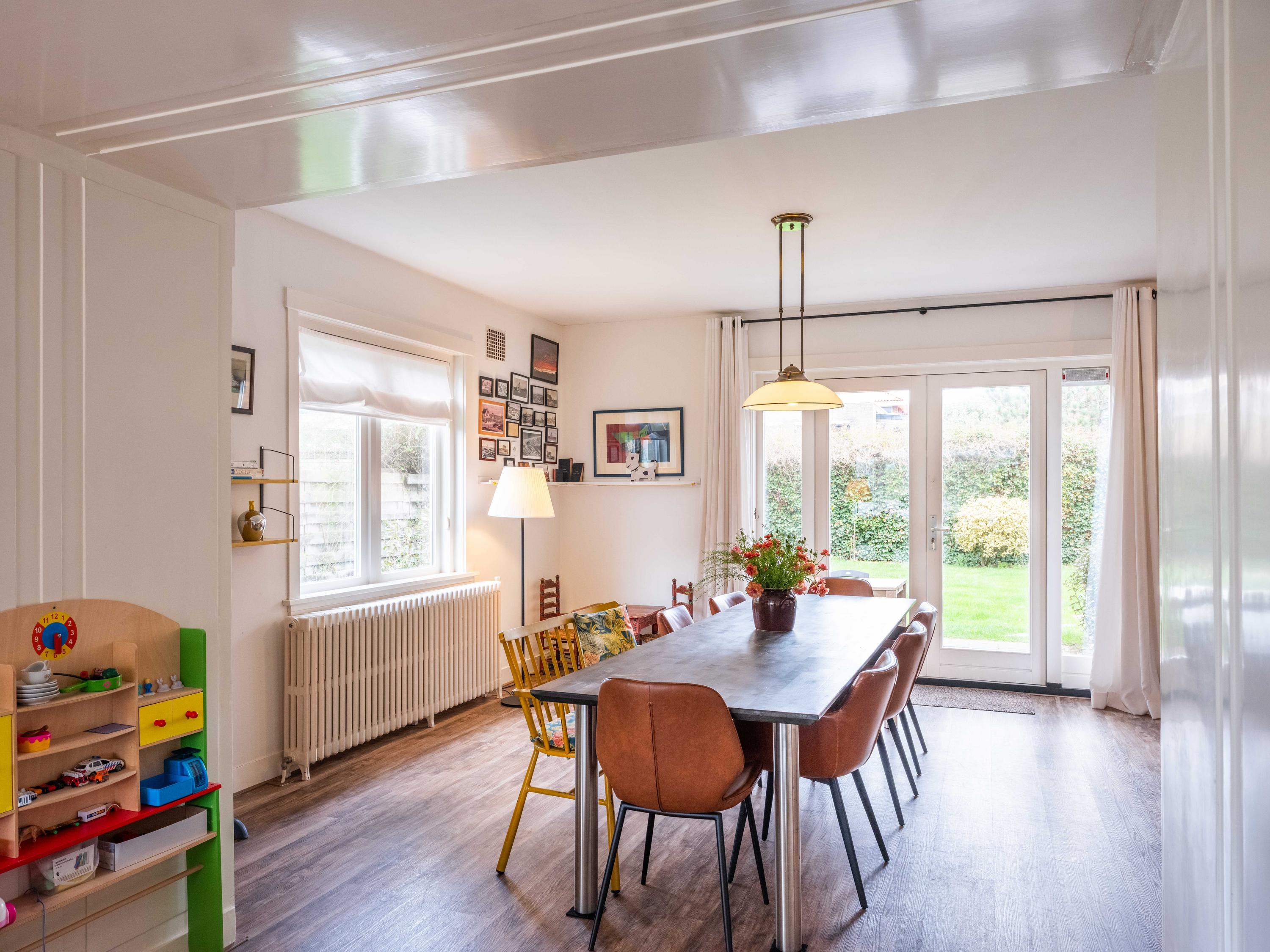 Bij binnenkomst via het tochtportaal valt direct de ruime hal op, met garderobe, meterkast, toilet en toegang tot de kelder. Vanuit de hal zijn zowel de woonkamer als de eetkamer bereikbaar. De woonkamer en-suite is licht en ruim, voorzien van een erker, ingebouwde kasten en een sfeervolle houtkachel. Openslaande deuren geven toegang tot de tuin. De aangrenzende eetkamer heeft eveneens openslaande deuren.
