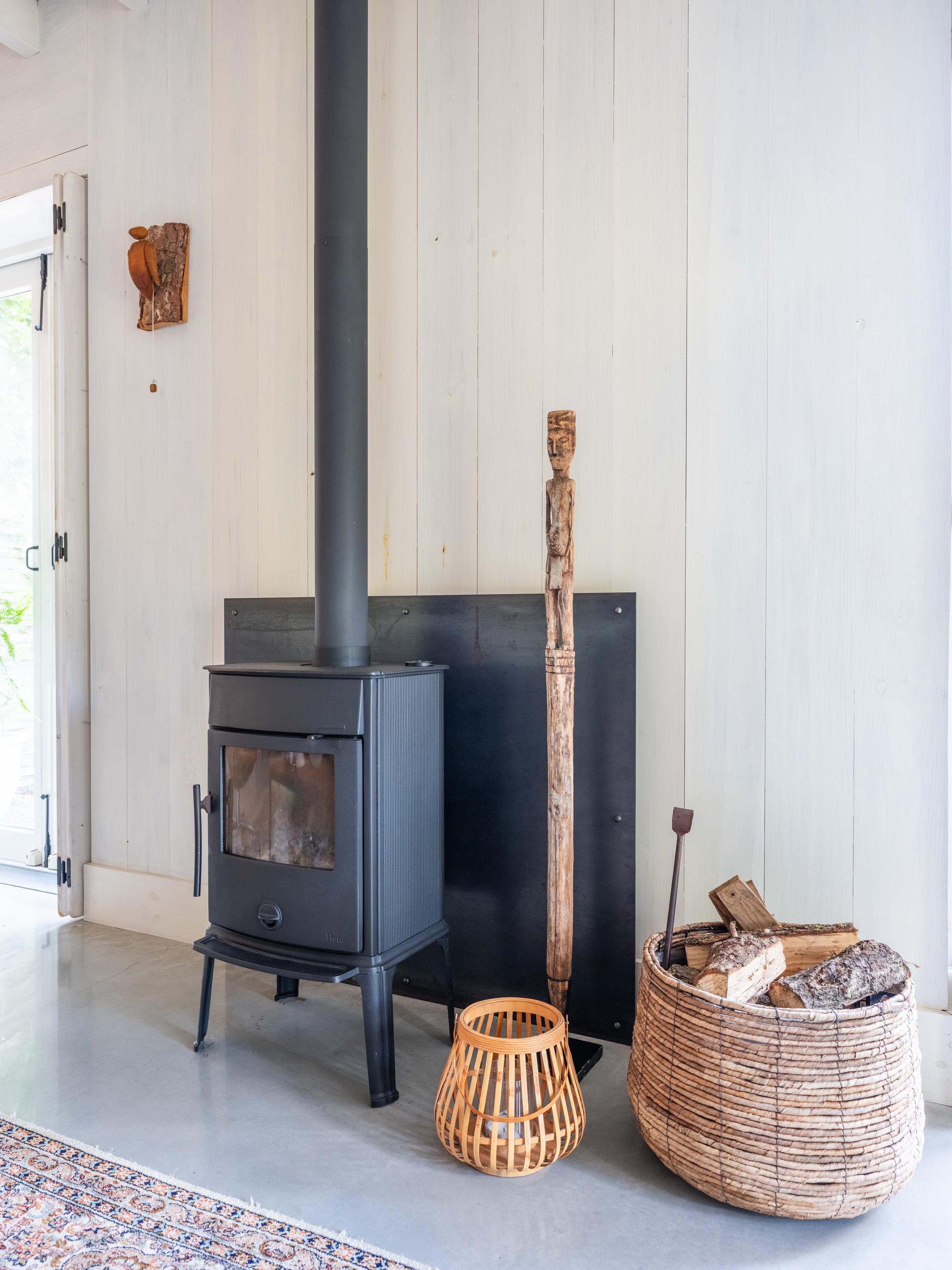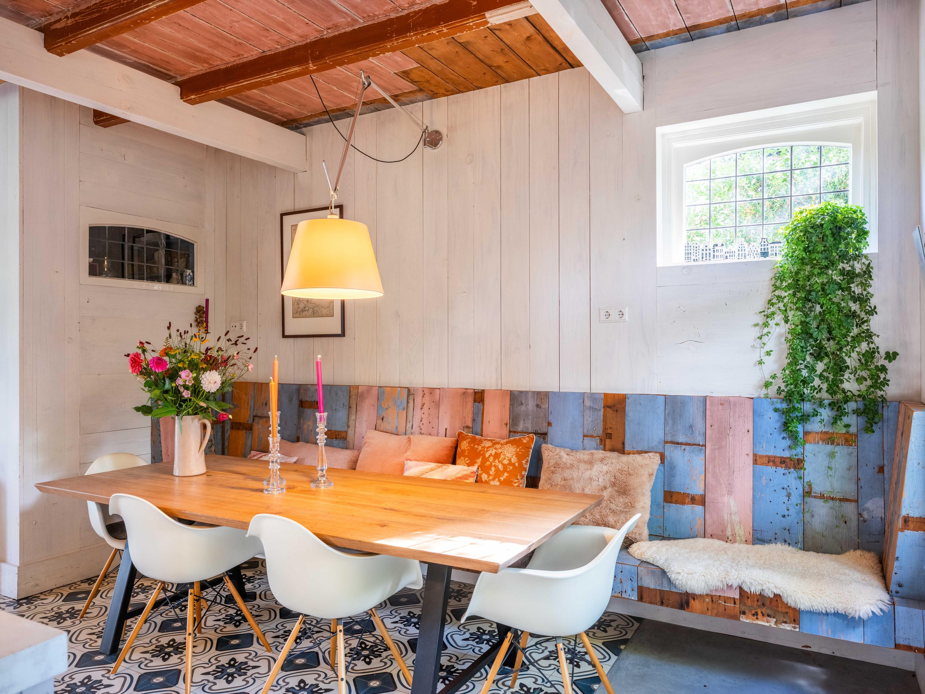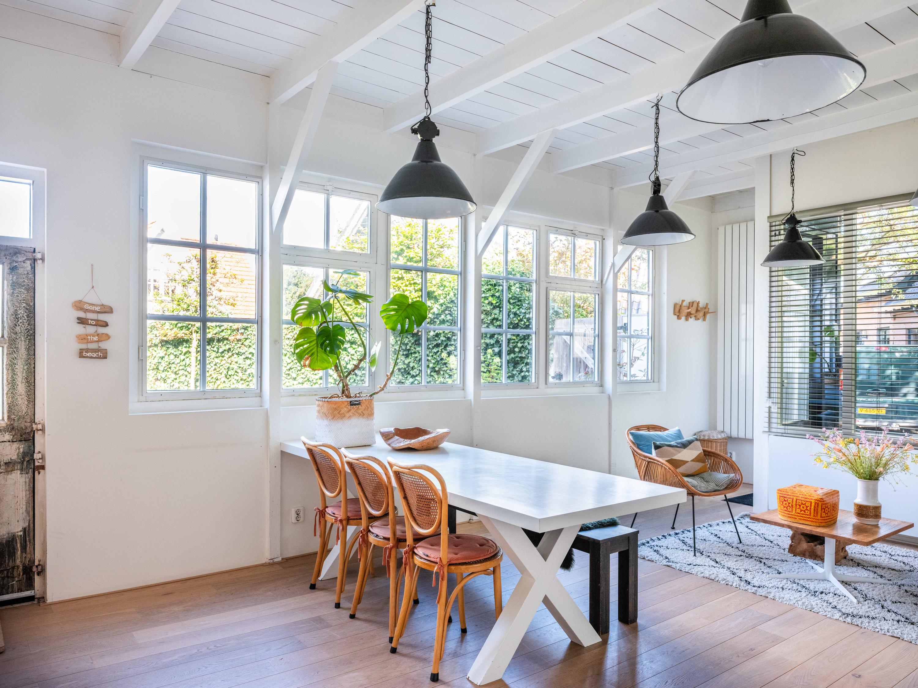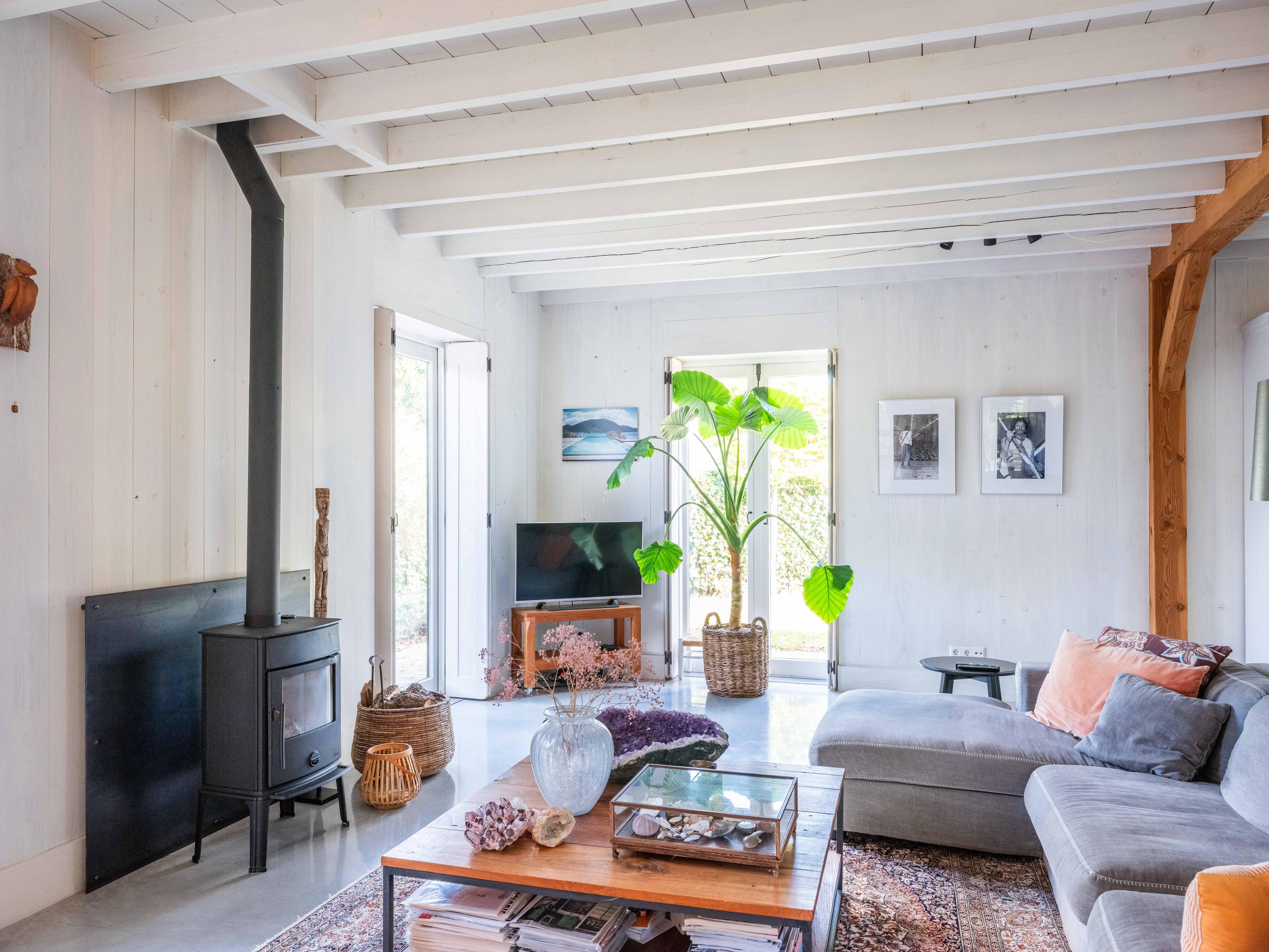 Grenzend aan de keuken bevindt zich de sfeervolle woonkamer met houtkachel, ramen rondom en diverse openslaande deuren naar de tuin. De houten details en de warme uitstraling maken dit een heerlijke plek om te ontspannen, zowel ’s winters bij de haard als ’s zomers met de deuren open naar de tuin met terras.