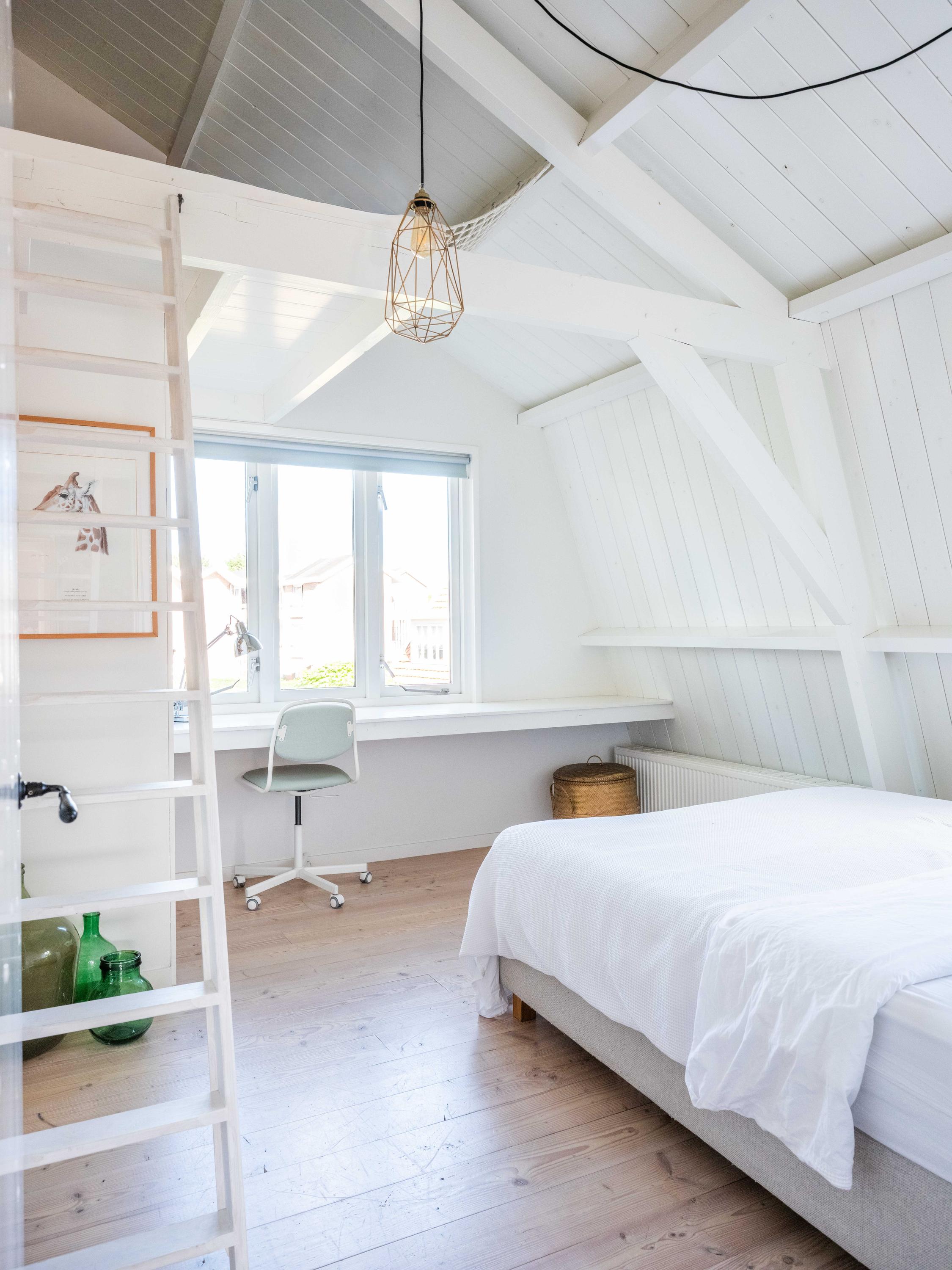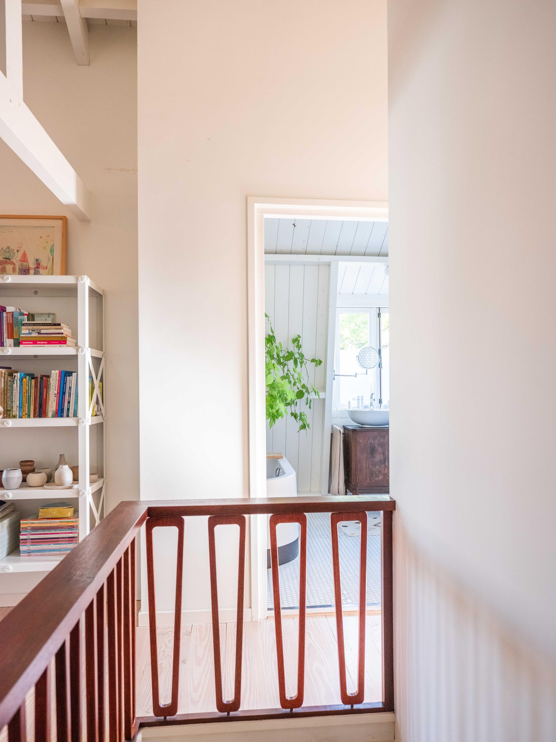 De bovenverdieping beschikt over een ruime overloop met veel hoogte en knieschotten voor extra bergruimte. Er is een royale master bedroom met openslaande deuren naar buiten, een luxe badkamer met dubbele wastafel, inloopdouche, toilet, ligbad en vloerverwarming, een kamer in gebruik als inloopkast en nog twee slaapkamers. Deze zijn opgedeeld door een schuifdeur en beide voorzien van een vide.