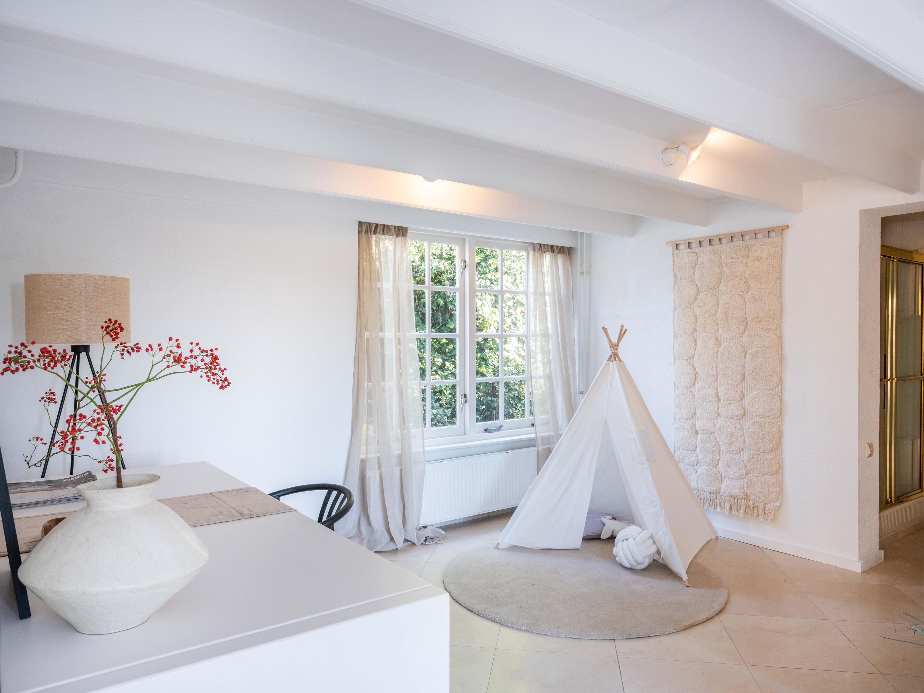 De royale living heeft centraal in de ruimte een gezellige gashaard (voorheen open haard). De ruimte is sfeervol met veel authentieke details: de houten balken in het zicht, een hoog plafond tot aan de nok en ronde glas-in-lood ramen. Links achterin vinden we de open keuken met inbouwapparatuur. Vanuit de keuken komen we in de bijkeuken met de aansluiting voor de wasmachine en wasdroger, de CV-opstelling en een deur naar buiten.