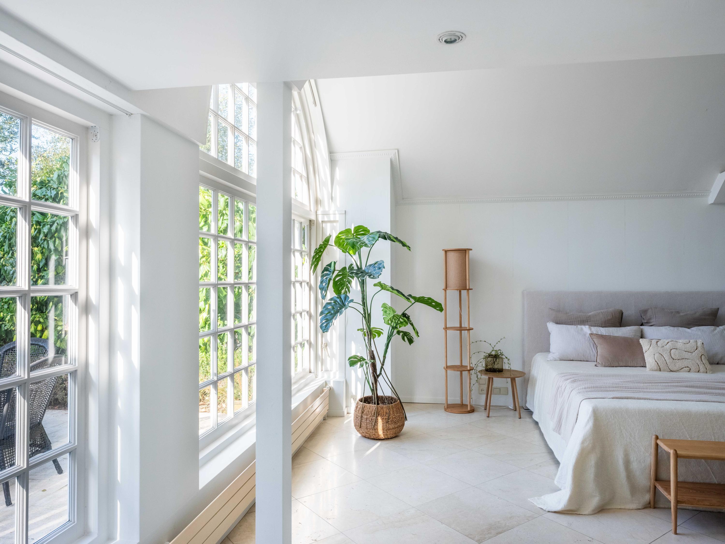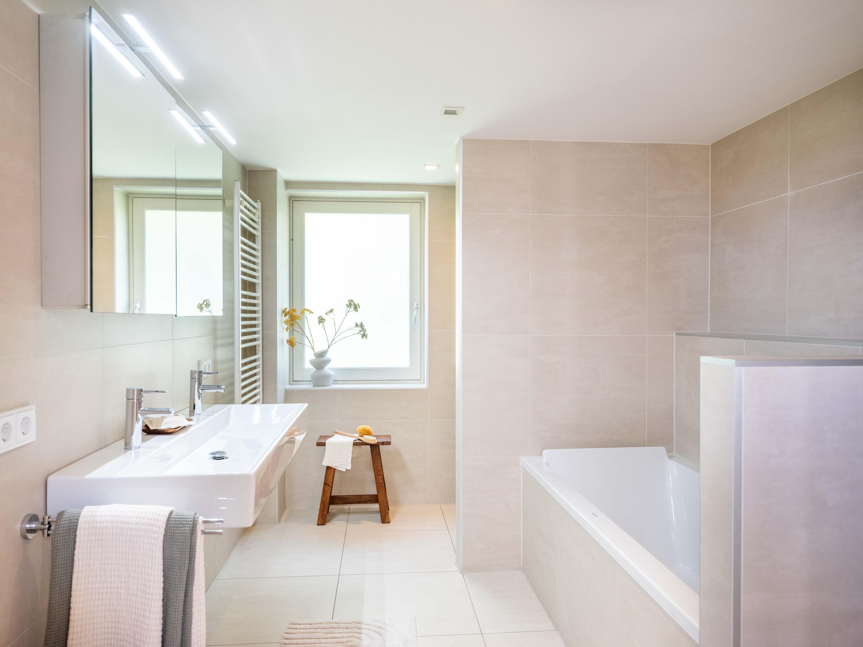 De diepe voortuin en tevens hoofdtuin, brengt ons naar de entree van de woning. Bij binnenkomst betreden we de hal met direct links een slaapkamer met eigen badkamer (gelijkvloers wonen is hier dus mogelijk). De badkamer is uitgerust met een inloopdouche, wastafel, toilet en urinoir. Terug in de hal vinden we achter een muurtje een ruimte die gebruikt kan worden als werk- of speelruimte of met een kleine aanpassing gewijzigd kan worden als slaapkamer. Aansluitend aan deze ruimte zijn het toilet en een extra douchecabine gesitueerd.