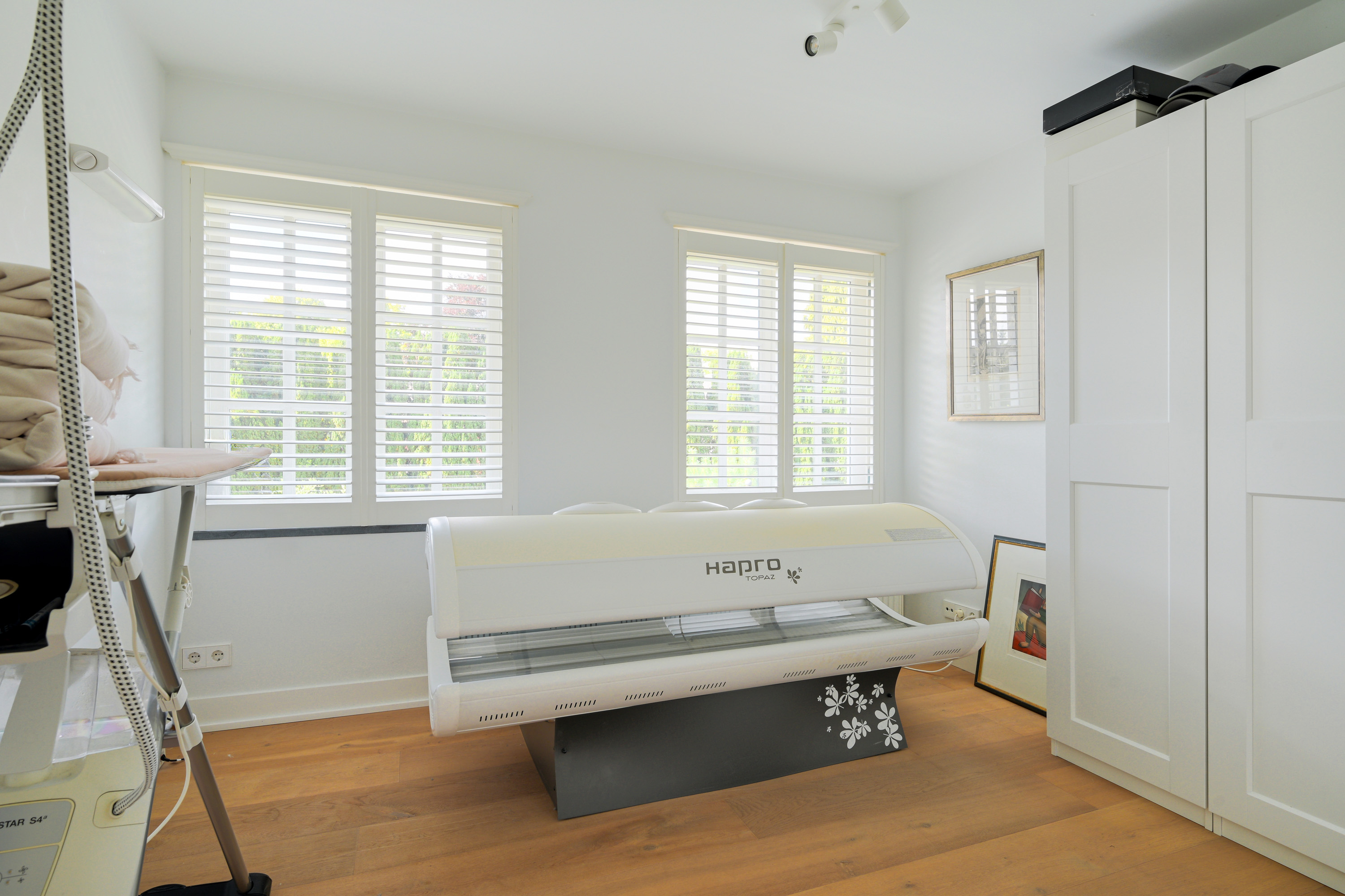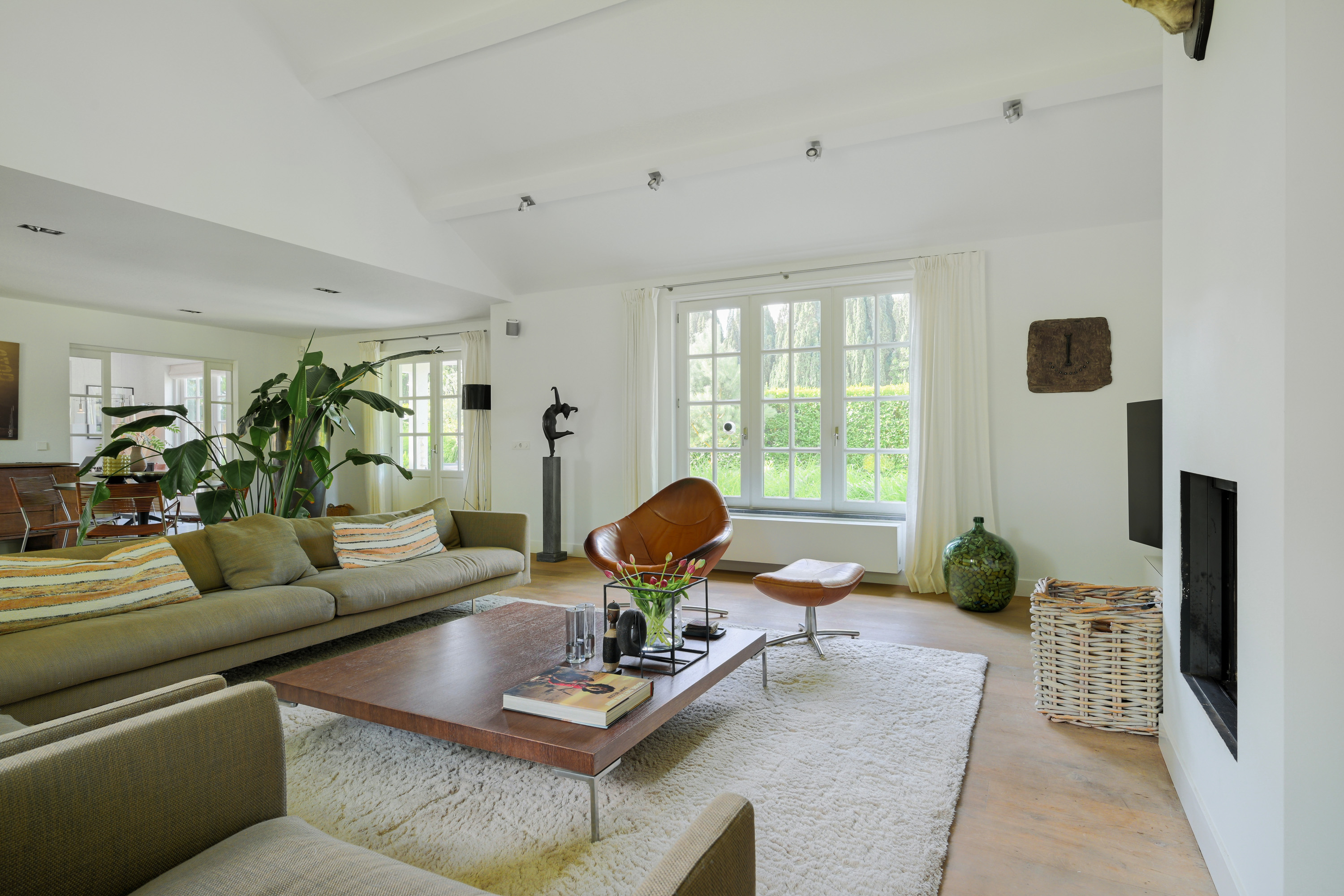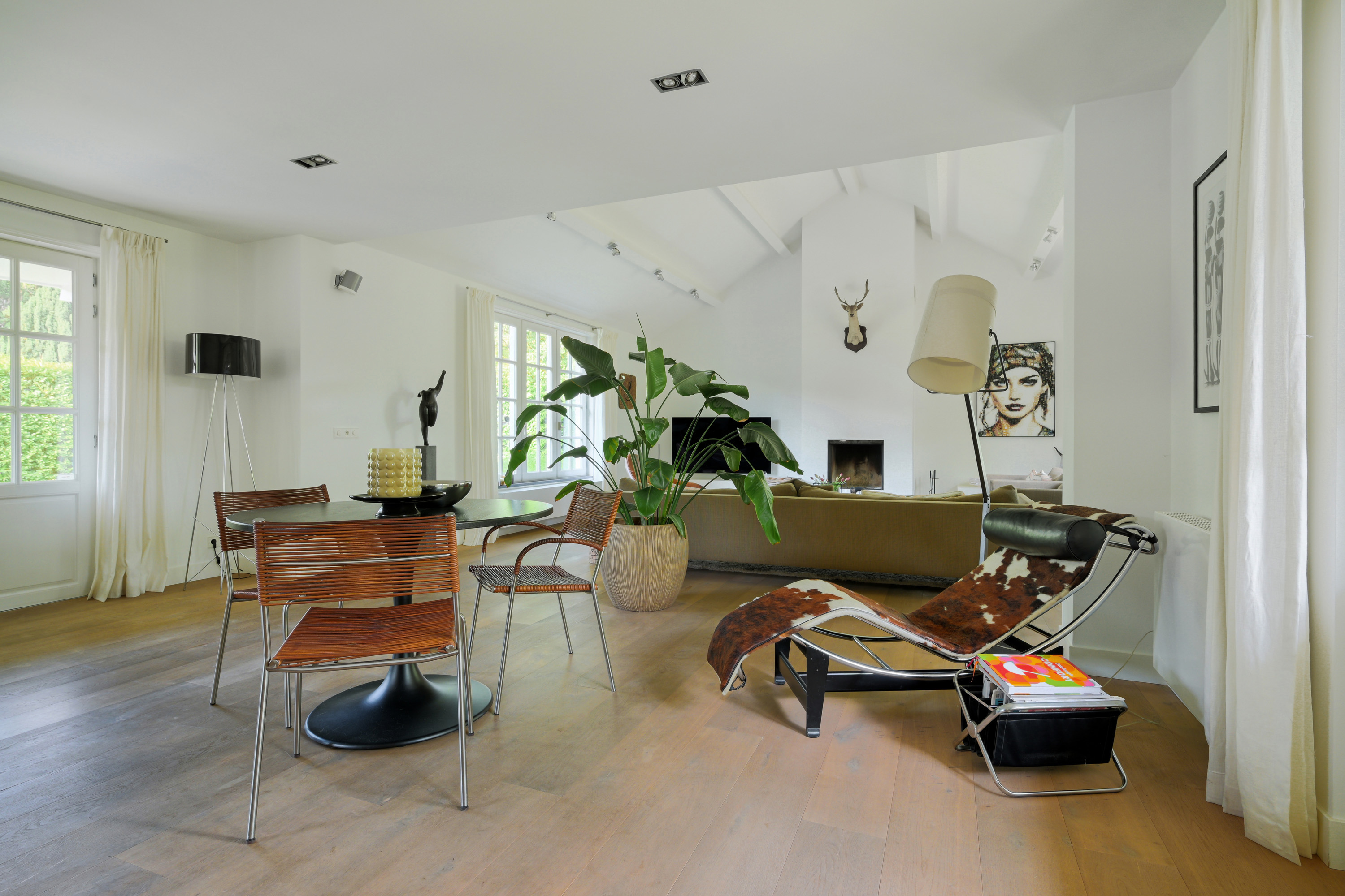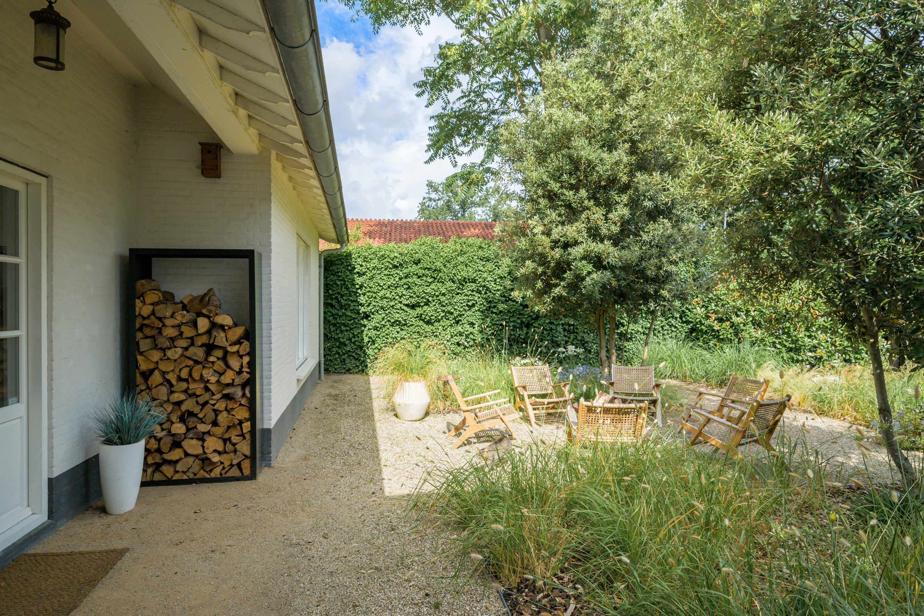kastruimte en een in een meubel geïntegreerde gashaard. Openslaande deuren verbinden deze kamer met de tuin.