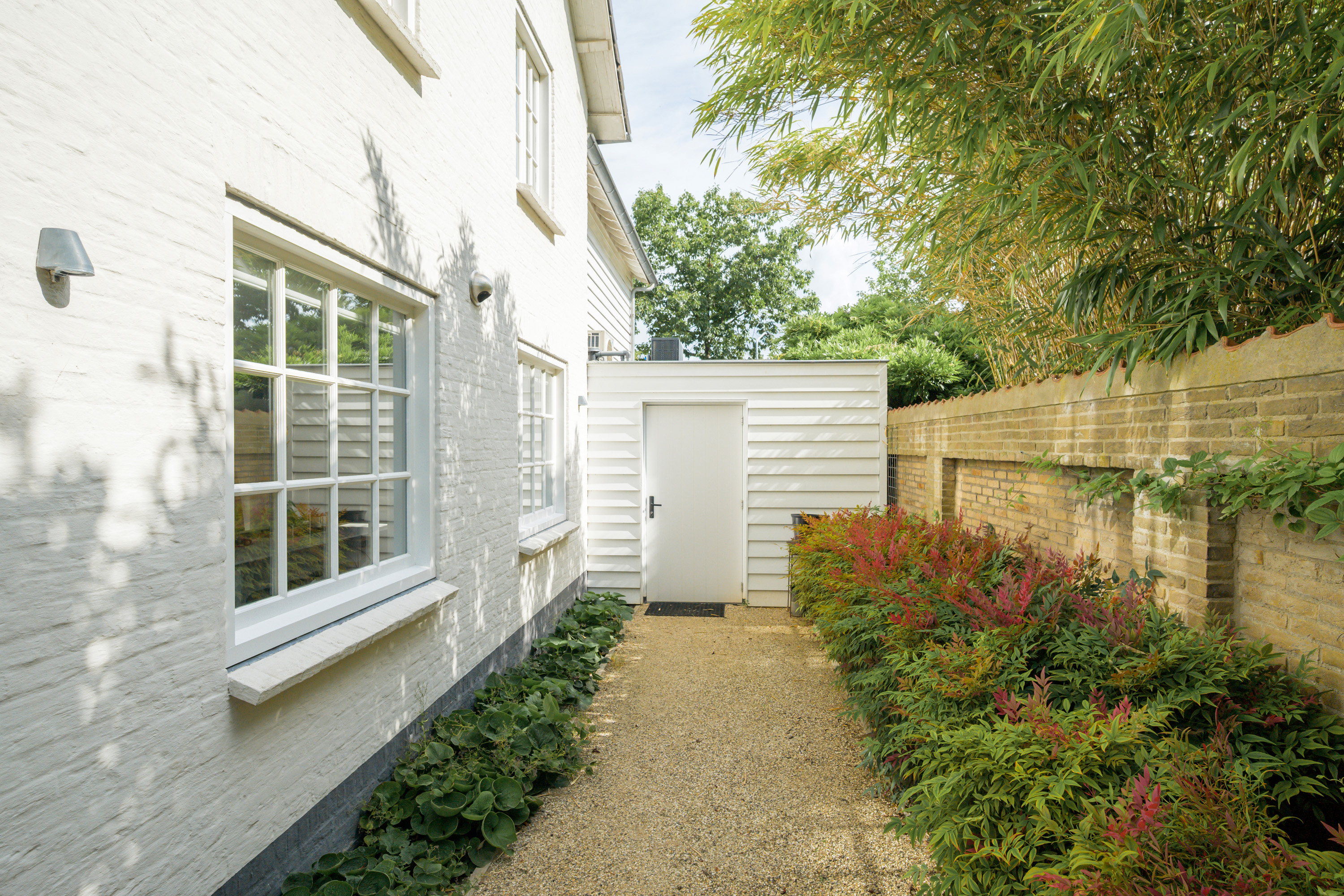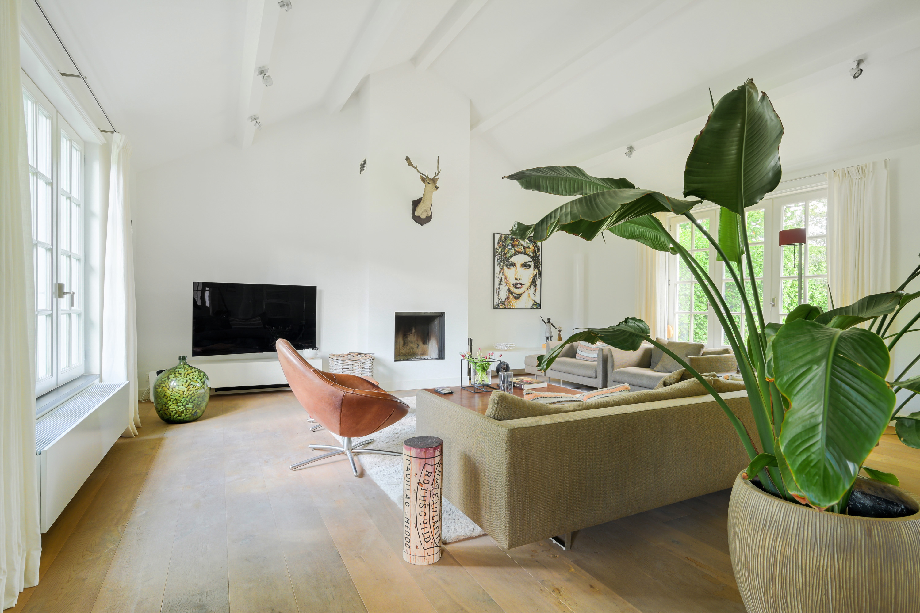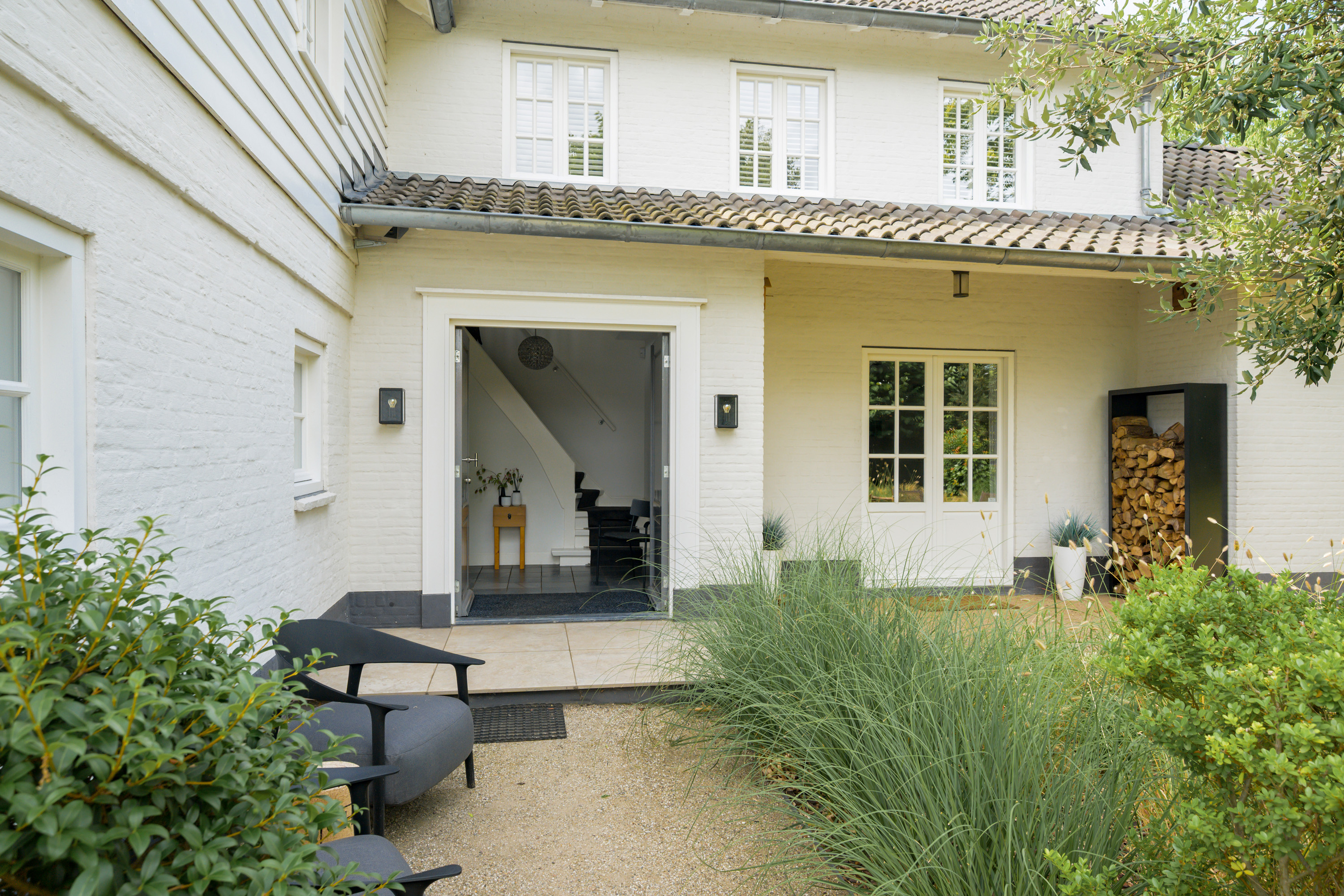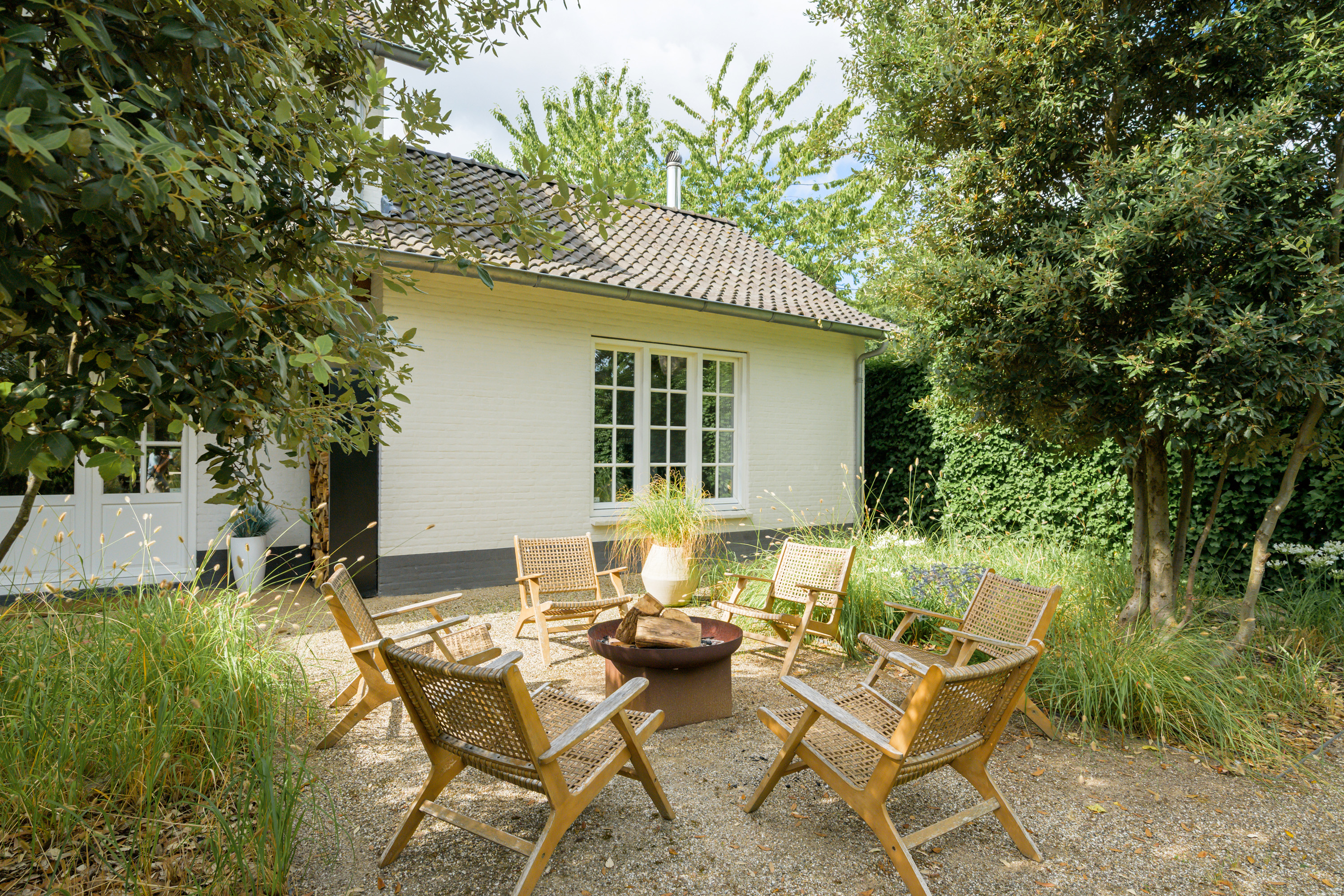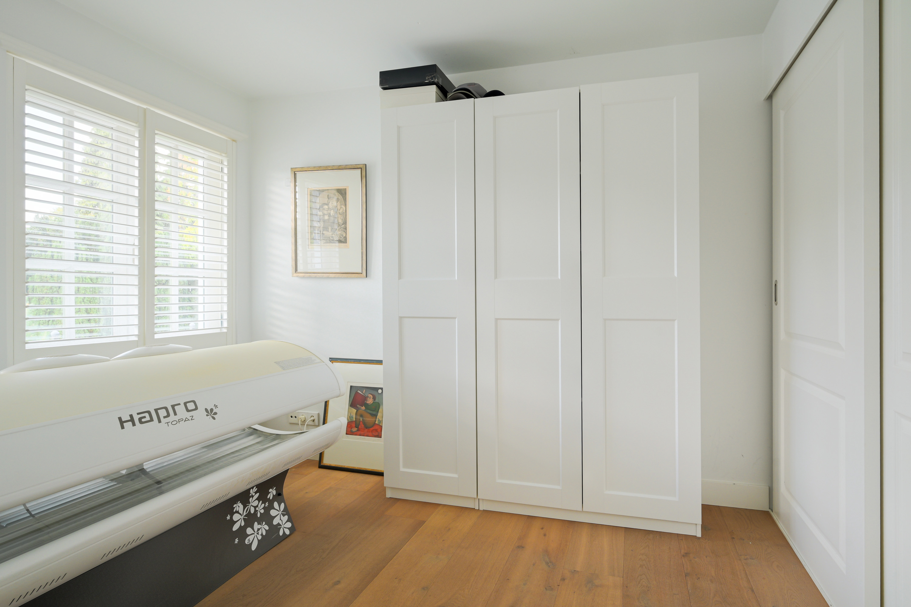 kastruimte en een in een meubel geïntegreerde gashaard. Openslaande deuren verbinden deze kamer met de tuin.