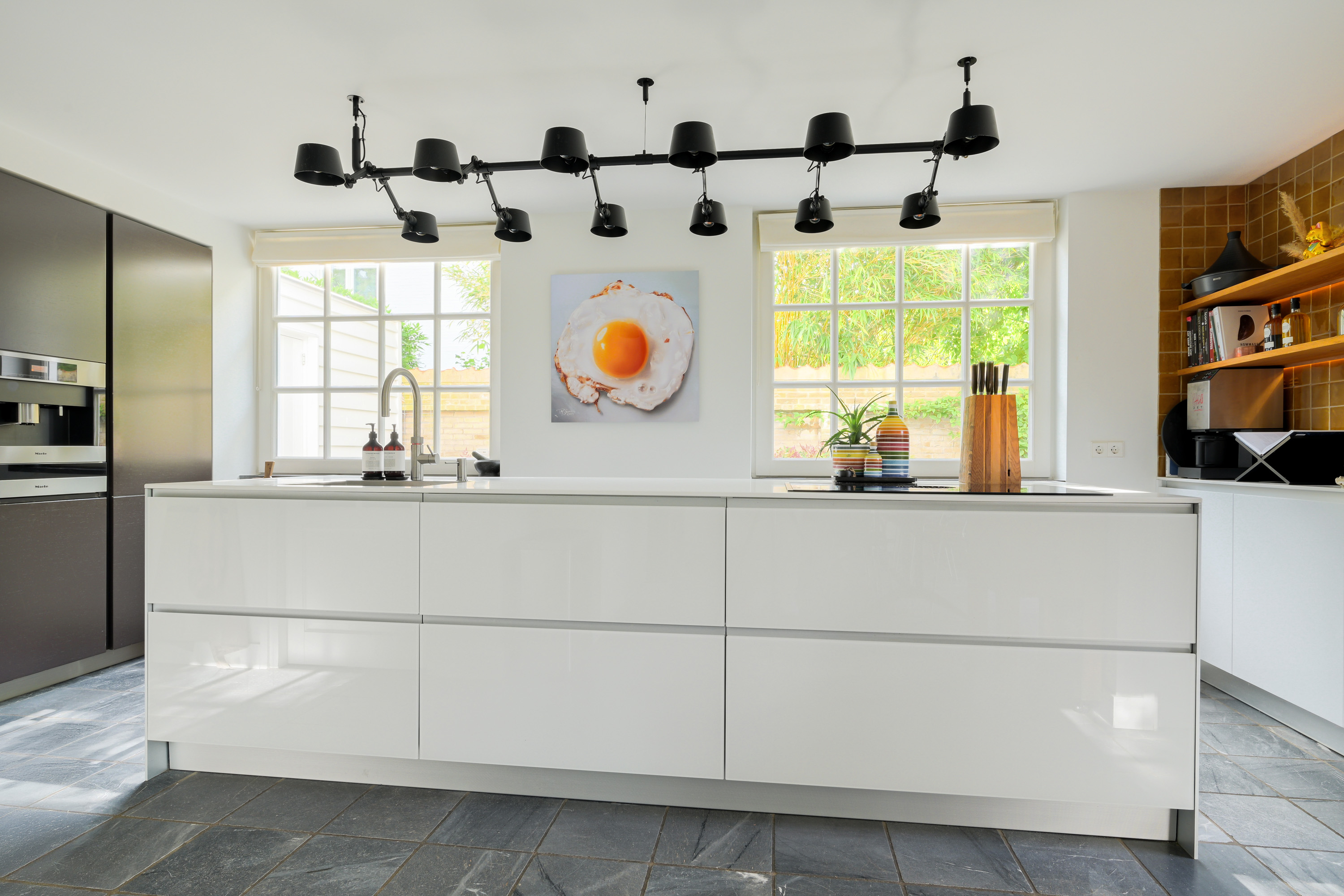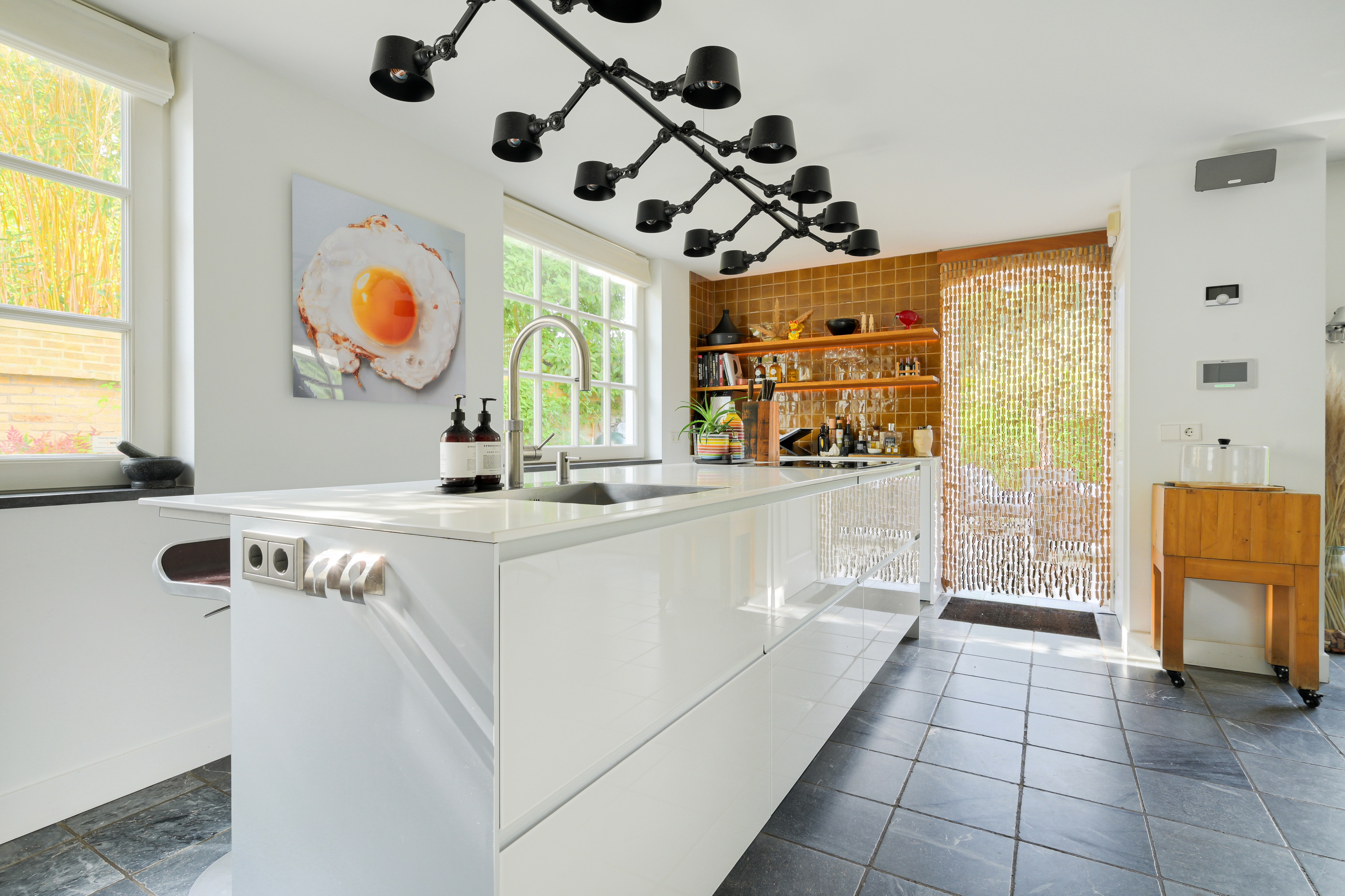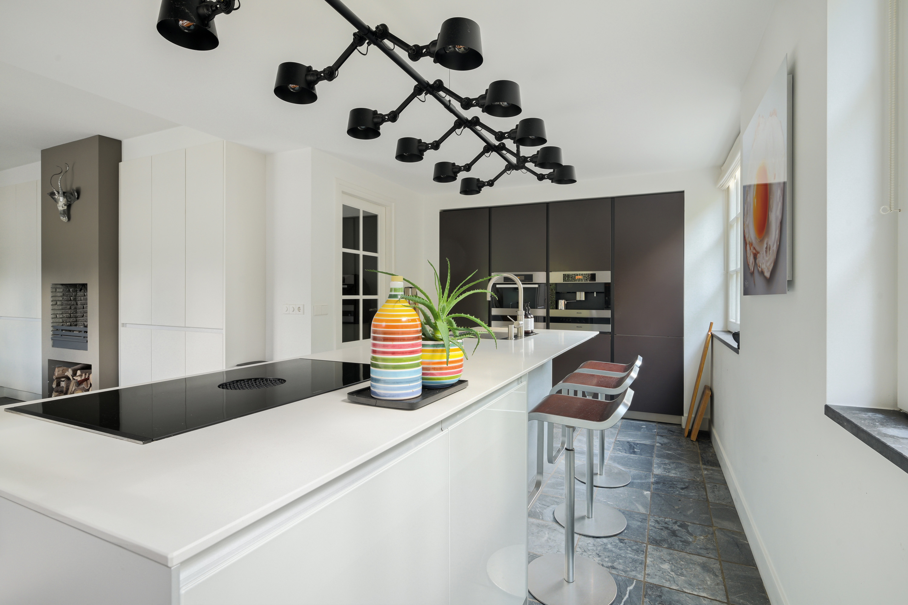 Keuken met luxe inrichting van het merk Valcucine, bestaand uit een eiland met composiet blad met RVS spoelbak, combi- Quooker, BORA- inductiekookplaat met afzuiger (geïntegreerd), een eetbar en diverse kasten en lades. Wandmeubel met 2 koelkasten, een vriezer, espressomachine, combi-oven en 2 warmhoudlades en een vaatwasser. Aan de andere zijde is een meubel/koffiecorner geplaatst met klein composiet werkblad en kastruimte. Een loopdeur biedt toegang tot de tuin.