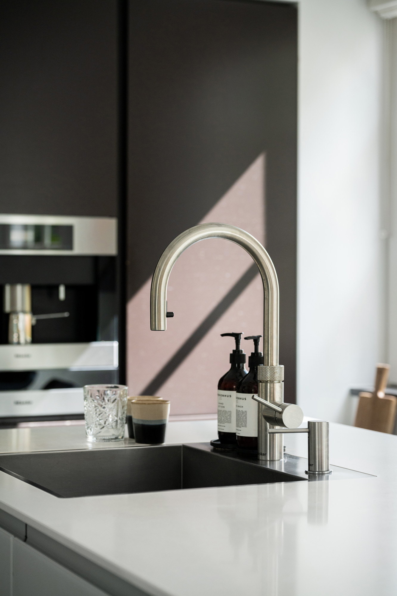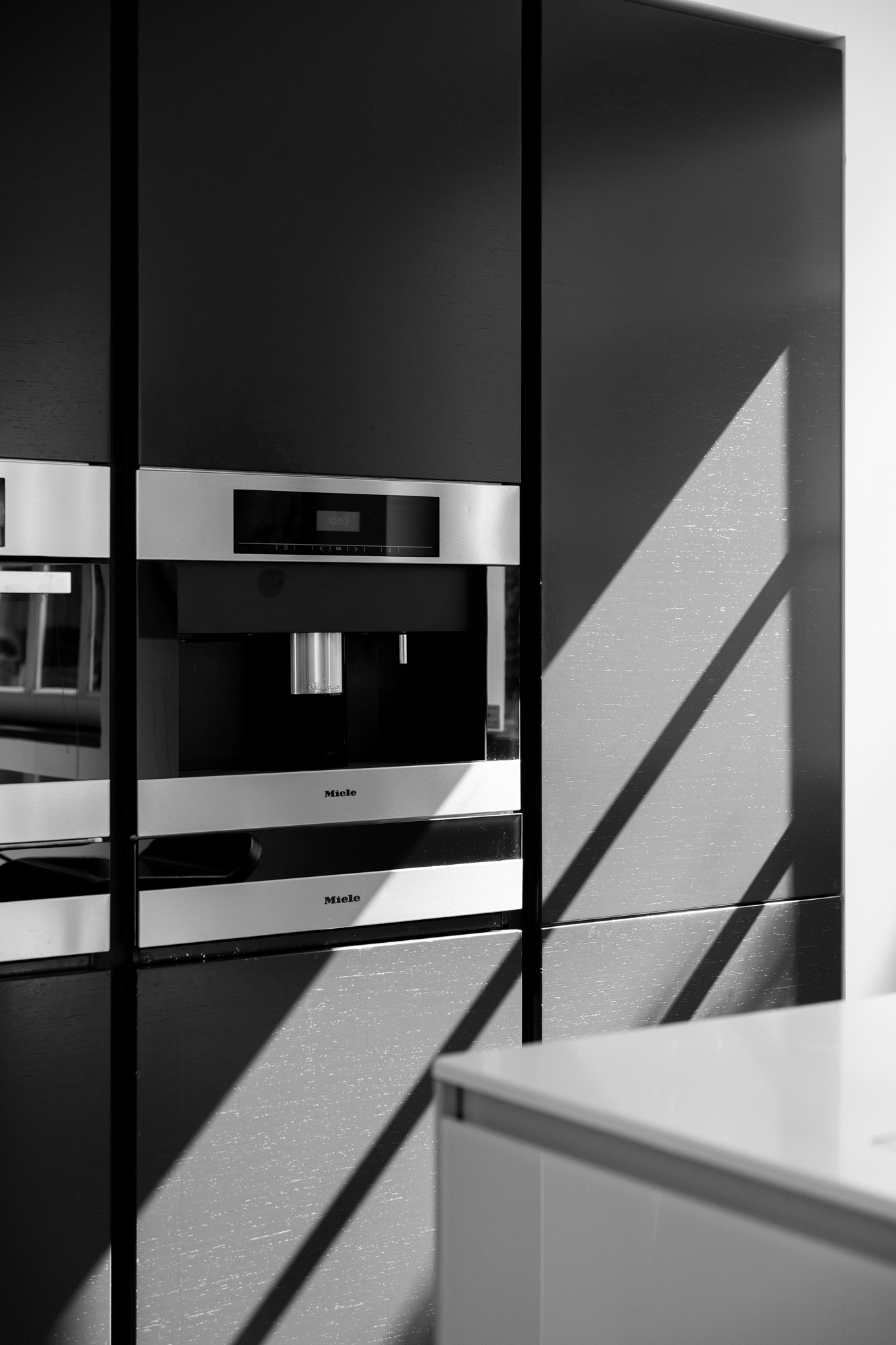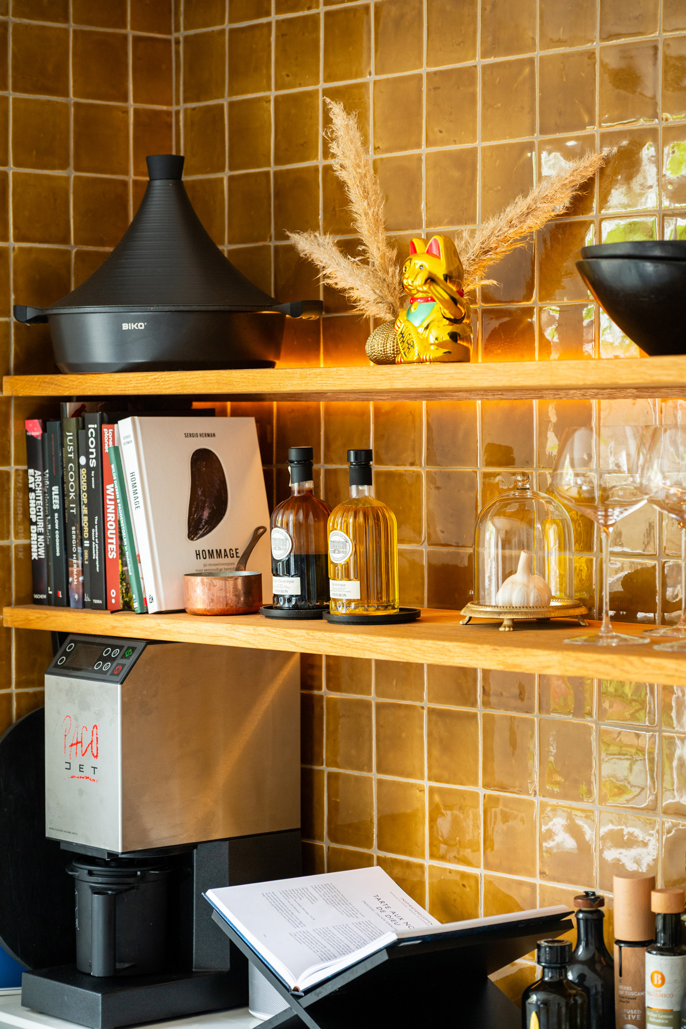 Keuken met luxe inrichting van het merk Valcucine, bestaand uit een eiland met composiet blad met RVS spoelbak, combi- Quooker, BORA- inductiekookplaat met afzuiger (geïntegreerd), een eetbar en diverse kasten en lades. Wandmeubel met 2 koelkasten, een vriezer, espressomachine, combi-oven en 2 warmhoudlades en een vaatwasser. Aan de andere zijde is een meubel/koffiecorner geplaatst met klein composiet werkblad en kastruimte. Een loopdeur biedt toegang tot de tuin.