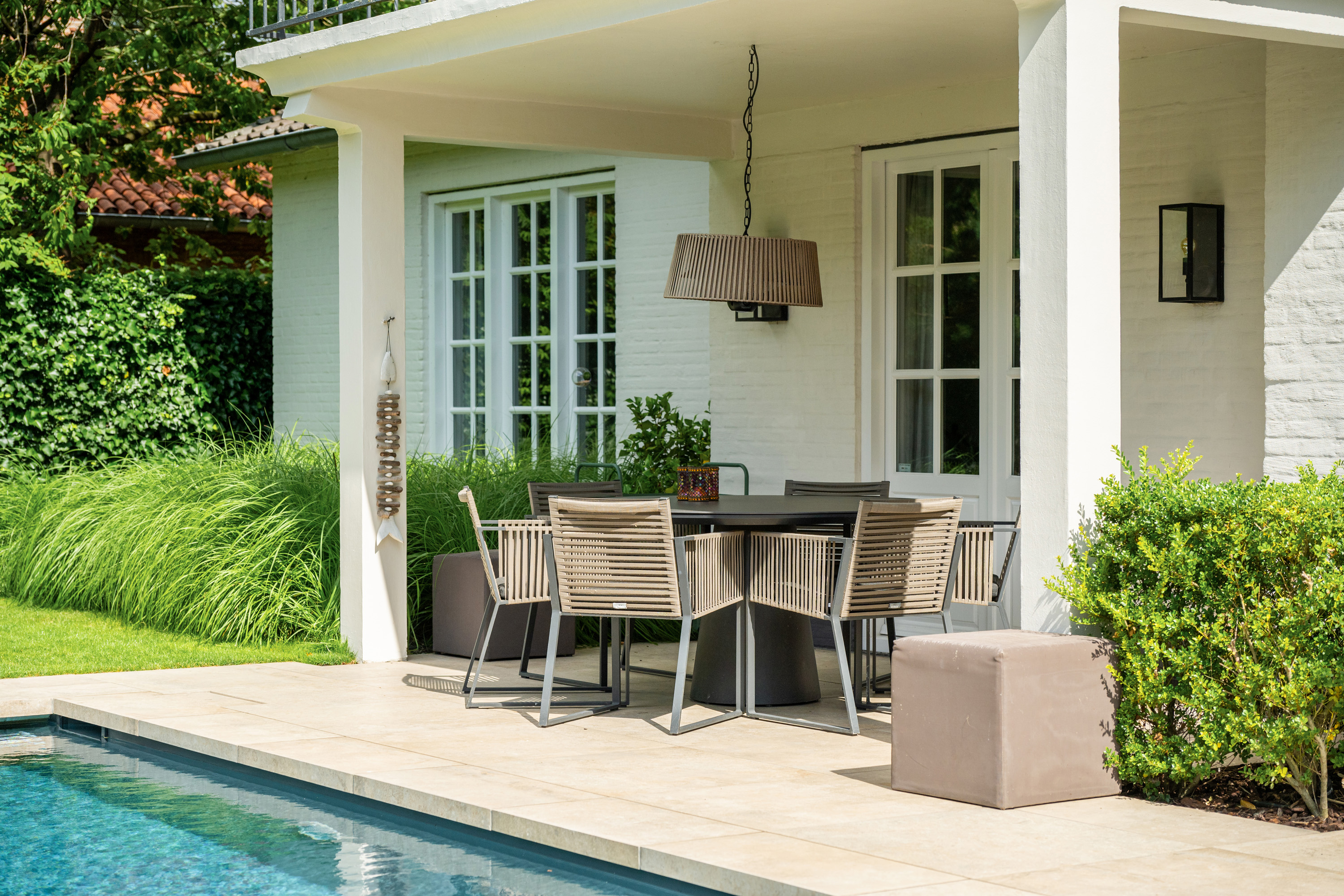 De tuin is ontworpen door Ronnie Renette, Arterior en voorzien van een gazon, een modern, strak zwembad met roldek/solardek en warmtepomp, diverse terrassen. In de borders tref je variërende beplanting, siergrassen etc. Ook