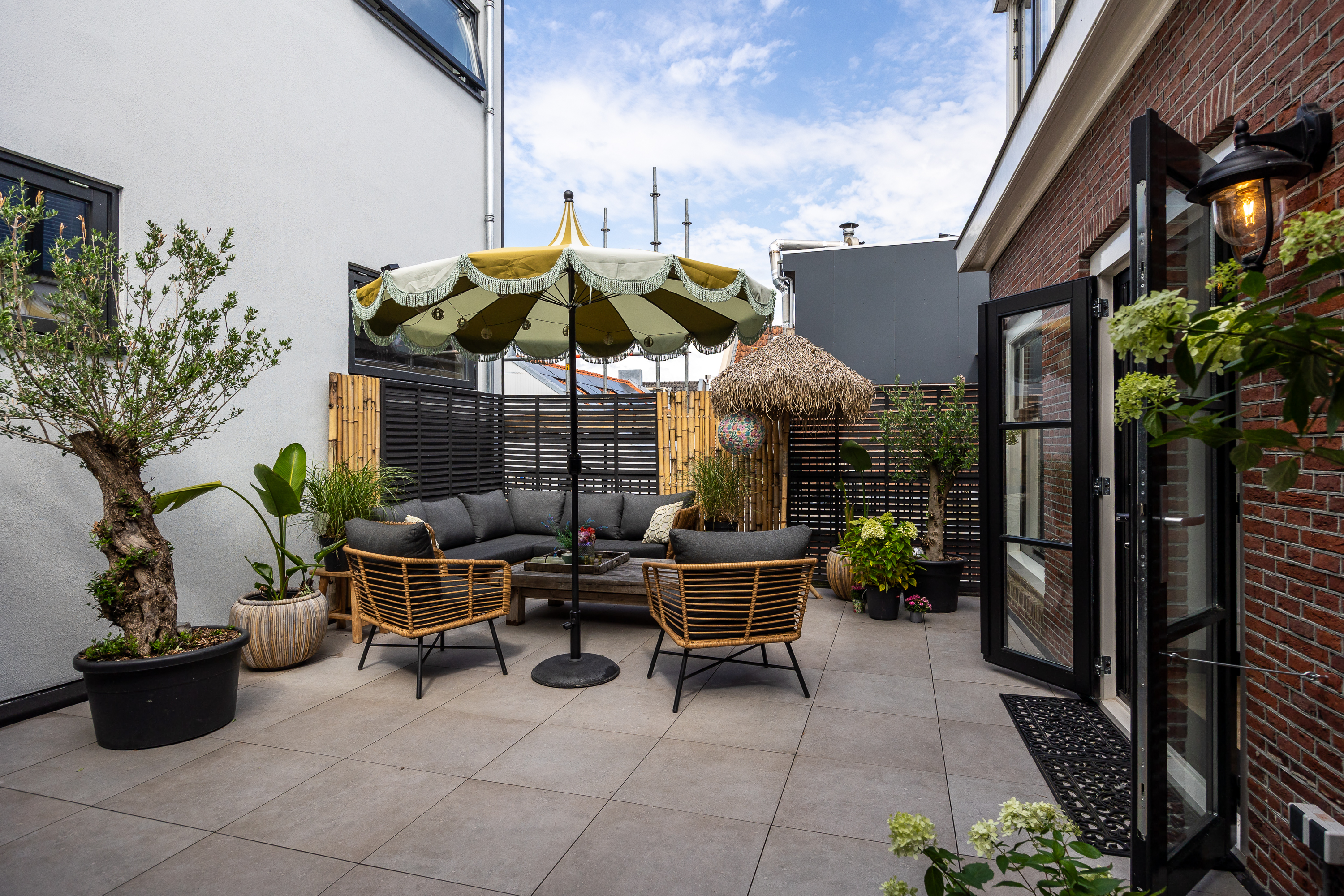 Via een tussenruimte, voorzien van inbouwkasten en plek voor een extra koelkast, stap je zó dakterras op. Dit ruime zonnige terras is volledig betegeld en voorzien van een sfeervolle overkapping, een vaste bank en op maat gemaakte tafel. Hier ervaar je volledige rust en privacy, midden in het centrum. Een heerlijk buitenverblijf, perfect voor diners, borrels of een kop koffie in de ochtendzon.