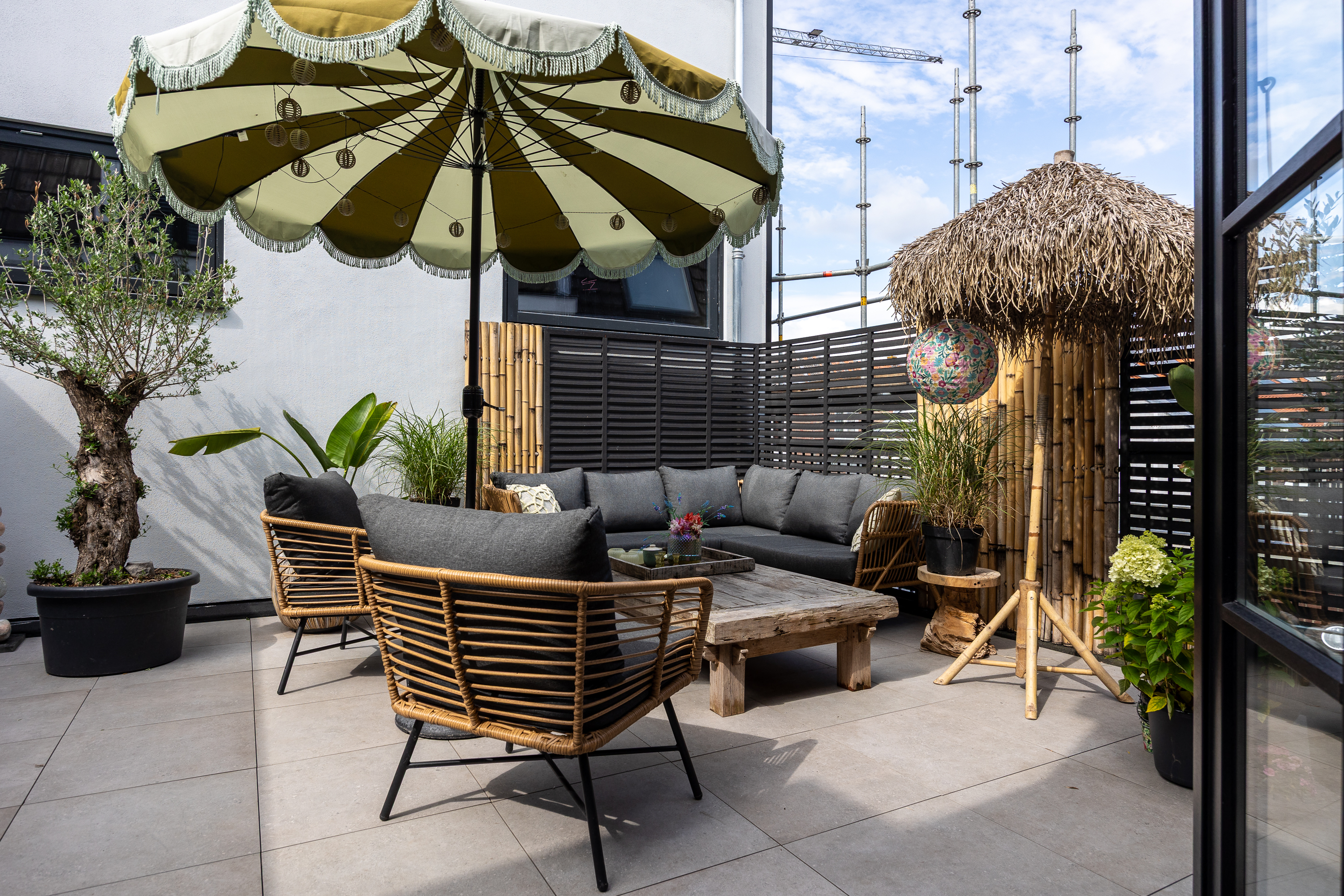 - Zonnig dakterras op het noorden met veel privacy, overkapping, vaste bank en op maat gemaakte tafel