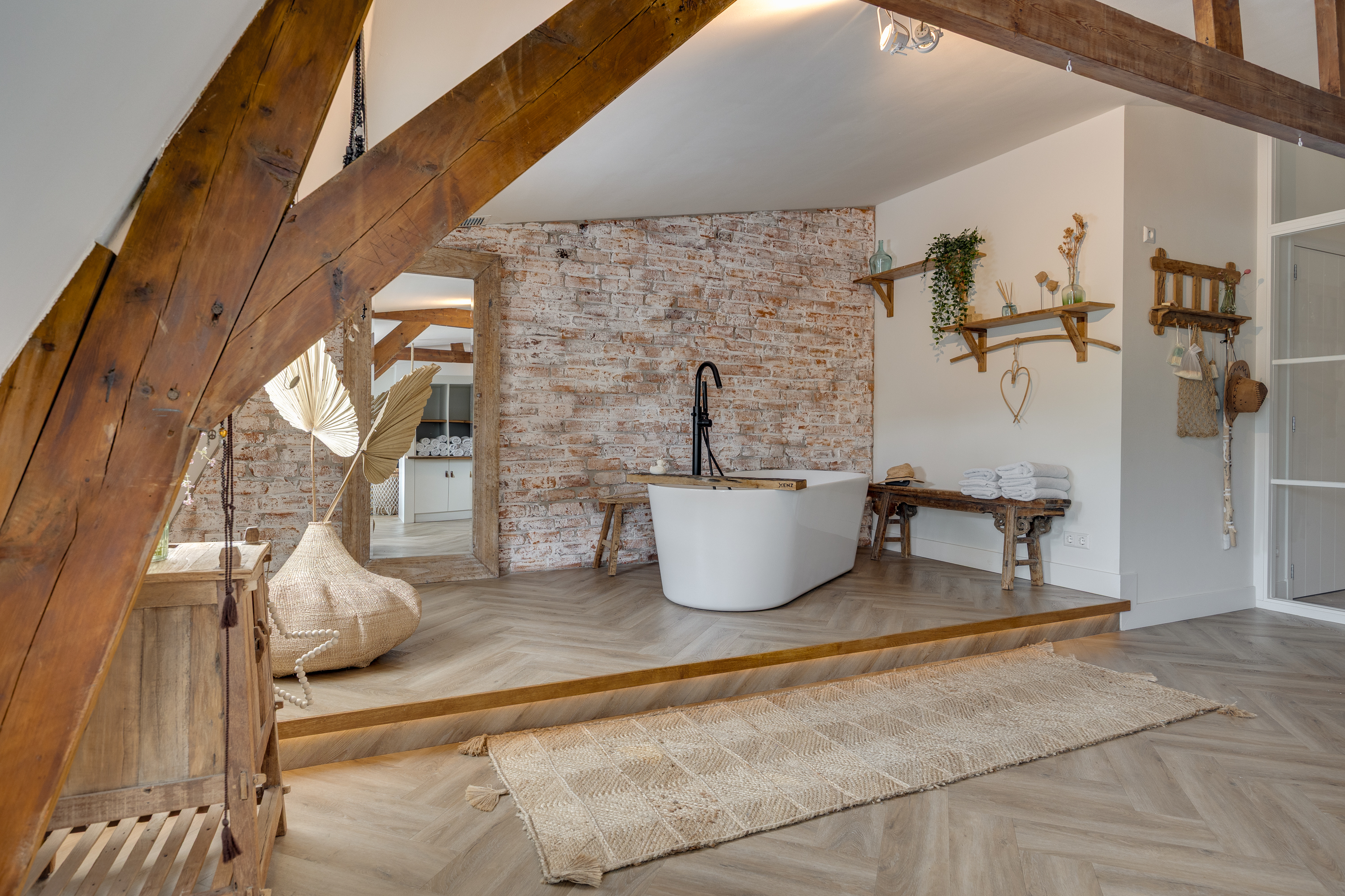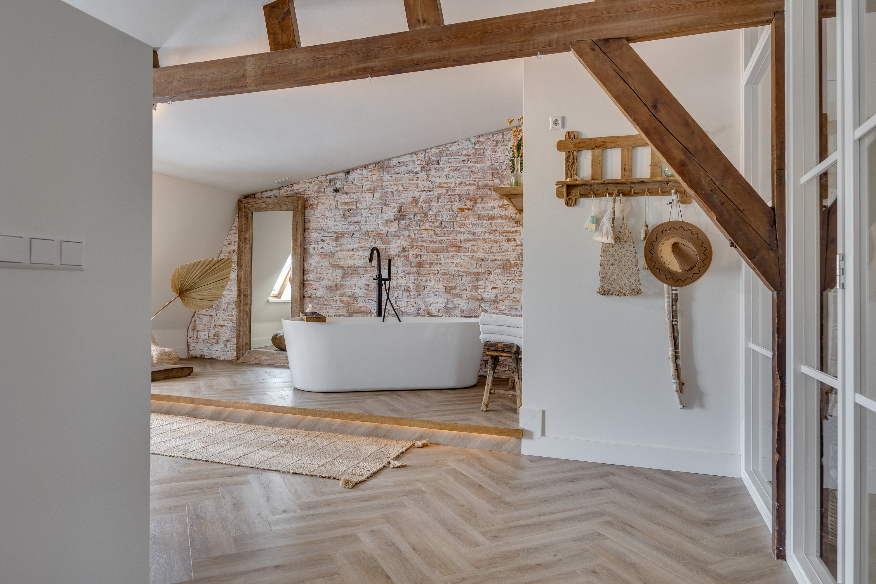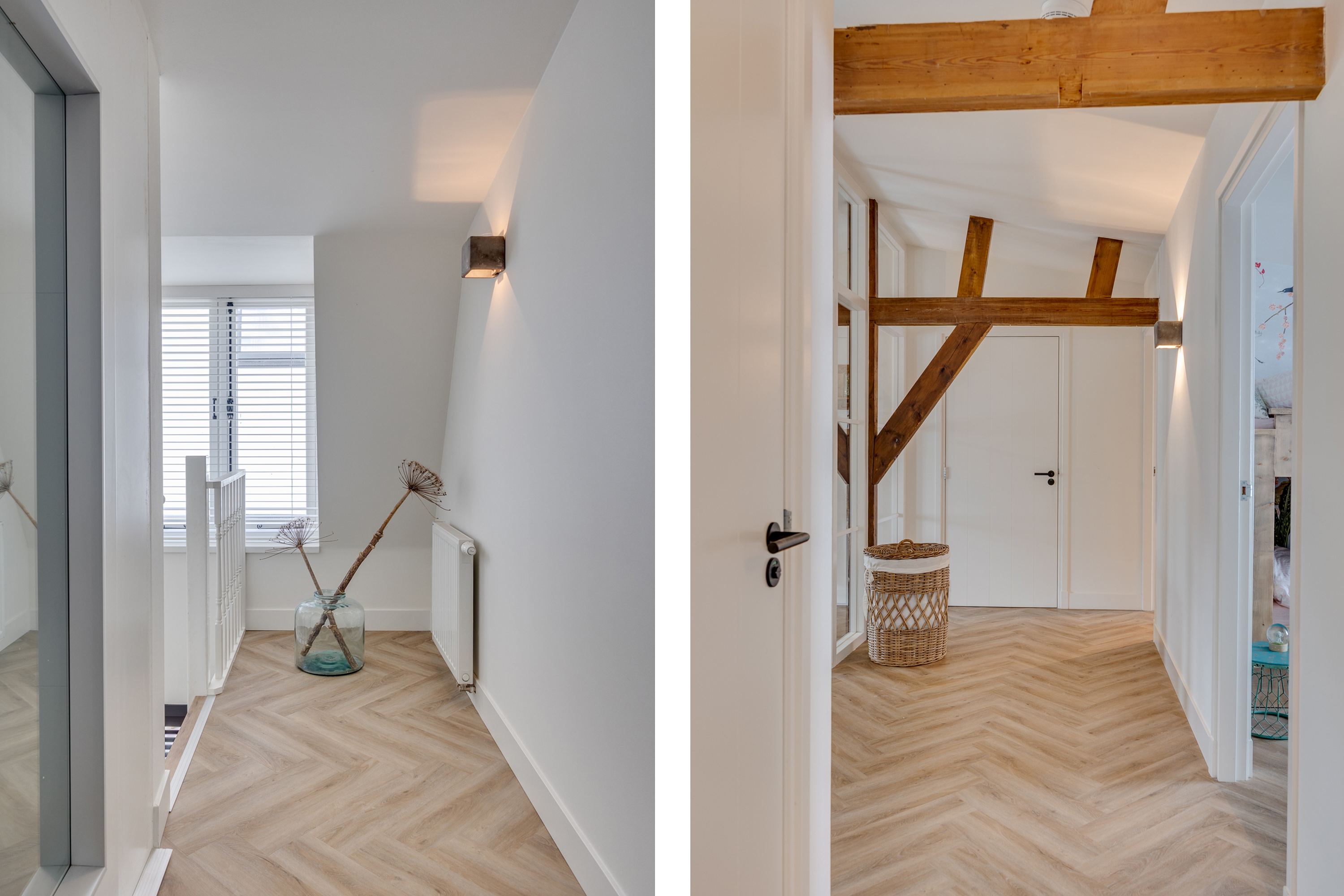 Daarnaast is er een tweede badkamer met inloopdouche, wastafelmeubel, toilet en ruimte voor wasmachine en droger. Een extra separaat toilet bevindt zich op de overloop. Authentieke houten balken zijn in het zicht gebleven en zorgen voor een sfeervol contrast met de moderne afwerking.