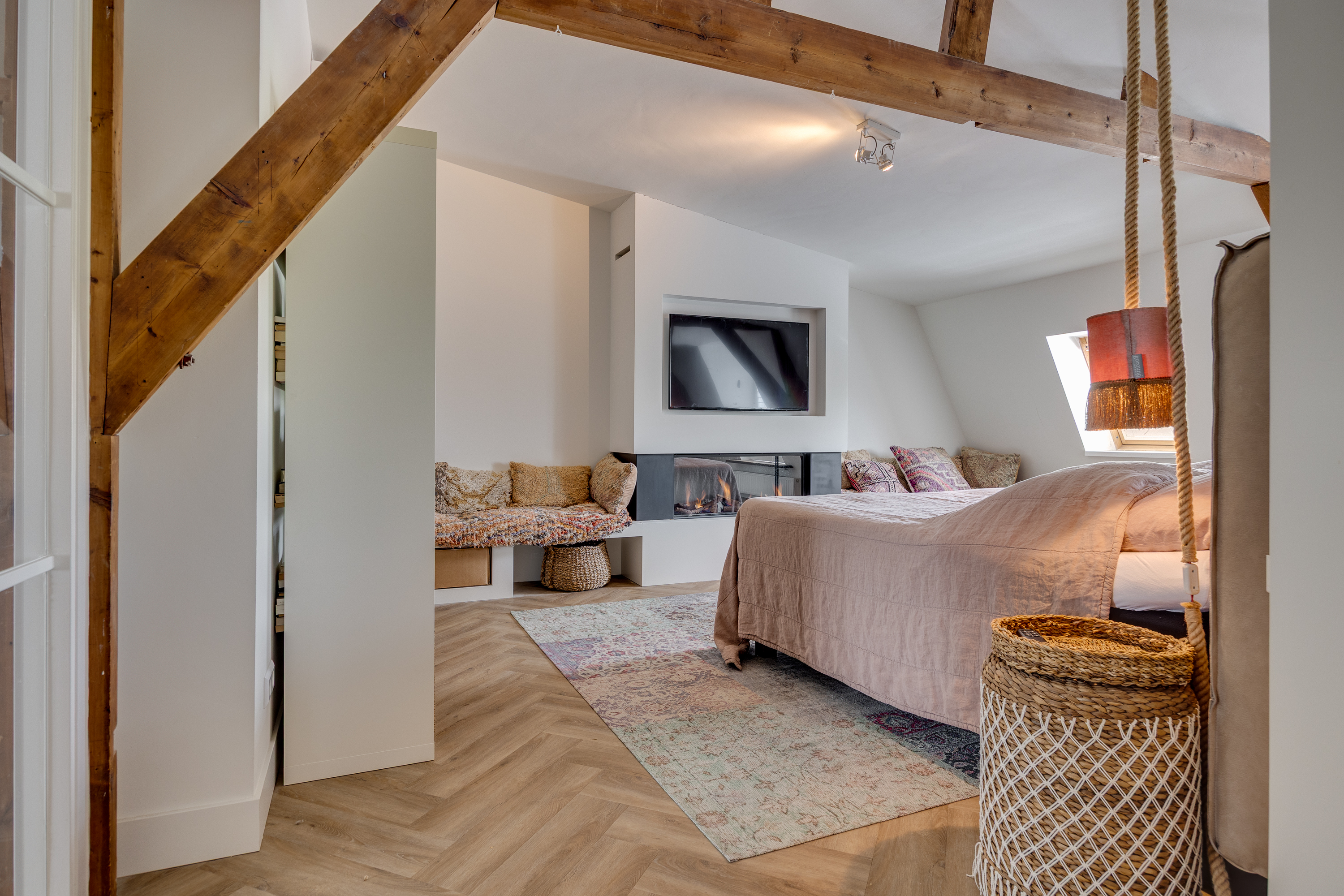De ruimtelijke woonkamer aan de voorzijde is een ware blikvanger, met grote raampartijen die zorgen voor een overvloed aan natuurlijk licht en een prachtig uitzicht bieden op de levendige Kerkbrink. Wat direct opvalt, is de stijlvolle PVC-vloer die is doorgelegd over de gehele woonverdieping. Deze vloer combineert een warme, rustgevende uitstraling met praktische eigenschappen als duurzaamheid en onderhoudsgemak. Hij vormt de perfecte basis voor elk interieur. De moderne gashaard creëert een gezellige ambiance, ideaal voor sfeervolle avonden. Daarnaast zorgt de aanwezige airconditioning ervoor dat het binnenklimaat het hele jaar door aangenaam blijft. Alles aan deze woonlaag ademt comfort, stijl en luxe.