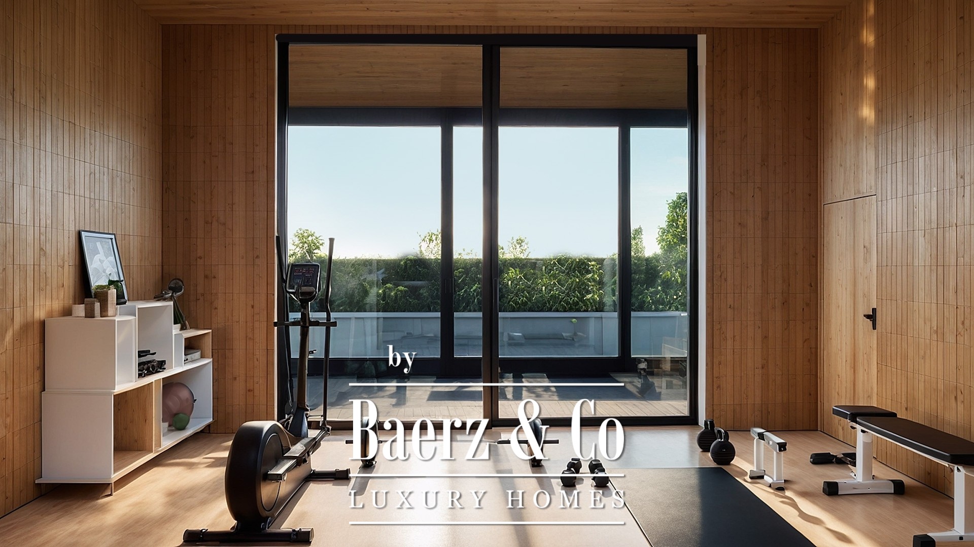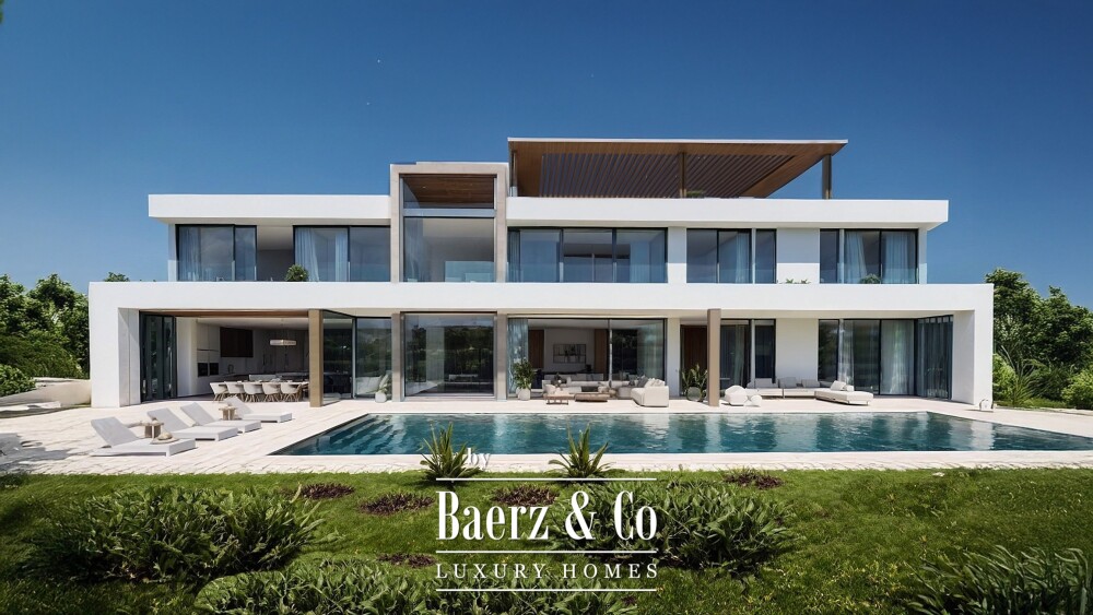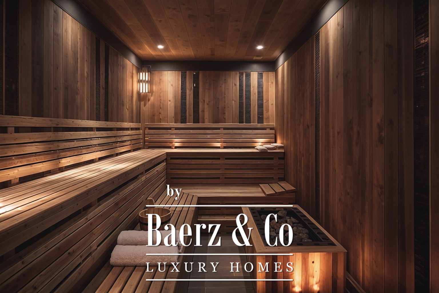 Elk niveau is ontworpen met het oog op vloeiende overgangen en discretie. Het souterrain beschikt over een garage voor maximaal vier auto's, een complete badkamer met sauna en een multifunctionele ruimte geschikt voor een thuisbioscoop of fitnessruimte. De begane grond herbergt een dubbel hoge woonkamer die rechtstreeks overgaat in de zonnige tuin en het zwembad, met een open keuken en twee gastensuites die direct toegang bieden tot buiten. Op de eerste verdieping bevinden zich twee extra tweepersoons slaapkamers en een fitnessruimte, naast de 34 m² grote master suite die vrij uitzicht biedt over de boomtoppen. De zolderverdieping beschikt over een panoramisch dakterras met zeezicht en een zwembad-jacuzzi op het dak, ideaal om te ontspannen of privé bijeenkomsten te organiseren.