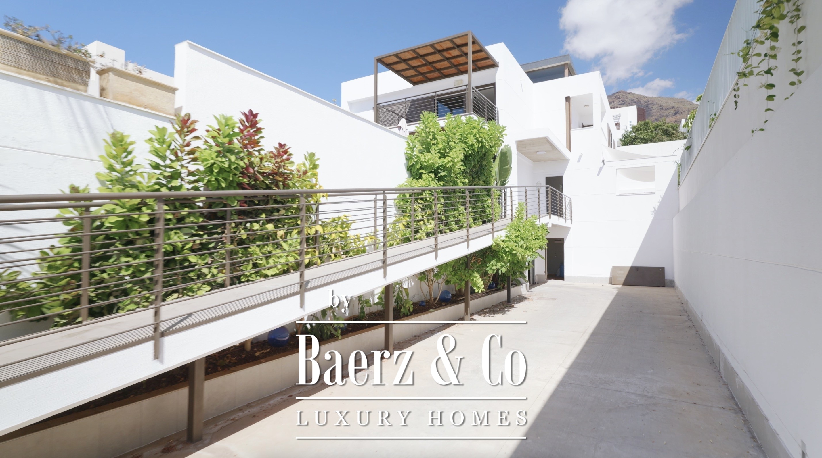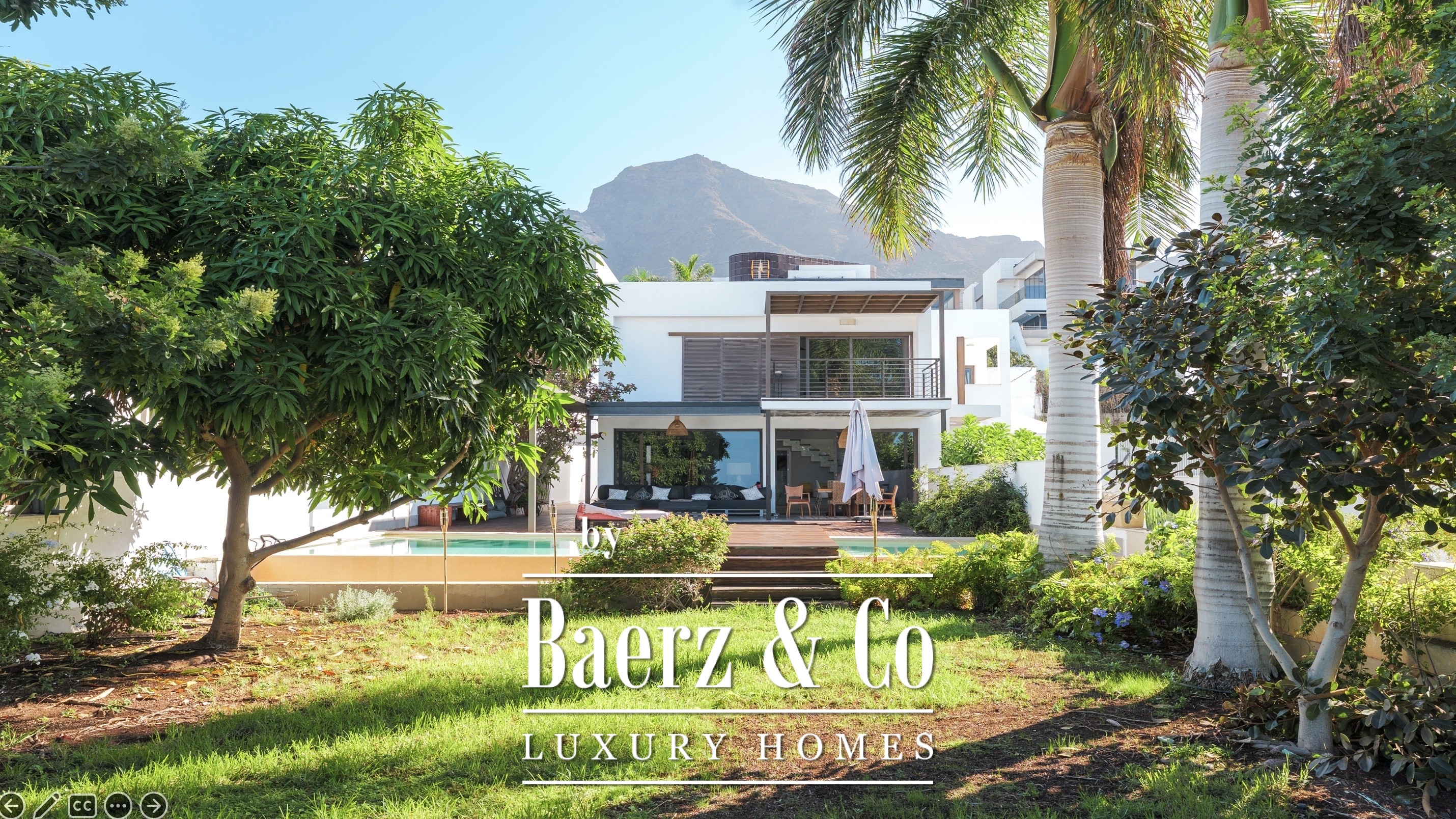 Het heeft een grote tuin met uitzicht op zee, palmbomen en fruitbomen, een privézwembad, ruime buitenruimtes en een ondergrondse garage met plaats voor meerdere auto's.