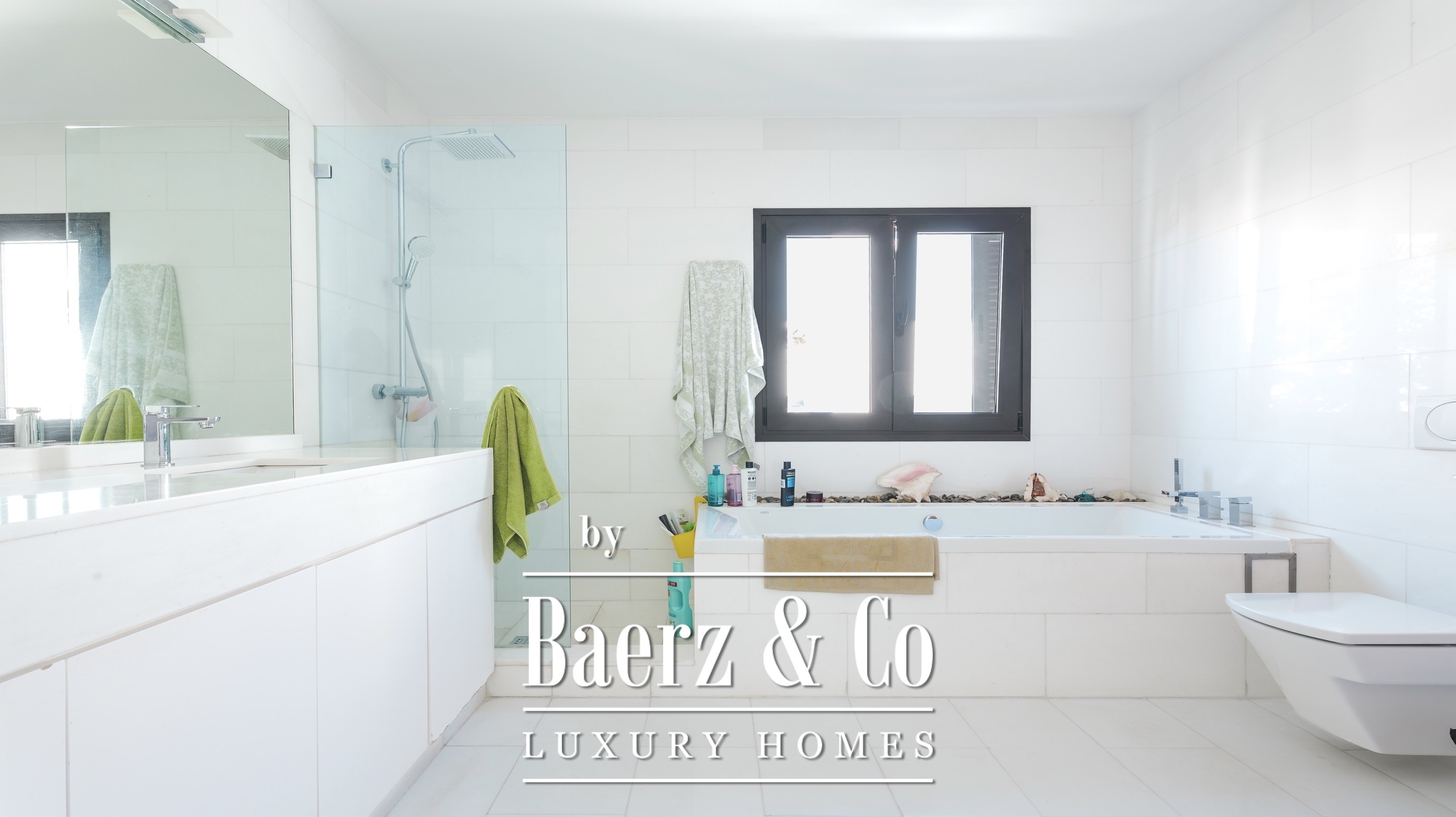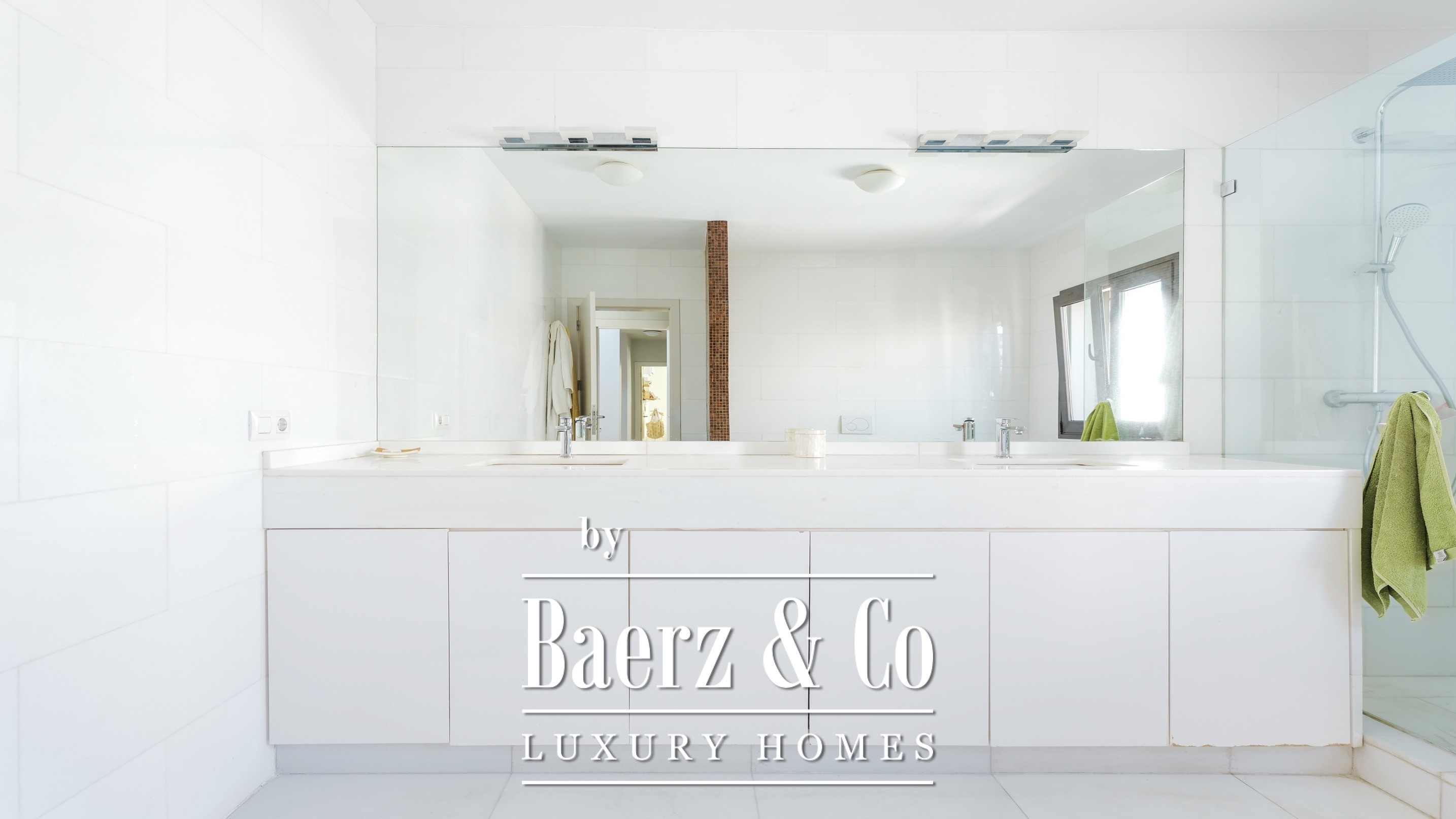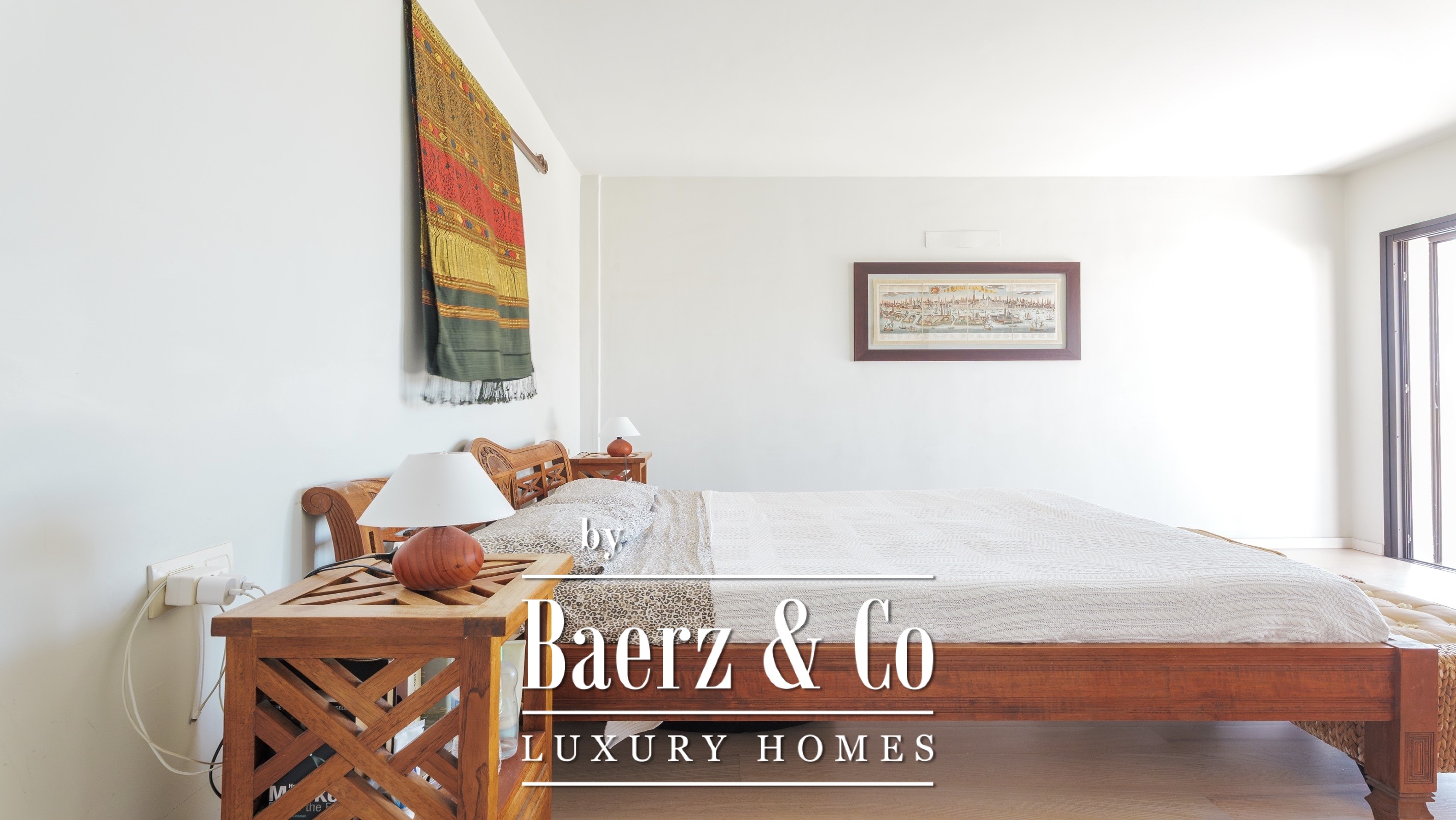 Er zijn vier slaapkamers met en-suite badkamers, waarvan de hoofdslaapkamer een kleedkamer, een grote badkamer en een eigen balkon met uitzicht op zee heeft.