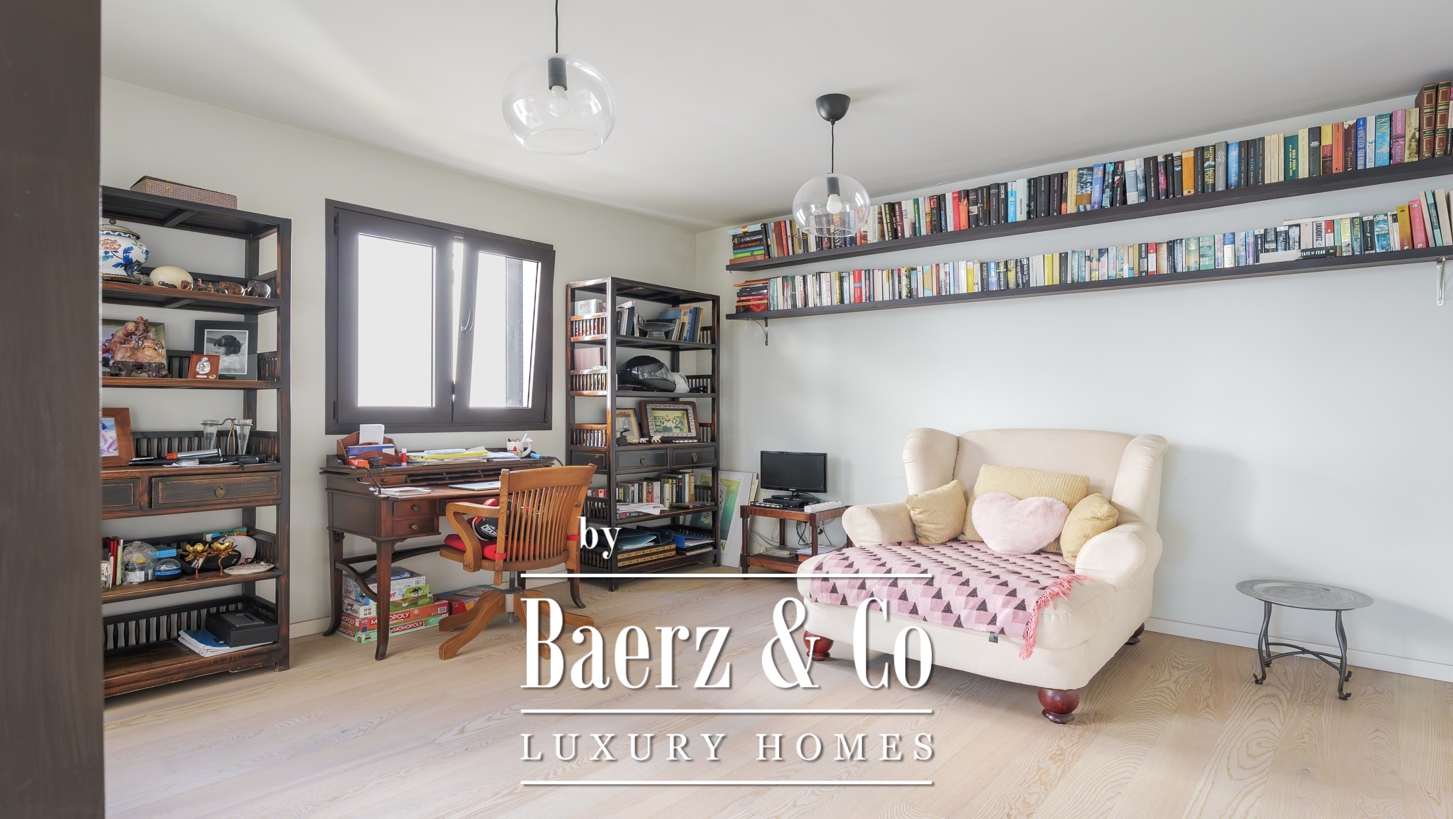 Een eigen oprit leidt naar de hoofdingang, parallel aan de toegang tot de garage. Binnen valt vooral de grote woonkamer met uitzicht op zee op, daarnaast is er een kantoor met uitzicht op zee, een gastentoilet en een volledig uitgeruste aparte keuken met directe toegang tot een ruim terras en patio, ideaal voor buiten dineren.