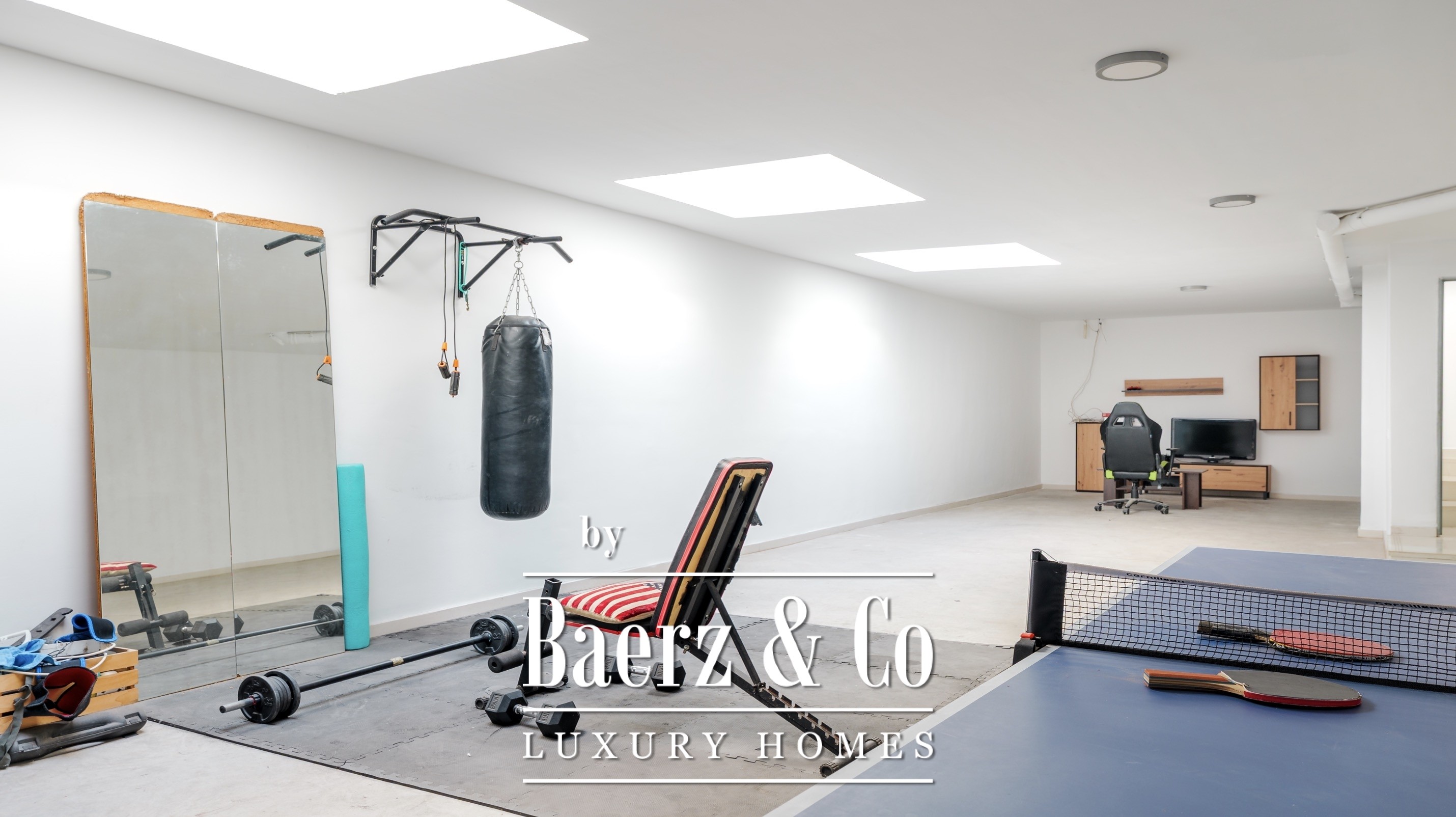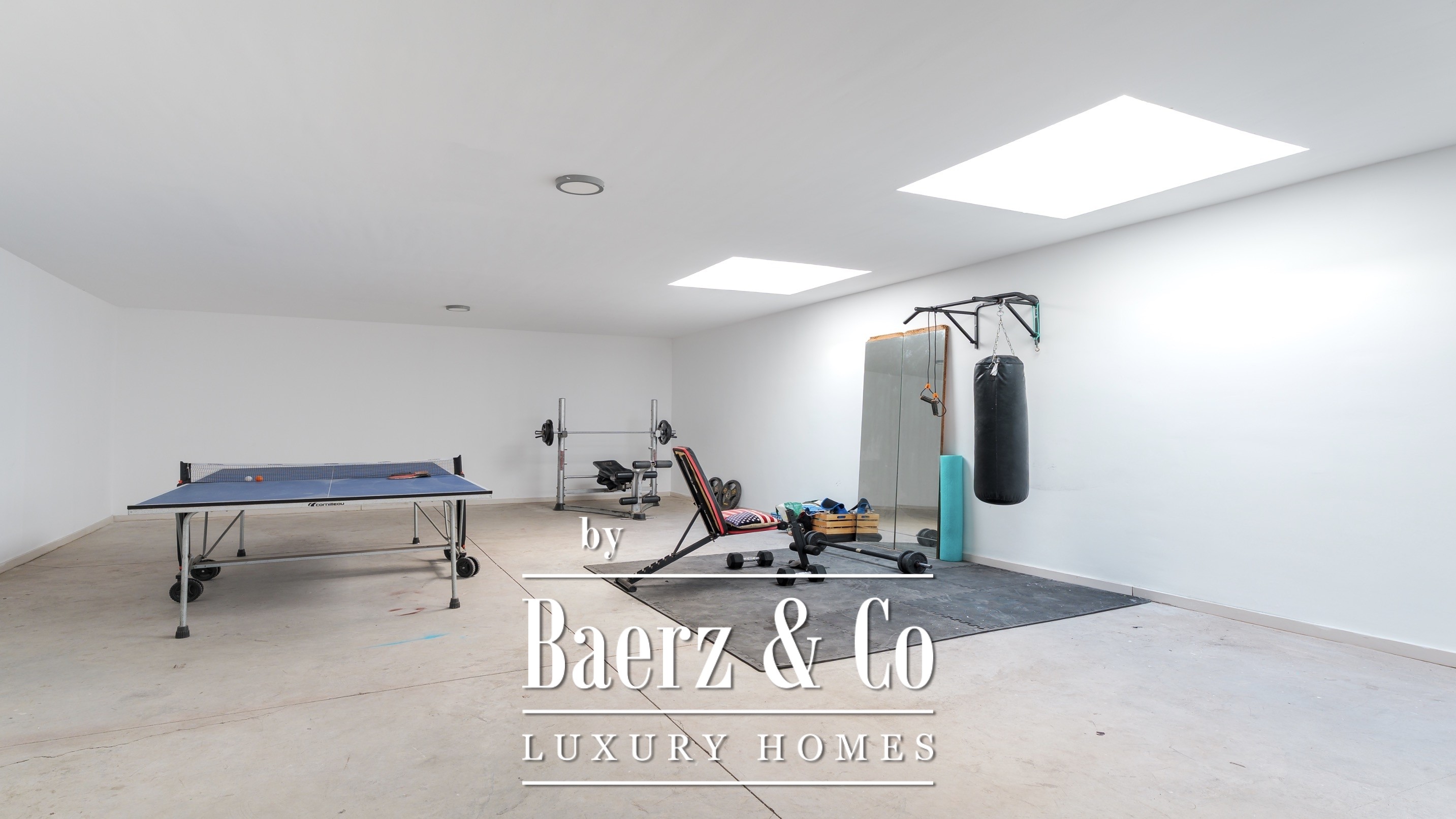 Een afgesloten garage voor meerdere auto's, naast een ruime multifunctionele woonkamer, perfect als fitnessruimte, speelkamer of privébioscoop. Er is ook een berging en een wasruimte.