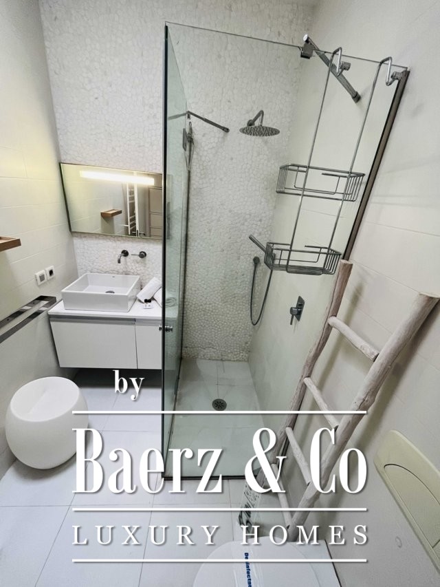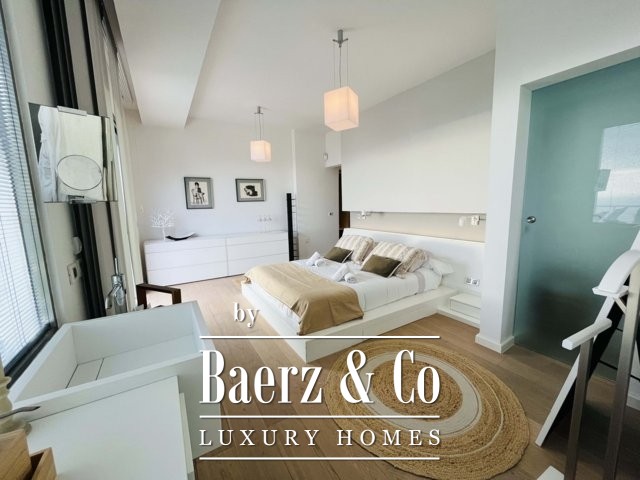 Op de eerste verdieping bevindt zich een mezzanine, momenteel in gebruik als kantoor, met uitzicht op de lichte woonkamer. De bovenste verdieping bestaat uit een bibliotheek/ studeerkamer/hobbyruimte, een groot terras van circa 50 m2 en een aparte tweepersoonsslaapkamer met een eigen badkamer.