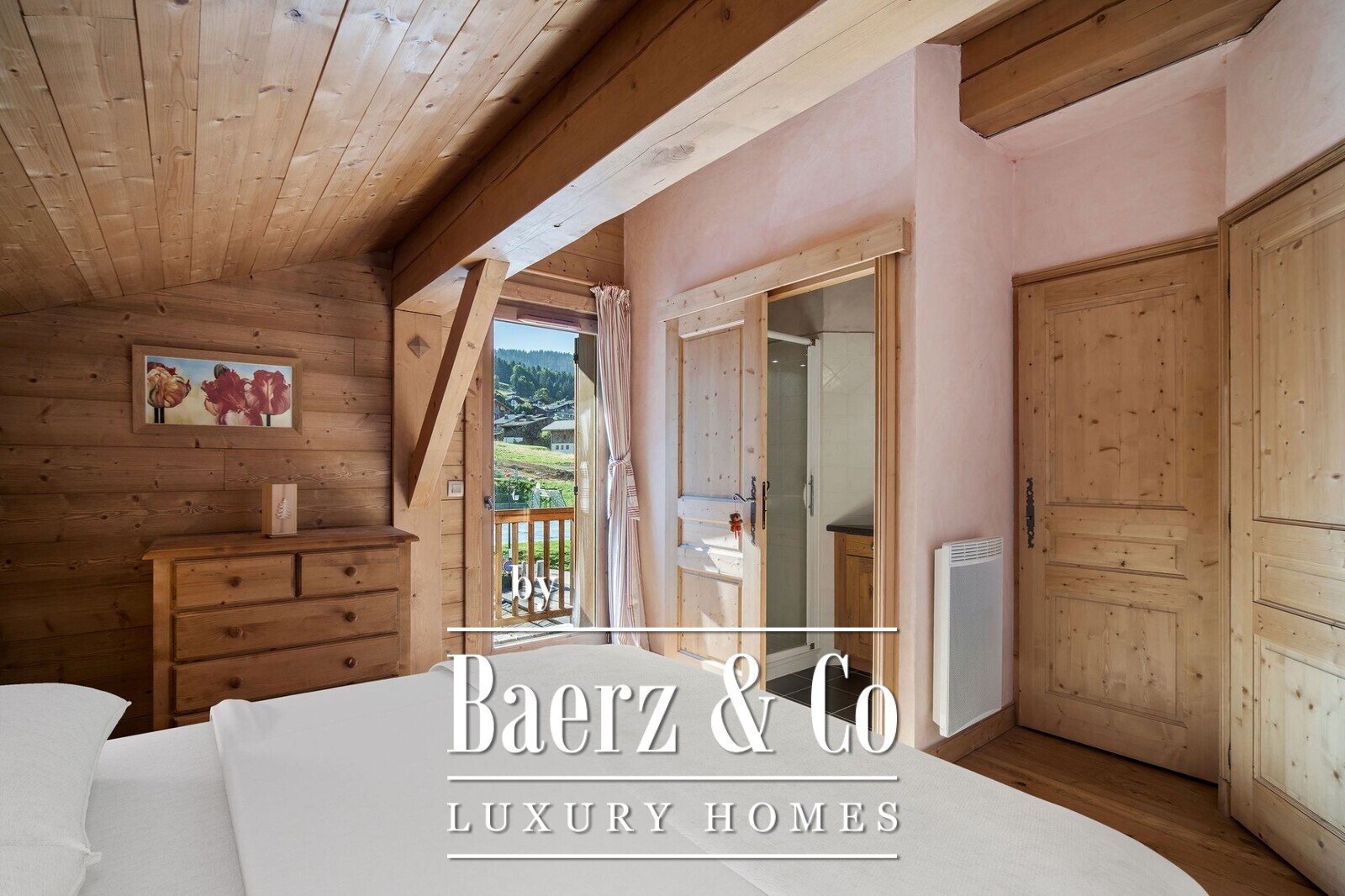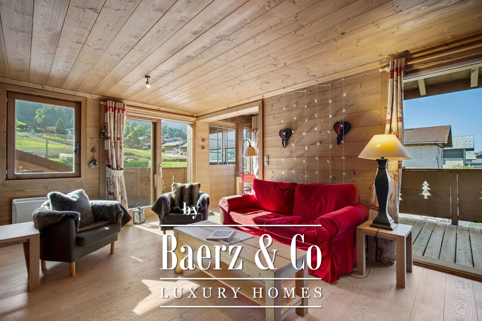 The apartment features a spacious, bright living room with an open-plan fitted kitchen, opening onto a south-facing balcony. Upstairs, you will find an en-suite bedroom, two mountain alcoves, a shower room, and a pleasant mezzanine area.