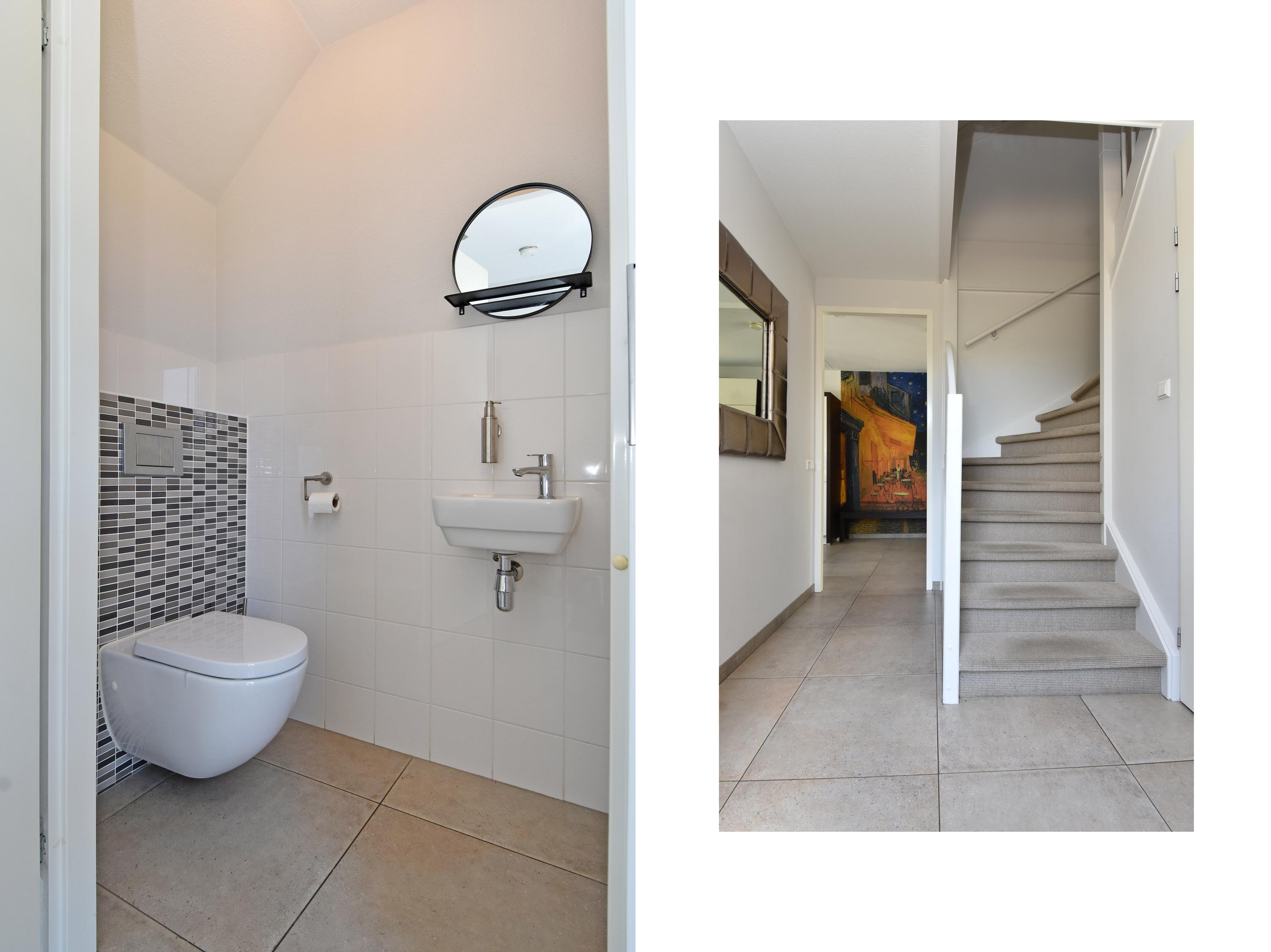 De tweede badkamer is modern en beschikt over een wastafel, een ruime inloopdouche en een derde toilet.