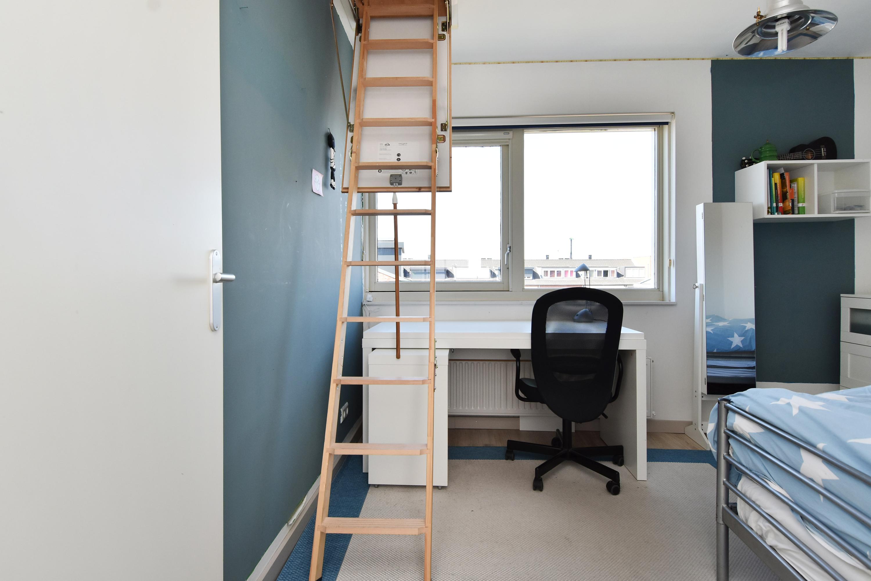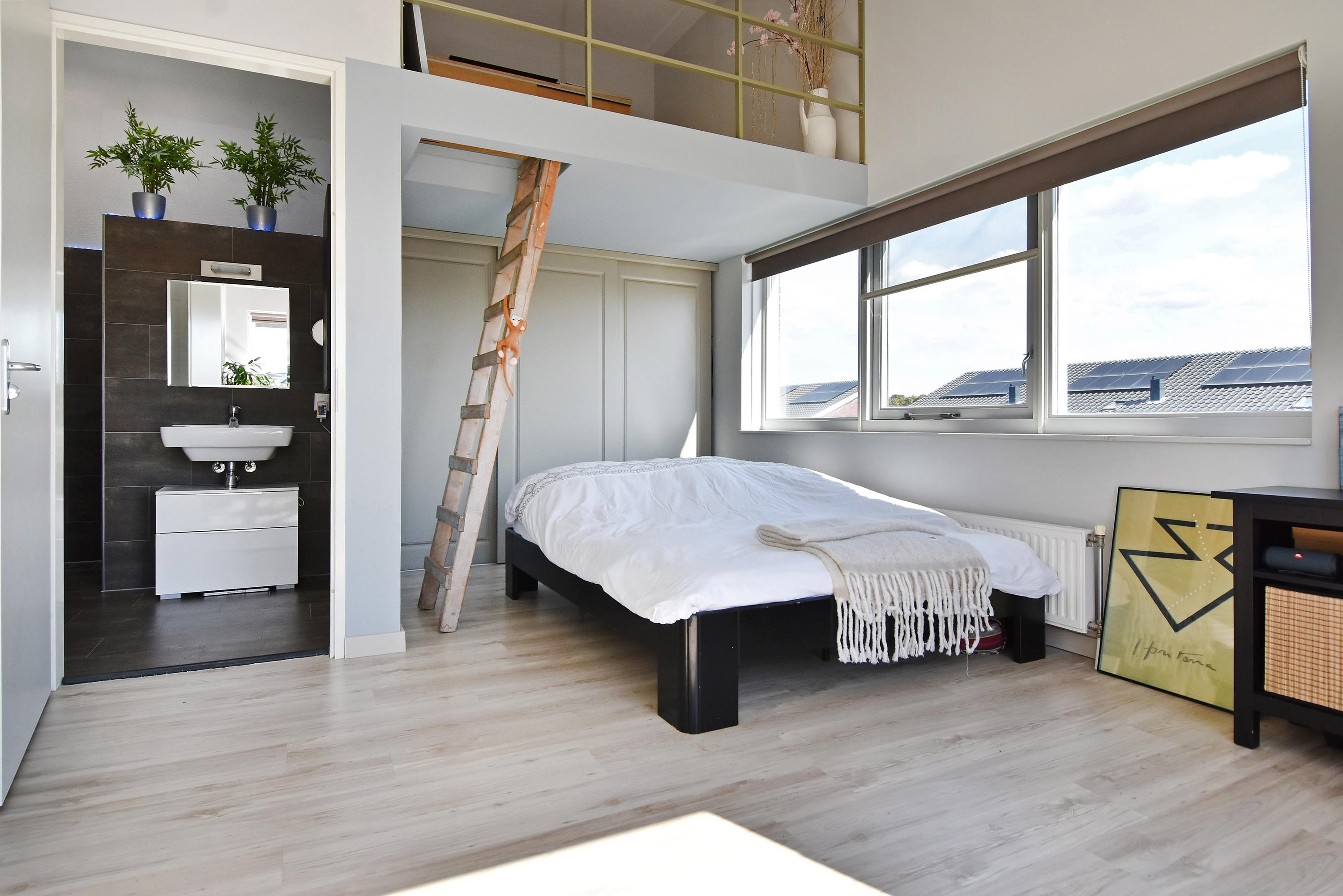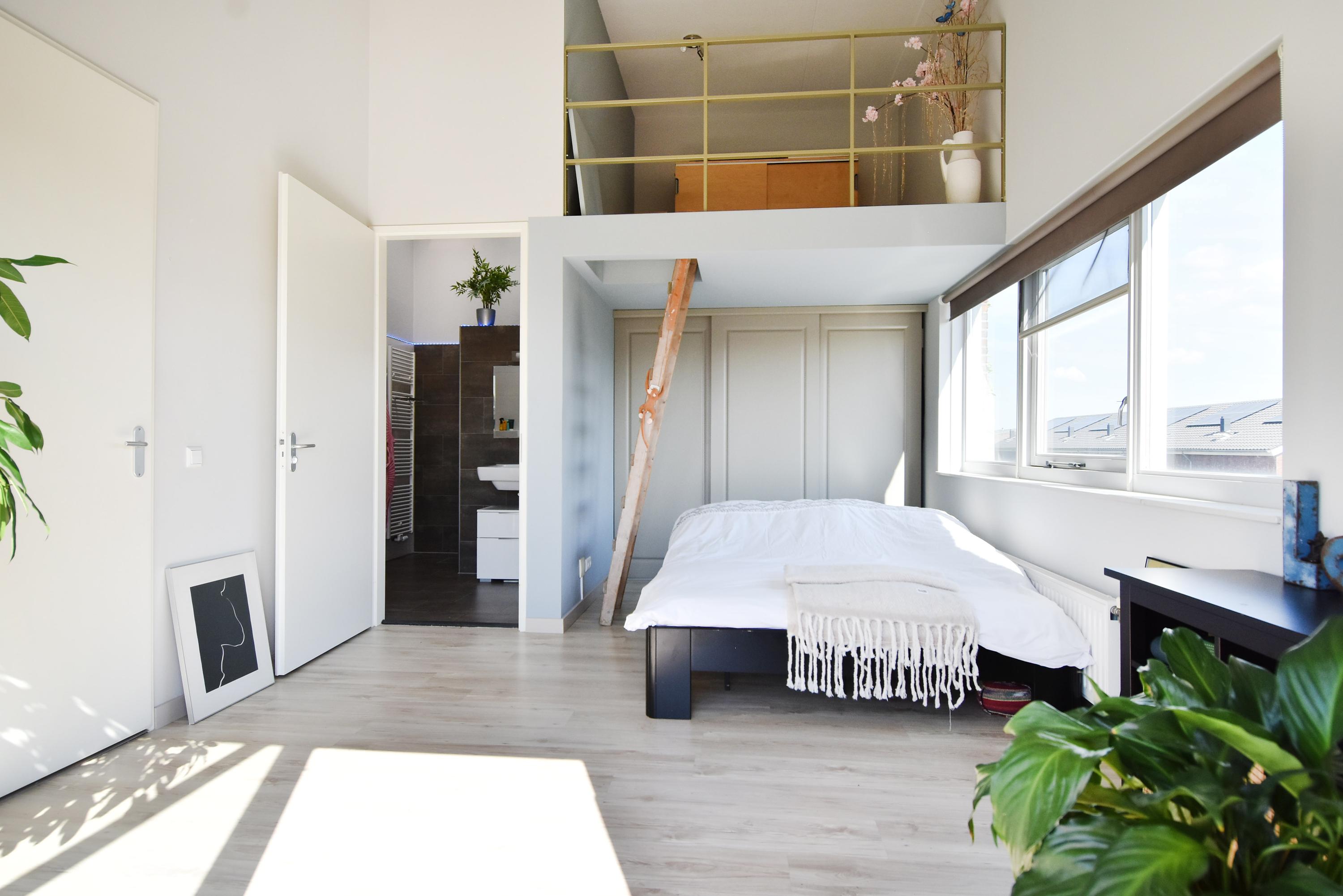 De derde slaapkamer/studio (thans ouderslaapkamer) die toegang biedt tot het terras heeft een speelse indeling met een bijzonder fraaie plafondhoogte van meer dan 4 meter (!) met een entresol en vide.
