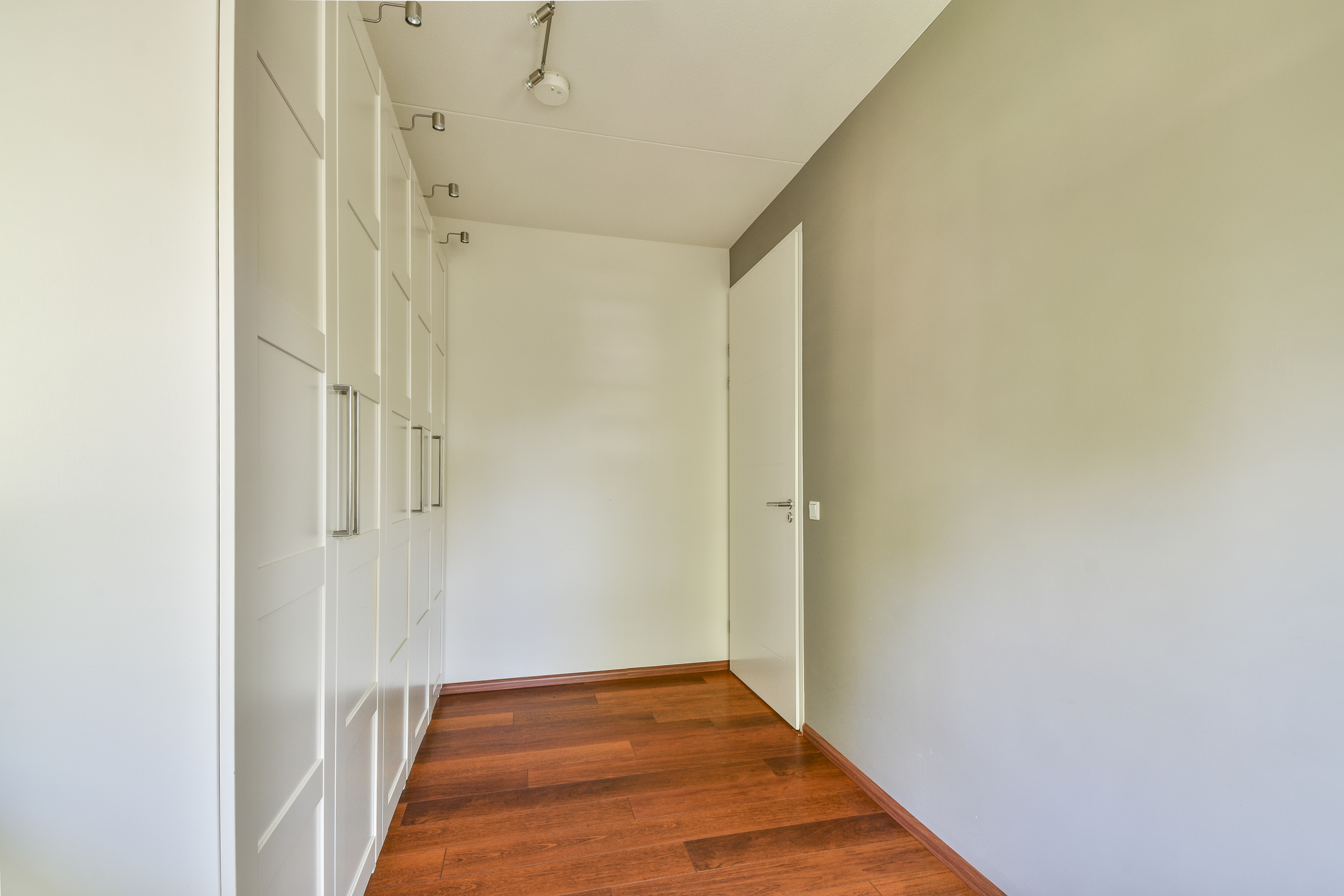 Rondom de lichte en centrale overloop met vide en fraaie verticale raampartijen in de zijgevel, bevinden zich de diverse vertrekken op deze verdieping.