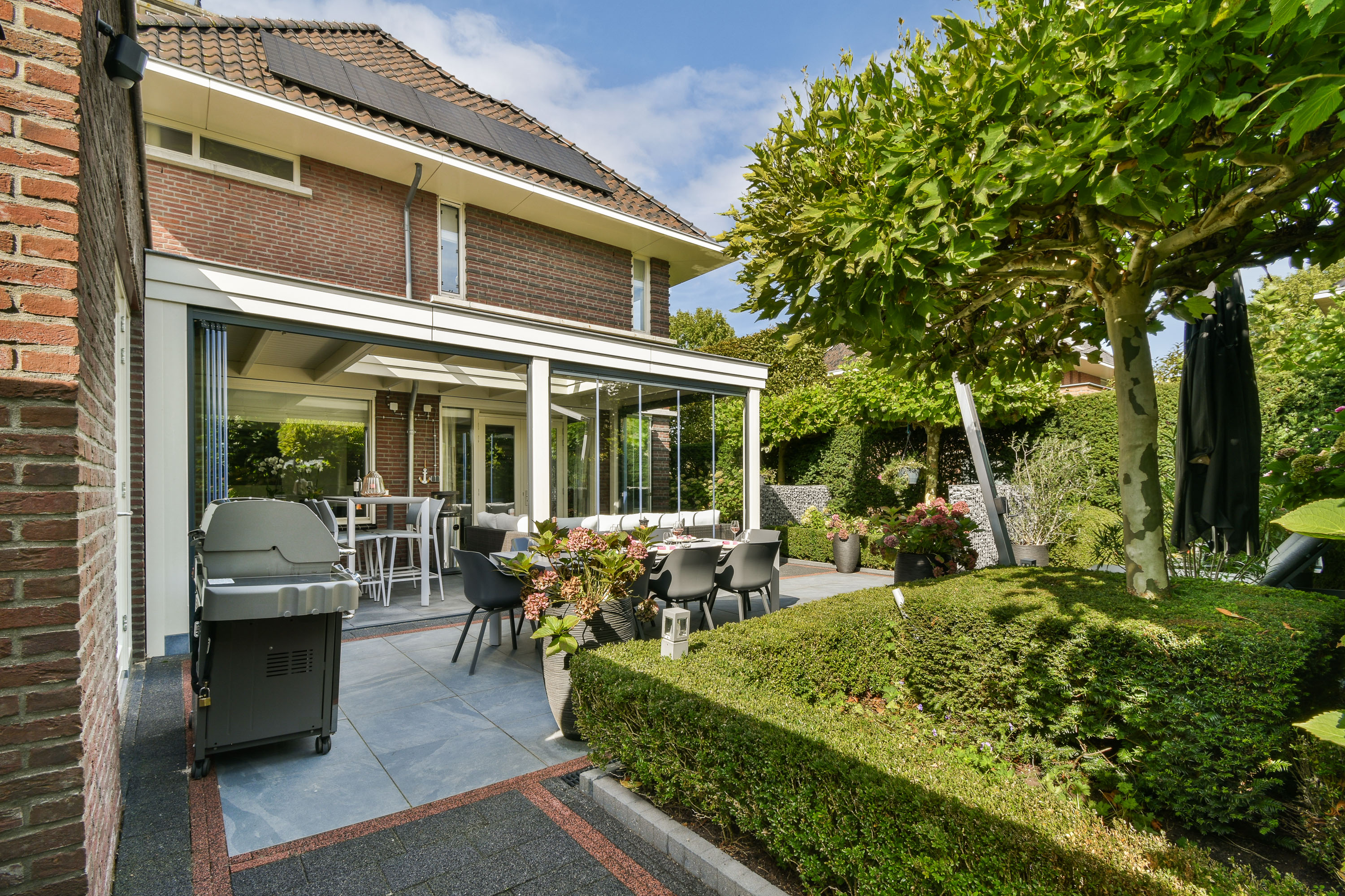 De tuin is rondom en opvallend fraai en verzorgd. Het begint al met de bestrate oprit met carport en de voortuin met planten. De zij- en achtertuin zijn eveneens zeer verzorgd aangelegd met hortensia's, planten, struiken en hagen, maar ook terrassen, electra en verlichting. Als kers op de taart is er een heerlijke en royale serre aangebouwd aan de woonkamer met een glazen (te openen) wand, electra en een dak met lichtstraat.