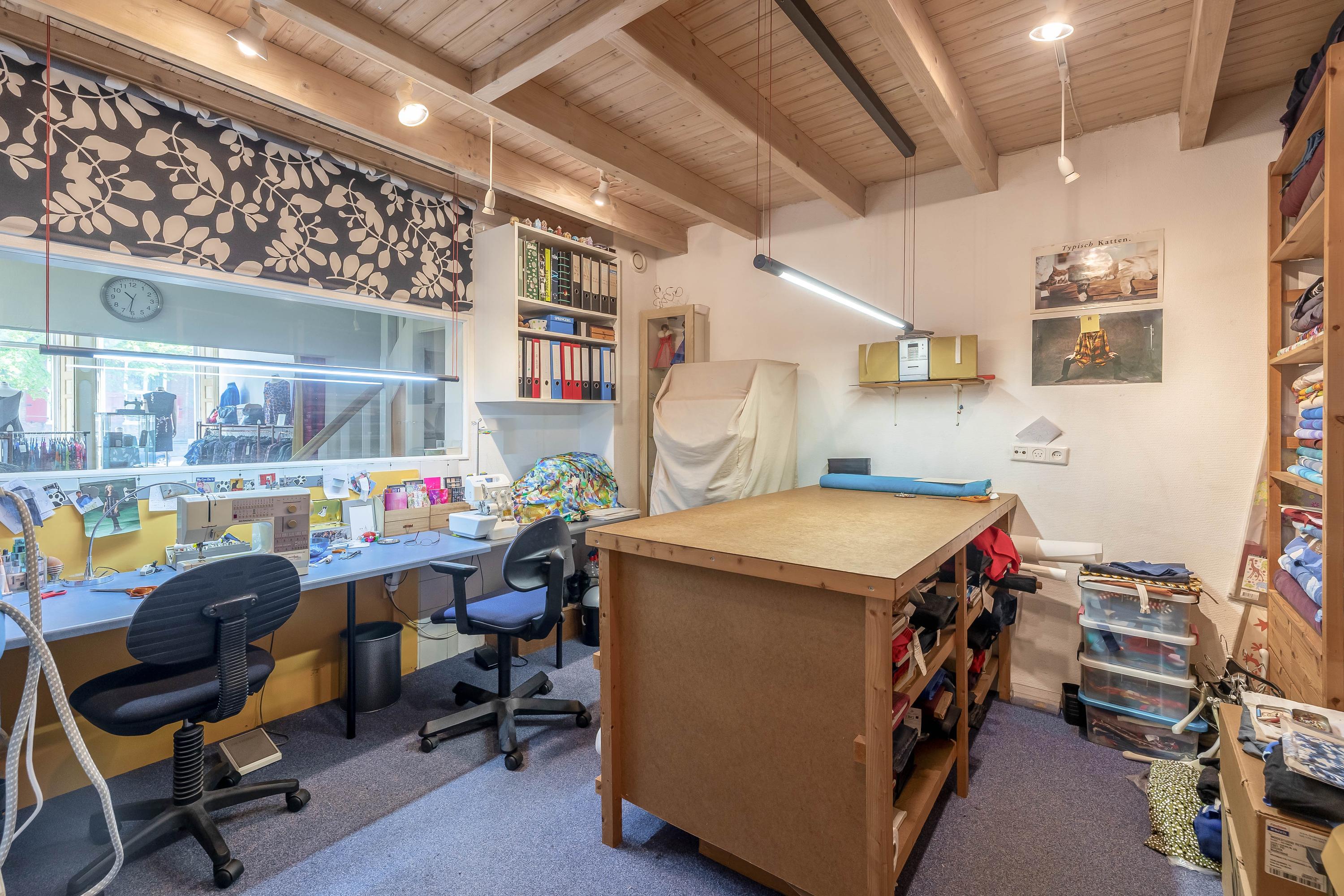 winkelruimte met prachtig houten lijstenplafond, trappartij (geheel vernieuwd), atelier met vlizotrap naar bergvliering, toiletruimte, 2e trappartij (geheel vernieuwd), grote woonkeuken met schitterend uitzicht op de tuin, keukenopstelling met inductiekookplaat, afzuigkap, combi-oven, heteluchtoven, vaatwasser, keukenboiler, marmoleum met vloerverwarming en deur naar het terras op het zuid-westen.