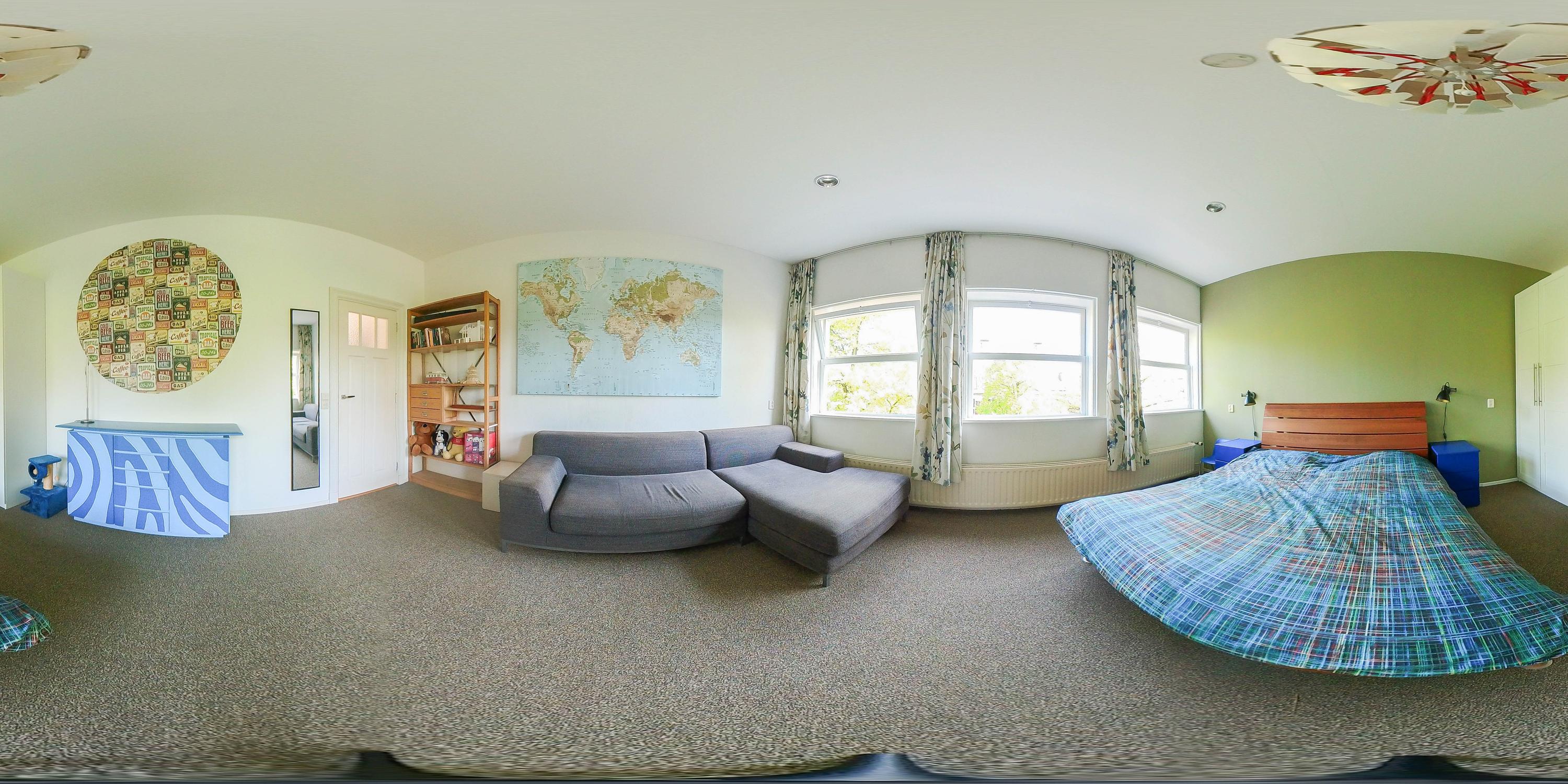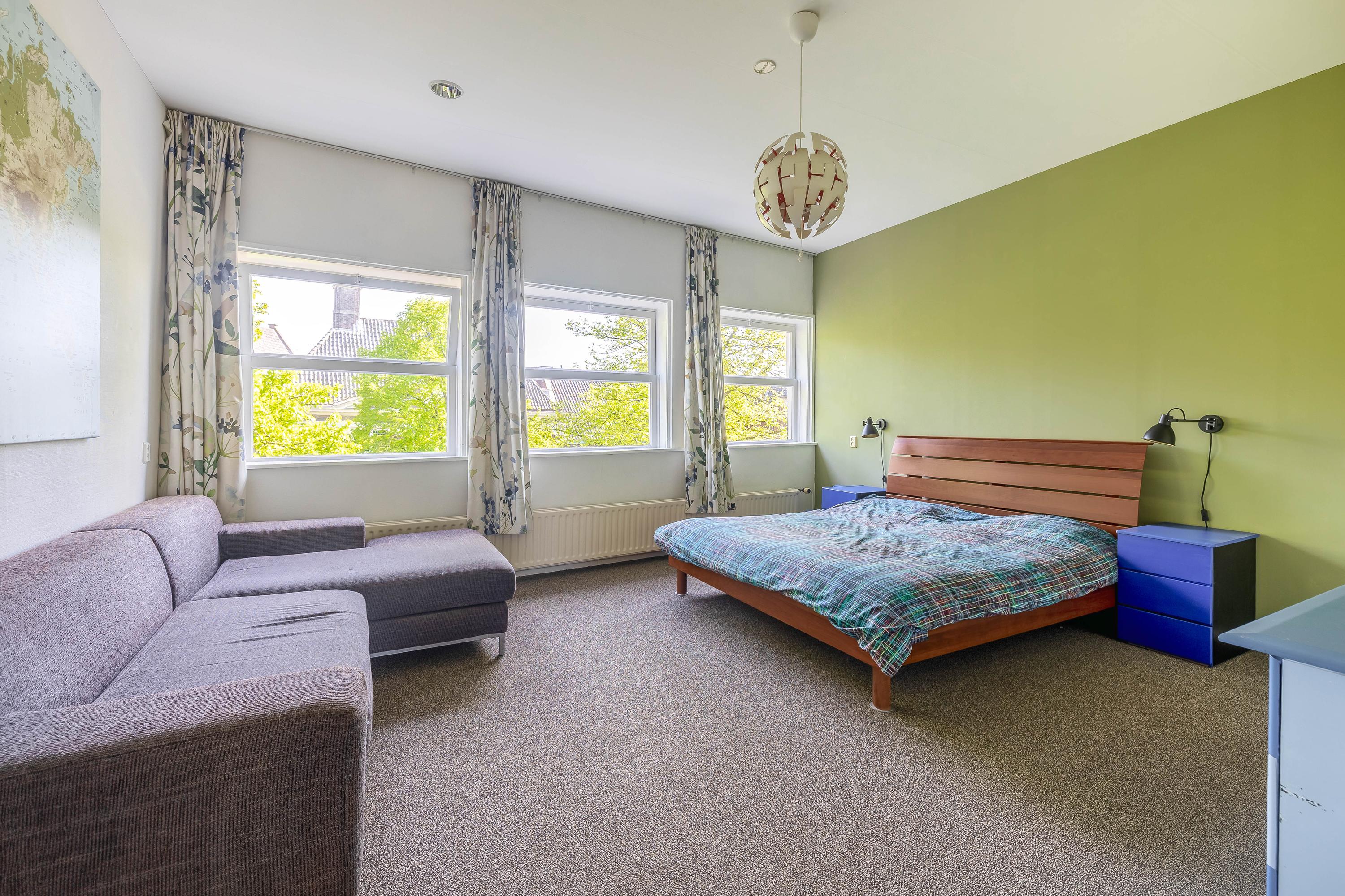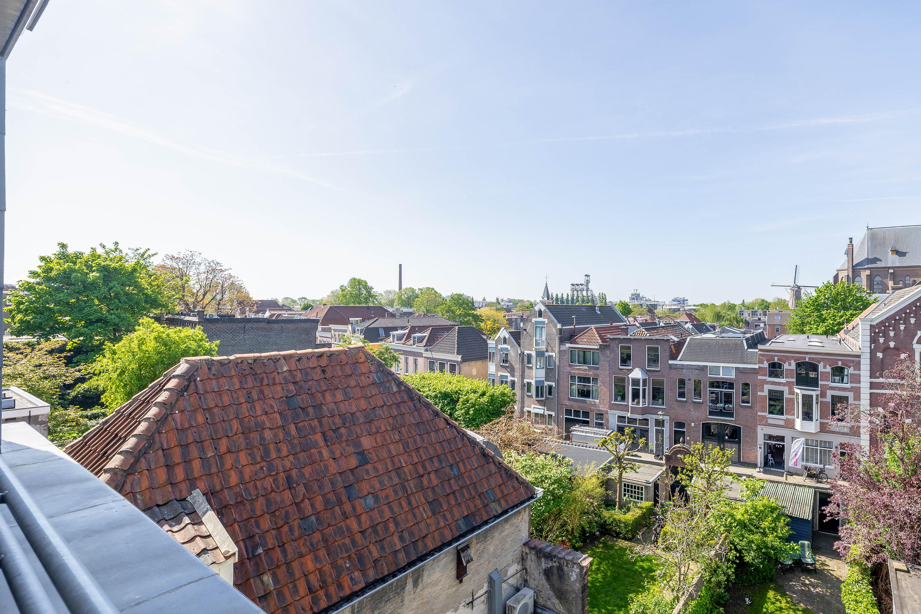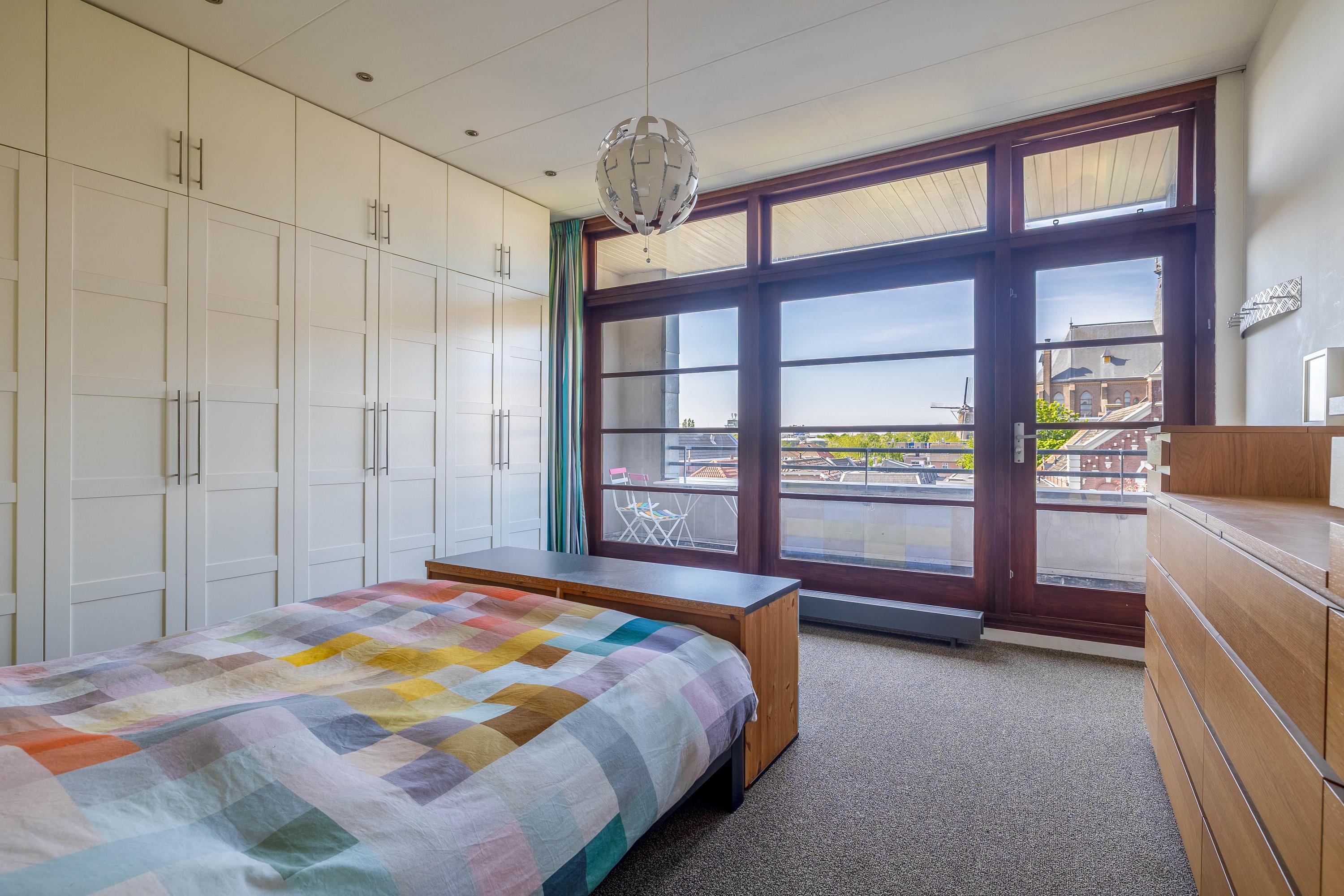 slaapkamer aan achterzijde met nieuwe achterpui met deur met terras en schitterend uitzicht over de historische panden van de Goudse binnenstad, slaapkamer met vaste kastenwand, airco, cv-ruimte en slaapkamer aan voorzijde met zicht op het museum en de St Janskerk