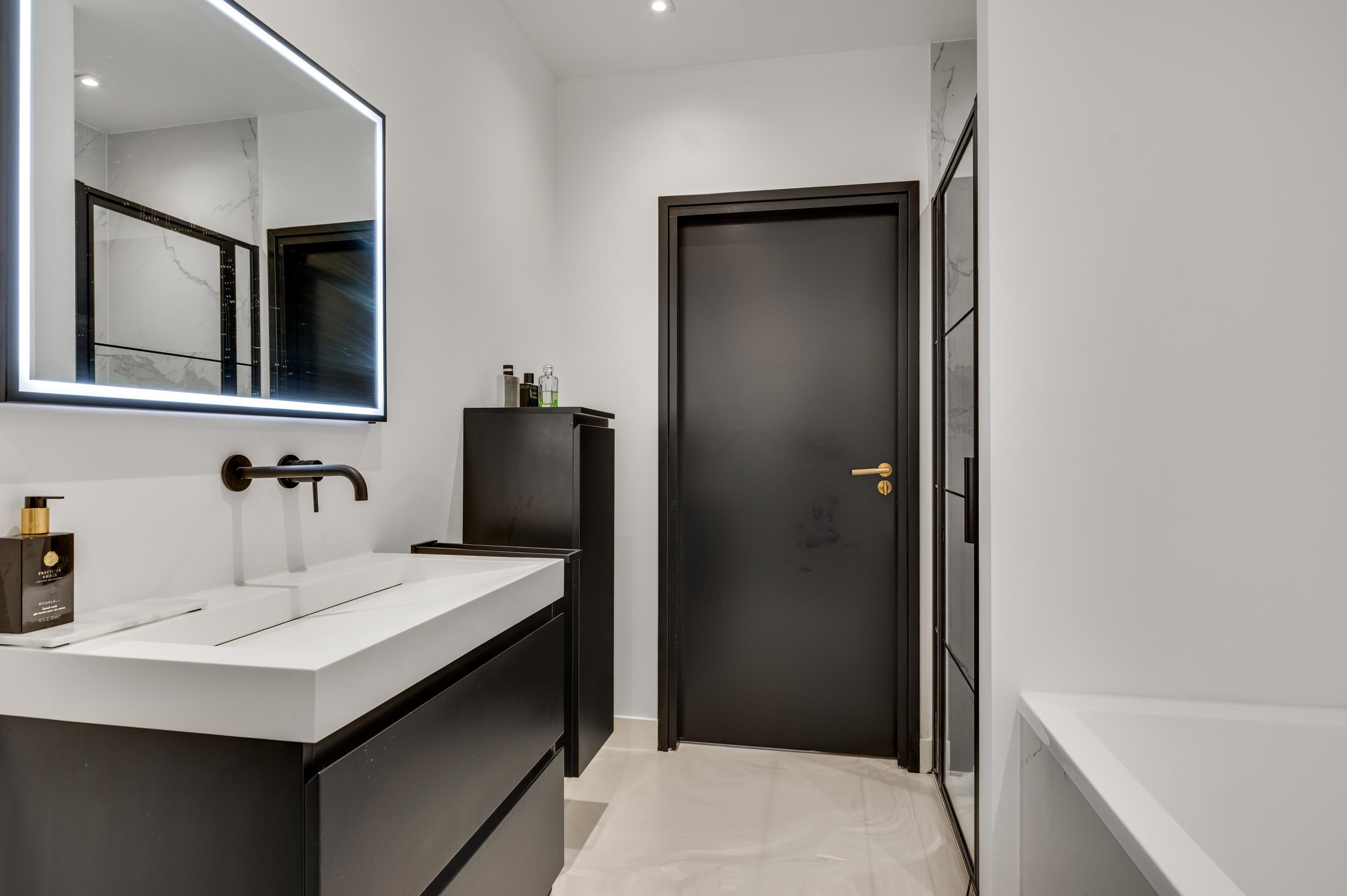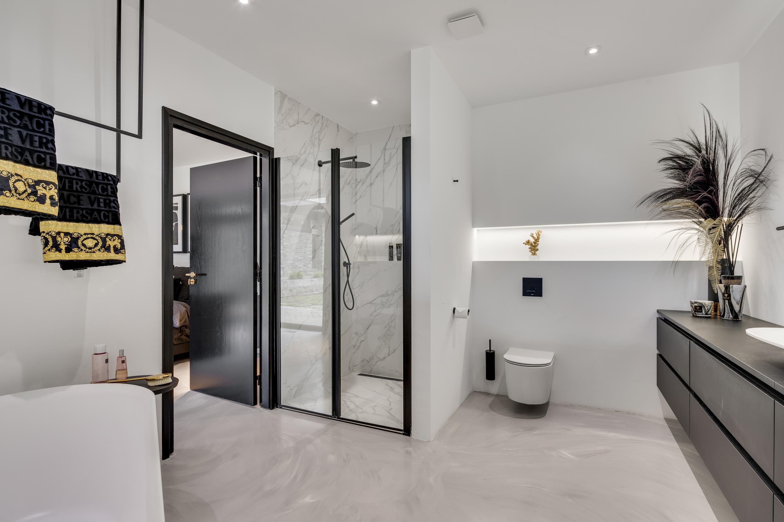 De oostvleugel is volledig ingericht als slaapverblijf. Hier bevinden zich vijf slaapkamers, waaronder een riante master bedroom met eigen kleedkamer, luxe badkamer en directe toegang tot een overdekt terras met zicht op de tuin. De overige vier slaapkamers delen twee stijlvolle badkamers, elk voorzien van een ligbad, inloopdouche, dubbele wastafel en wandcloset.