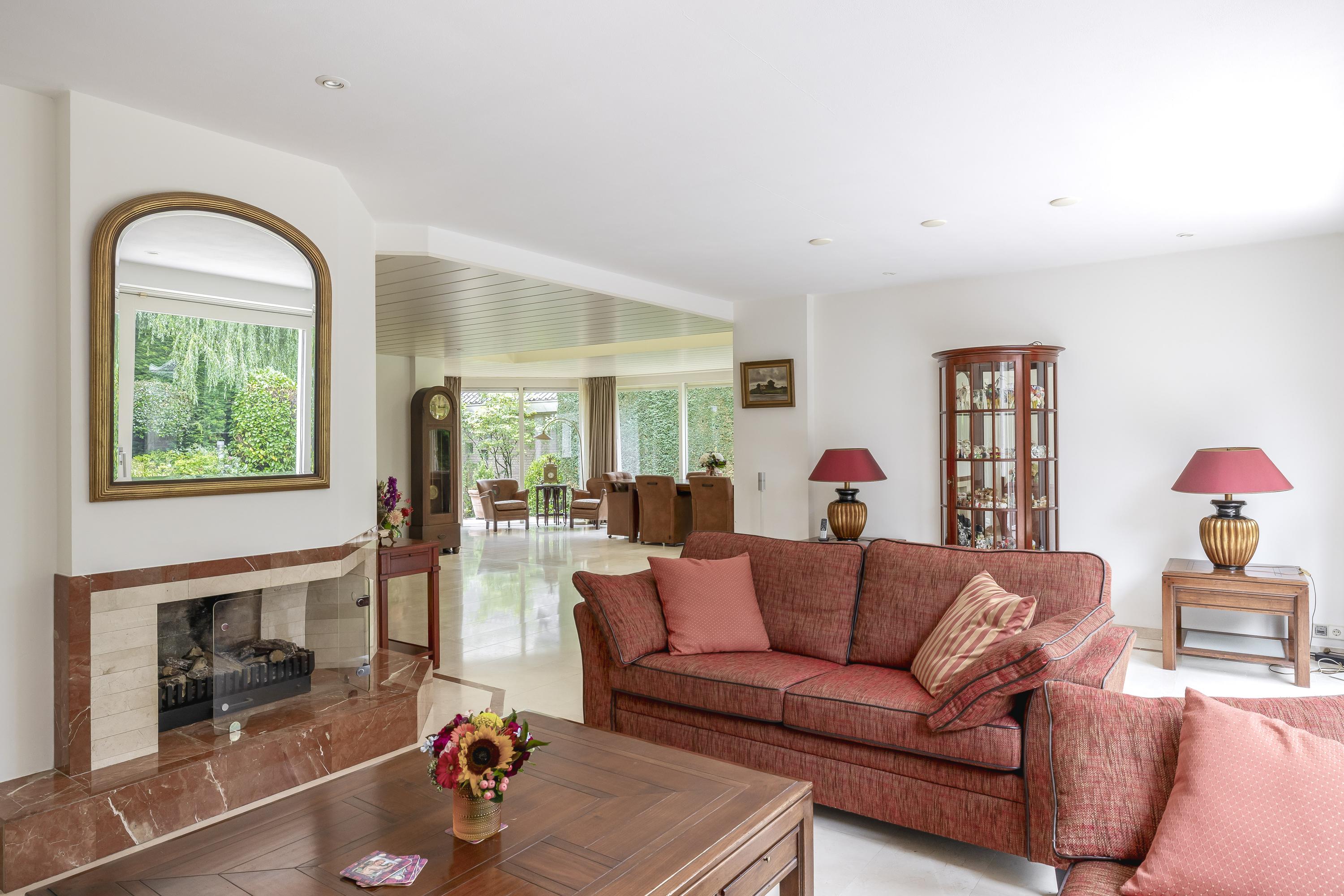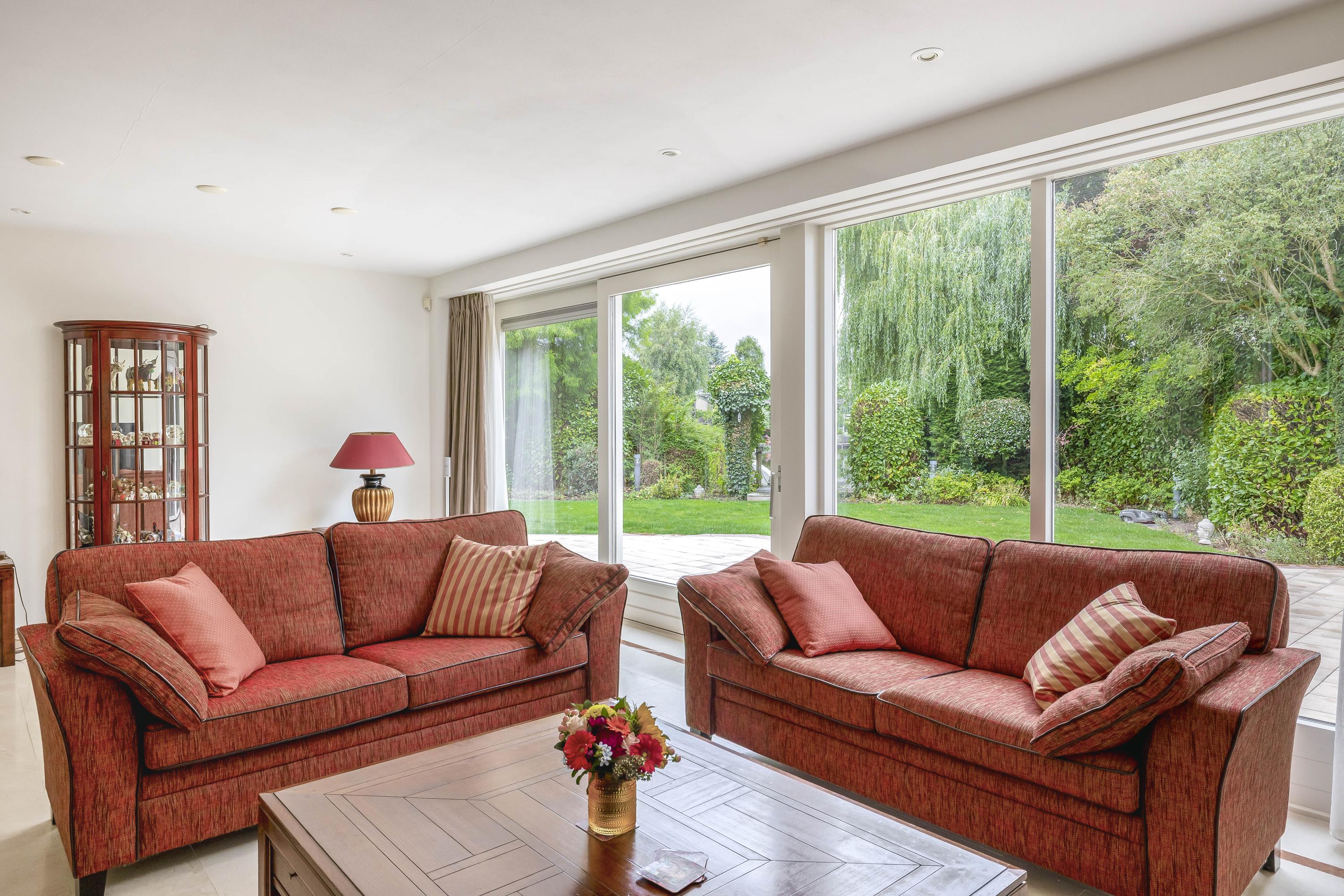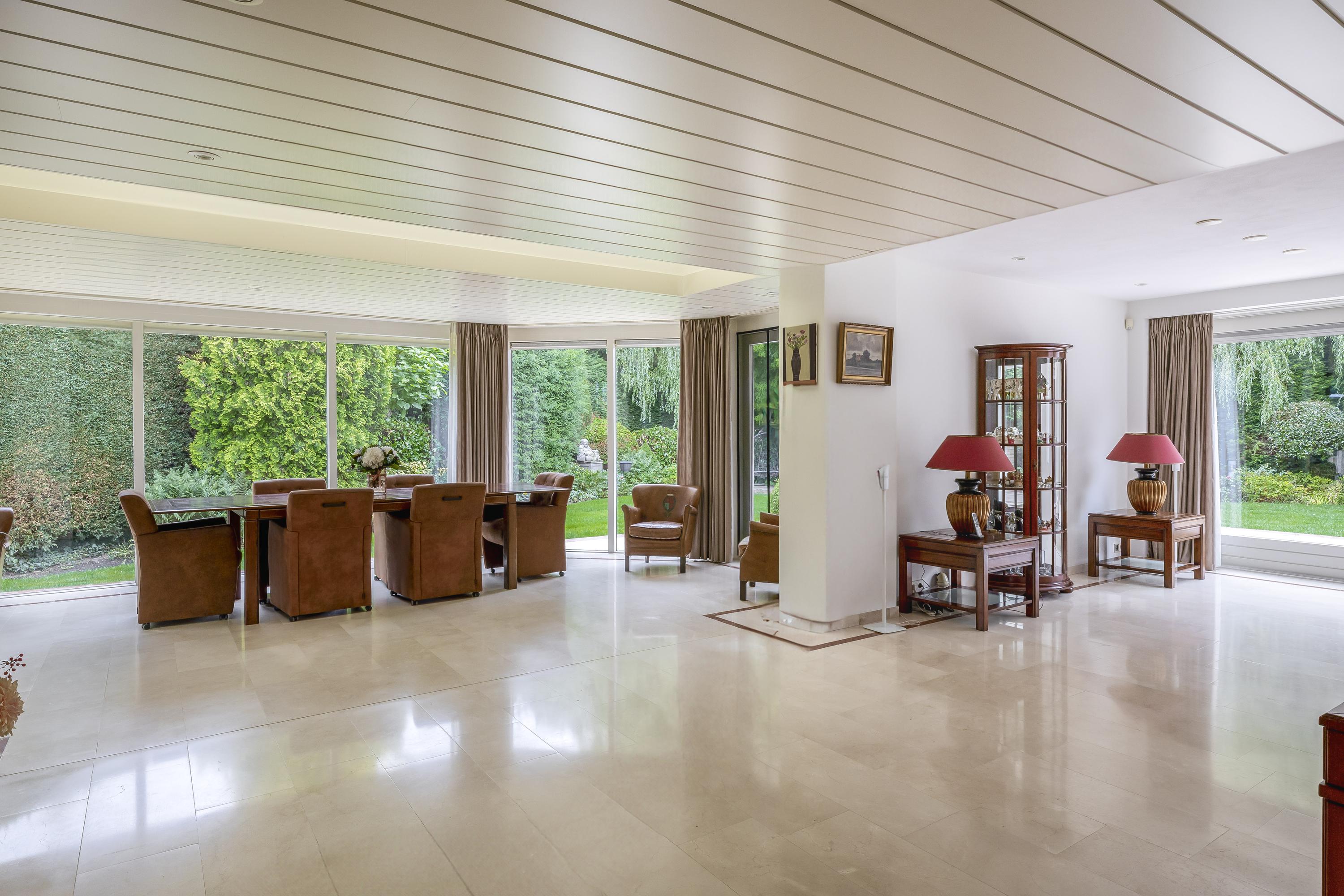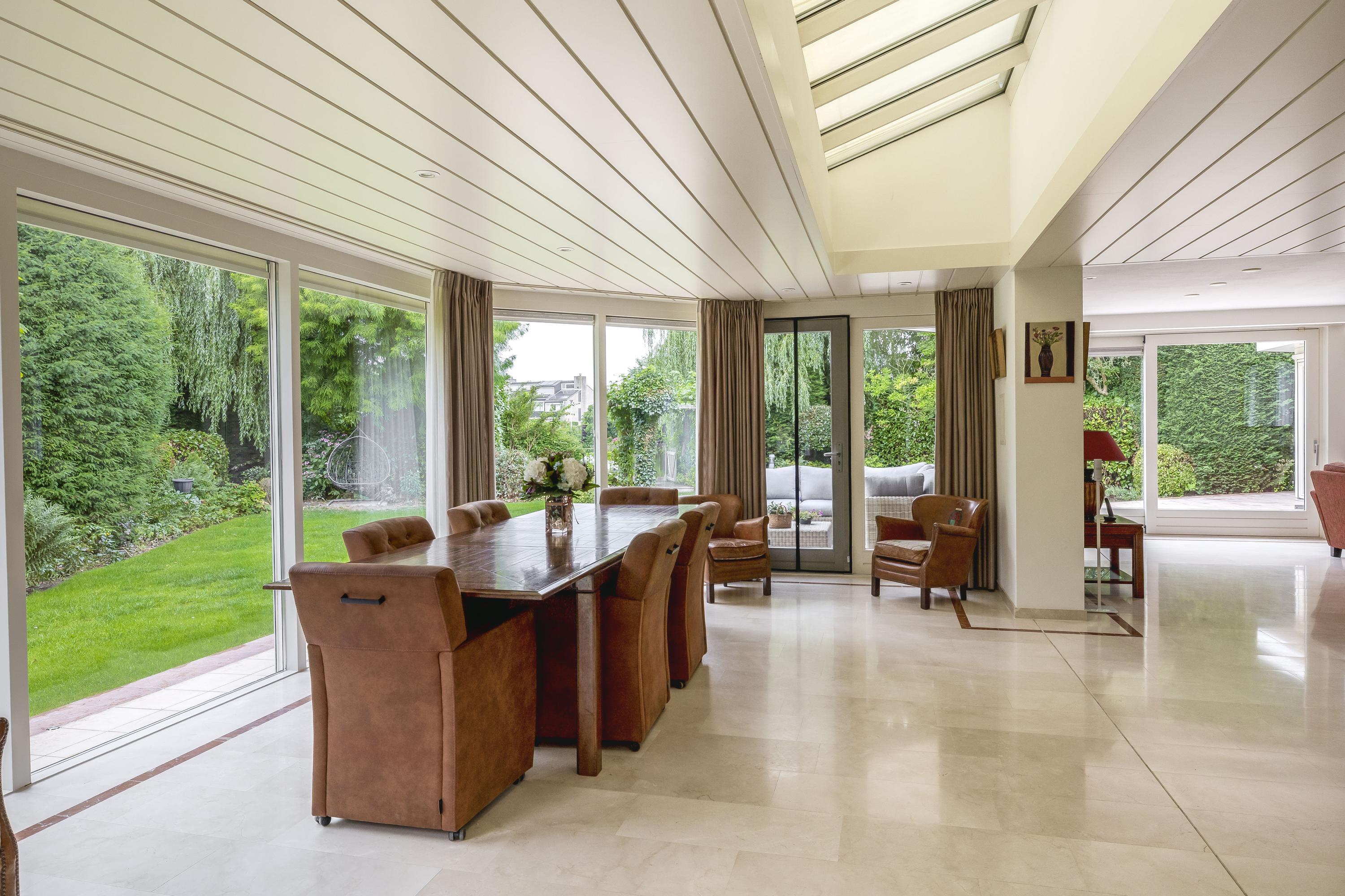 De living is ruim, licht en door de grote ramen aan drie zijden ervaar je een bijna panoramisch uitzicht op het groen rondom het huis. De schuifpui aan de achterzijde geeft toegang tot het terras en de tuin, waar je in alle rust kunt genieten van het zonnetje en het uitzicht op het water. De eetkamer grenst direct aan het terras, wat zorgt voor een fijne interactie tussen binnen en buiten.