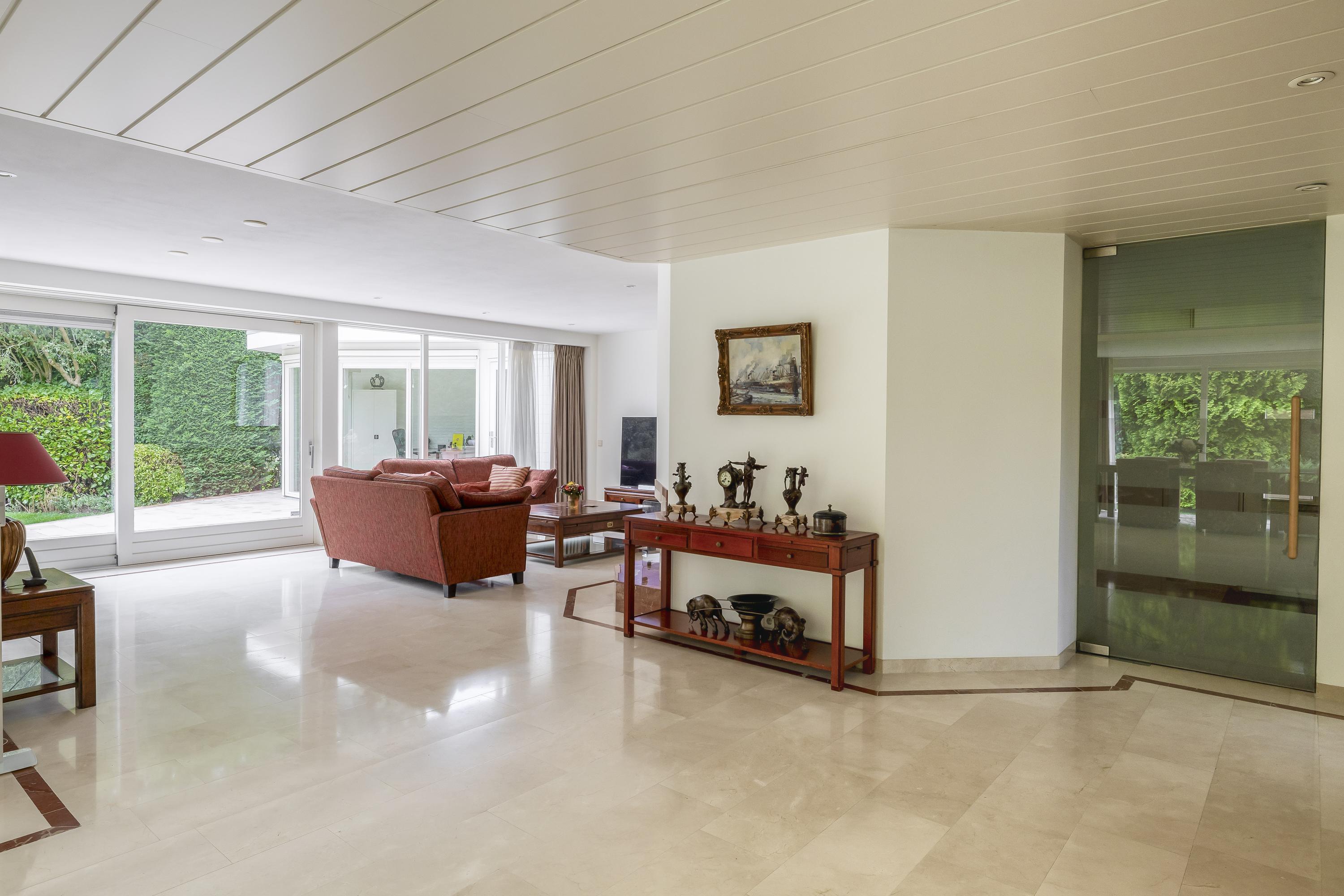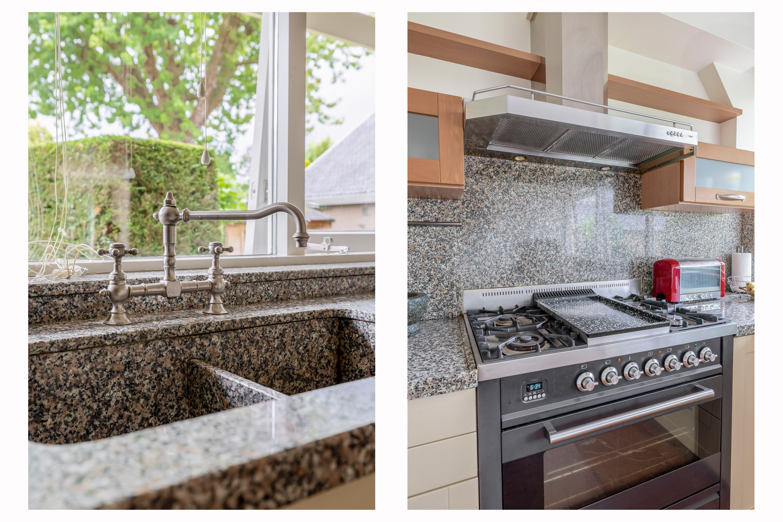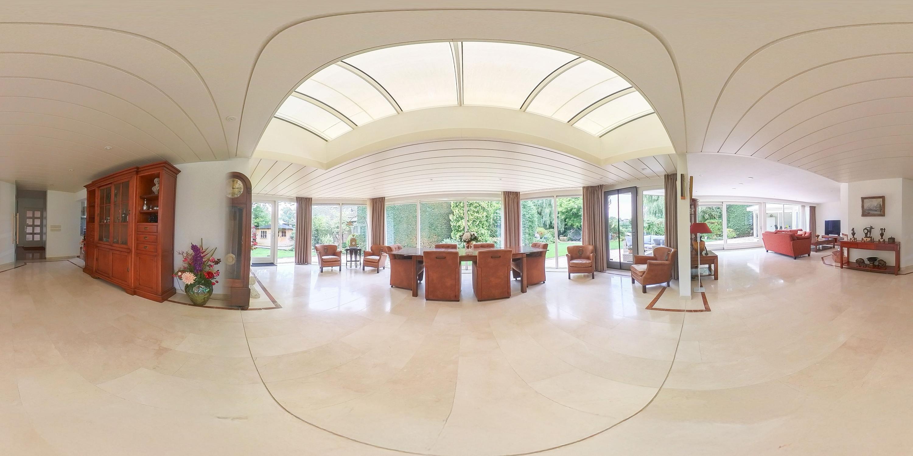De living is ruim, licht en door de grote ramen aan drie zijden ervaar je een bijna panoramisch uitzicht op het groen rondom het huis. De schuifpui aan de achterzijde geeft toegang tot het terras en de tuin, waar je in alle rust kunt genieten van het zonnetje en het uitzicht op het water. De eetkamer grenst direct aan het terras, wat zorgt voor een fijne interactie tussen binnen en buiten.
