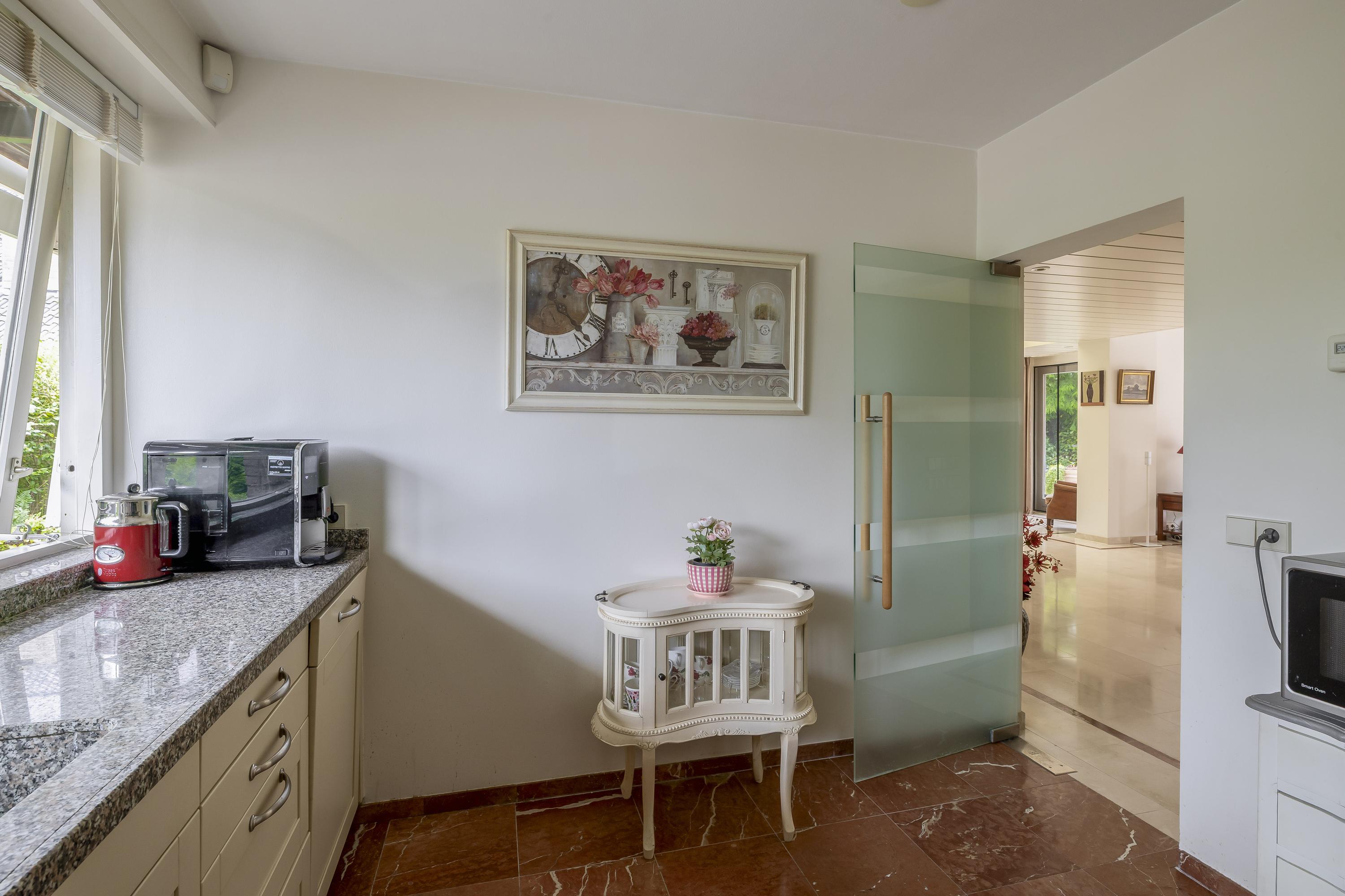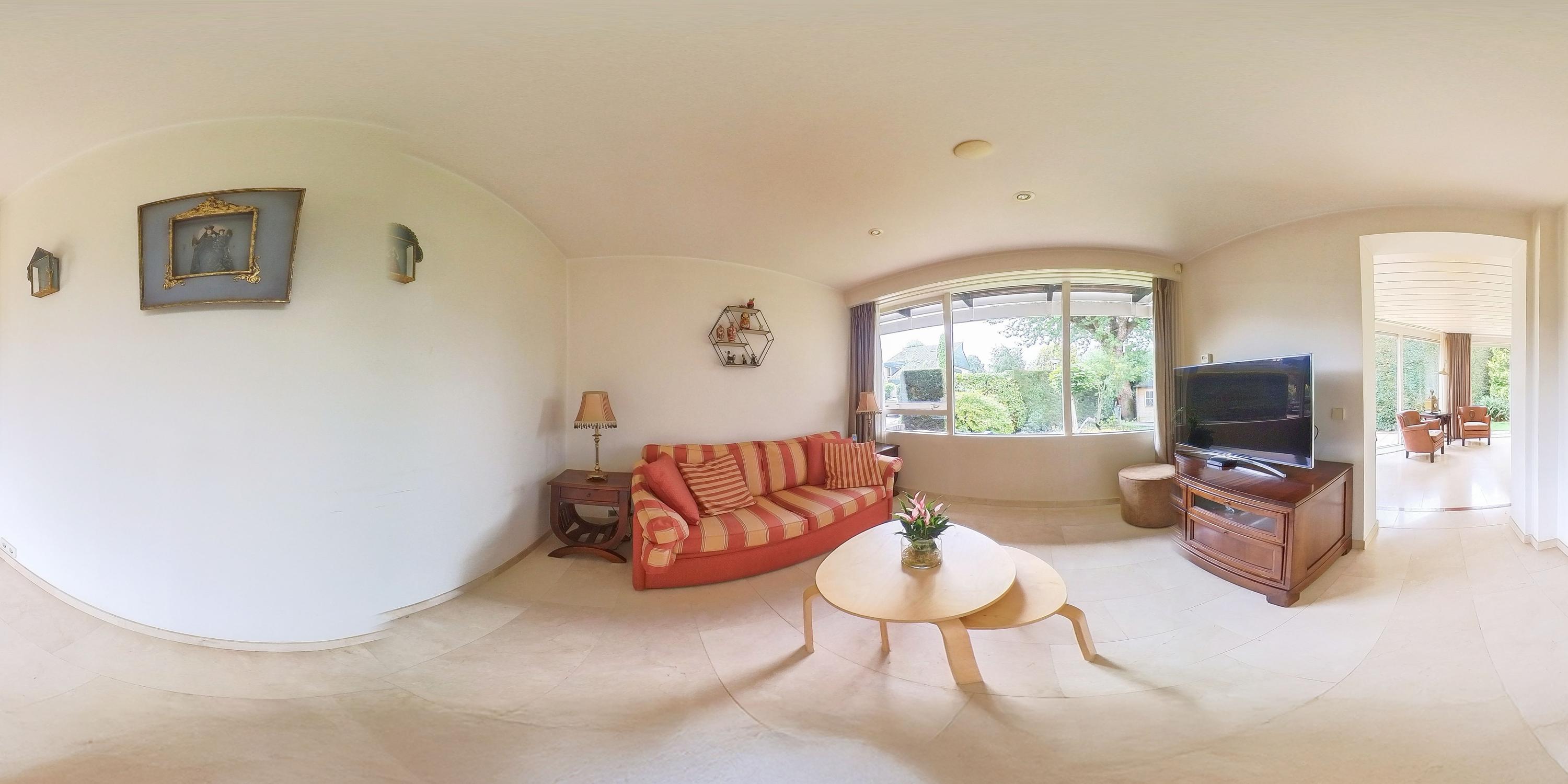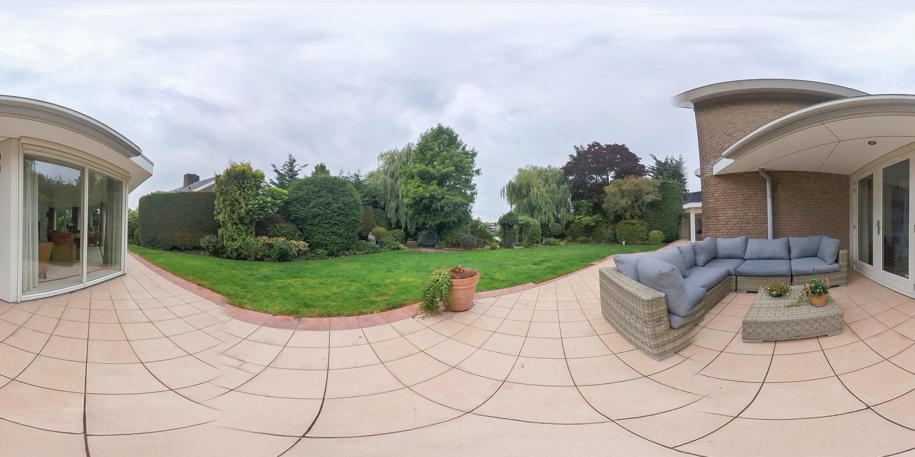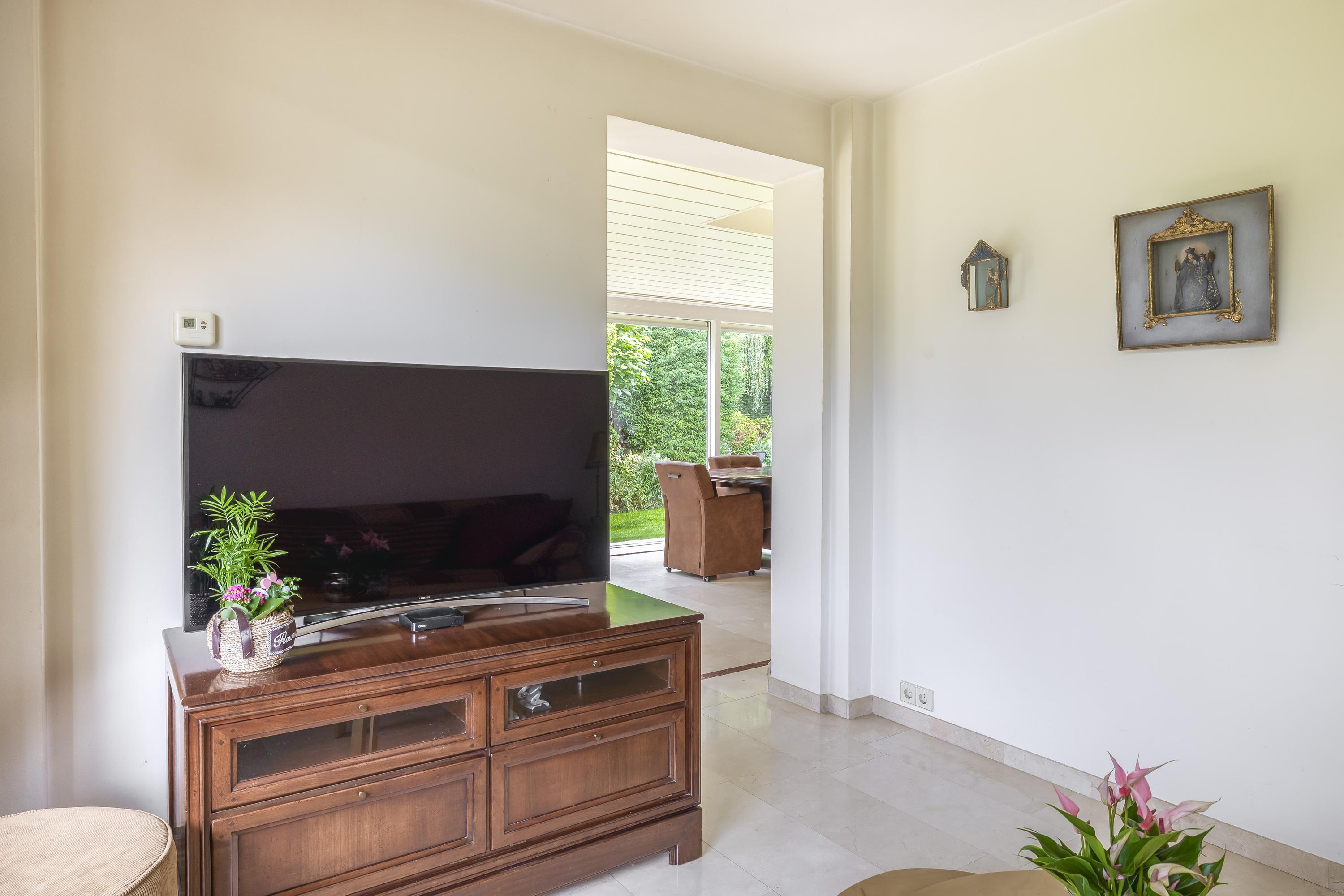 De living is ruim, licht en door de grote ramen aan drie zijden ervaar je een bijna panoramisch uitzicht op het groen rondom het huis. De schuifpui aan de achterzijde geeft toegang tot het terras en de tuin, waar je in alle rust kunt genieten van het zonnetje en het uitzicht op het water. De eetkamer grenst direct aan het terras, wat zorgt voor een fijne interactie tussen binnen en buiten.