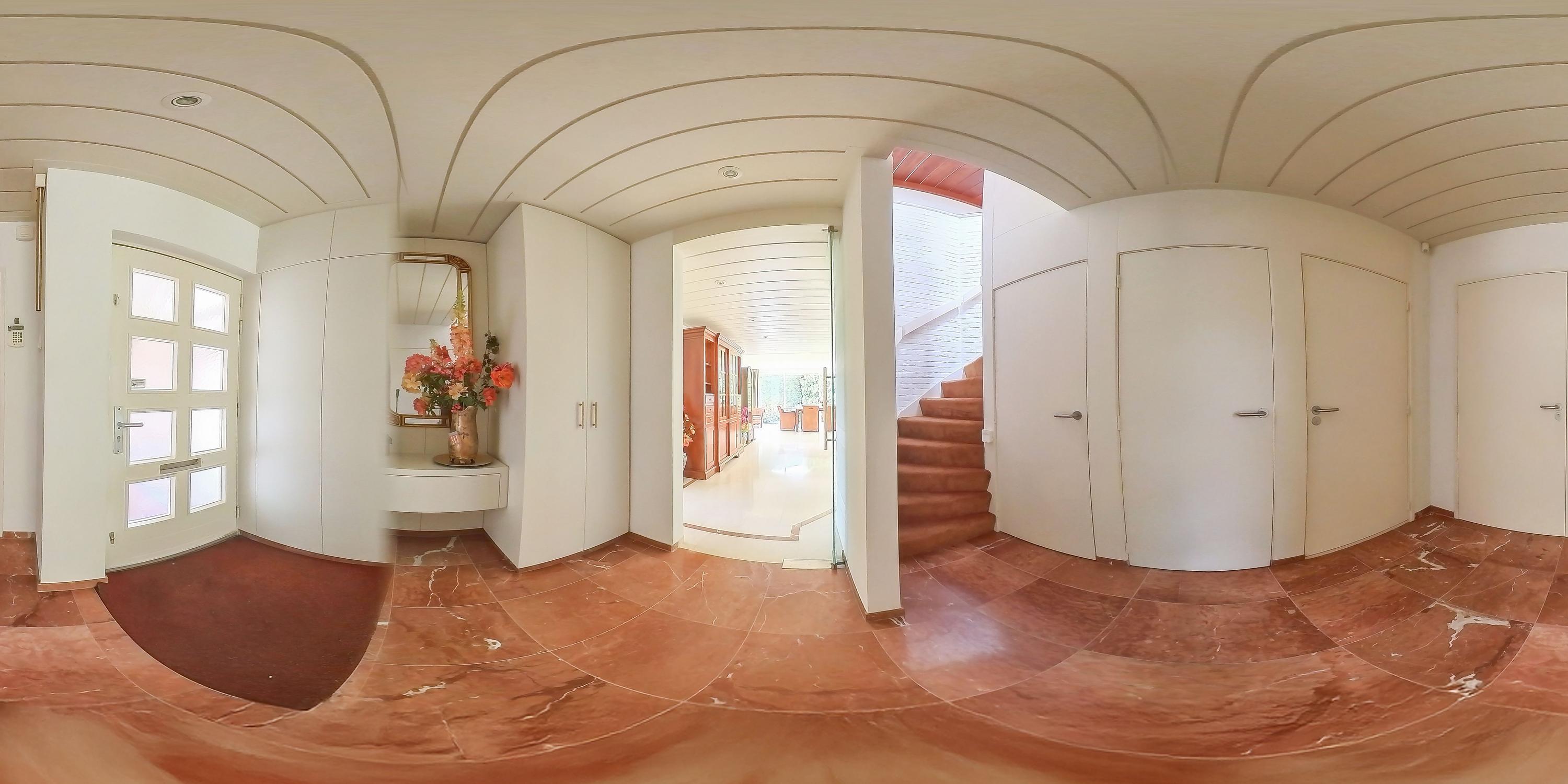 Je komt binnen via een overdekte entree in een royale hal met directe doorgang naar de woonkamer.