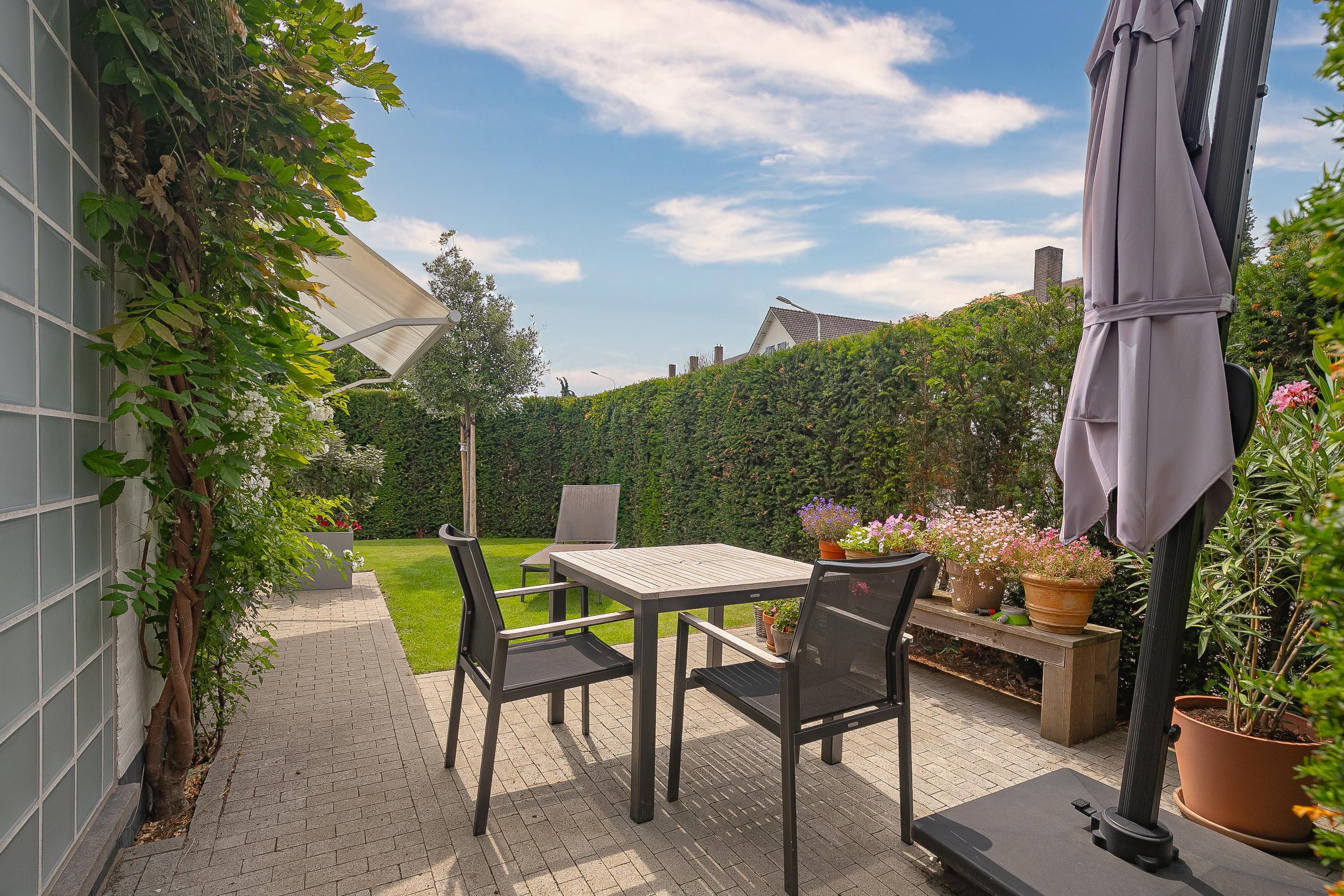 Via de schuifpui aan de voorzijde komt u in de gezellige, groene voortuin, een heerlijke plek om van de avondzon te genieten. Aan de achterzijde geven openslaande deuren toegang tot de beschutte stadstuin op het noordoosten, met zonnescherm en meerdere zitplekken.