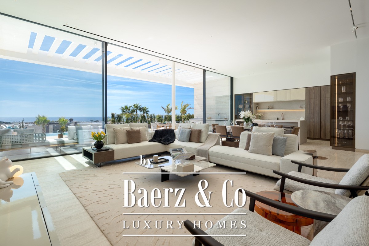Inside, the open-plan layout flows seamlessly between the living, dining, and kitchen areas, enhanced by floor-to-ceiling sliding doors that connect the interior to the terraces. The design features a clean, neutral palette and high-end finishes throughout. With six spacious, elegantly designed bedrooms, the home combines comfort with contemporary style.