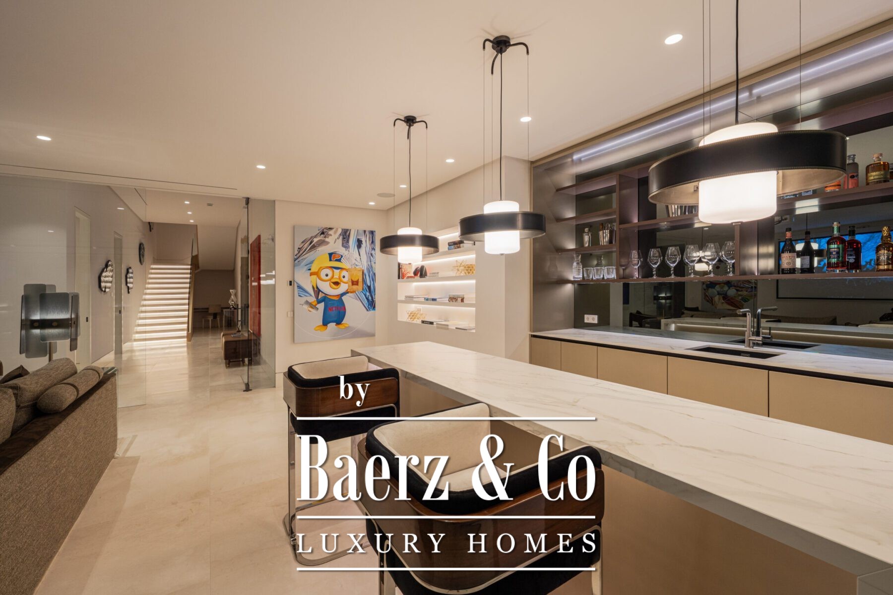 De open leefruimte creëert samenhang en ruimtelijk overzicht, zodat het daglicht vrij zijn weg vindt. Fijne details en zorgvuldig gekozen kunst geven iedere hoek een eigen karakter, terwijl de keuken – uitgerust met de nieuwste inbouwapparatuur en een wijnklimaatkast – perfect is voor zowel dagelijkse rituelen als sociale momenten. Vijf slaapkamers en zes badkamers stralen subtiele grandeur uit, met dubbele wastafels, maatwerkdouches en vrijstaande baden.