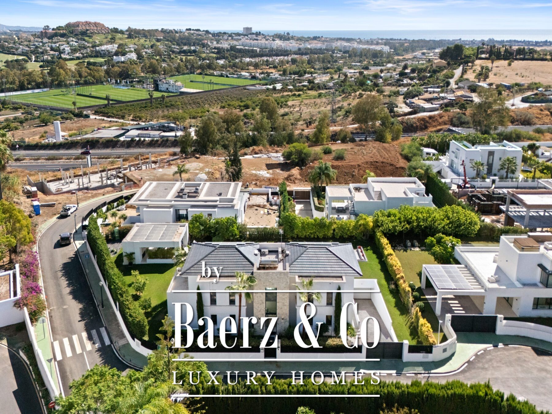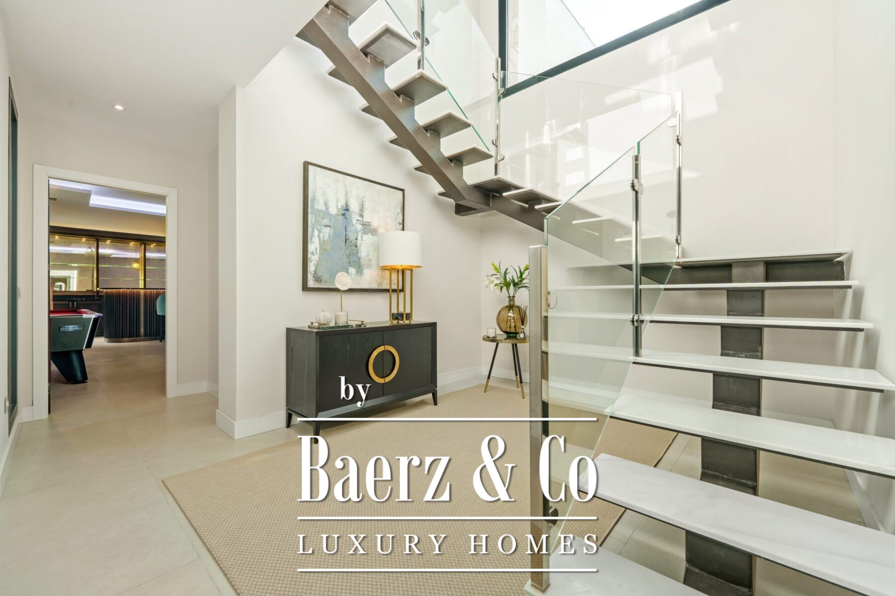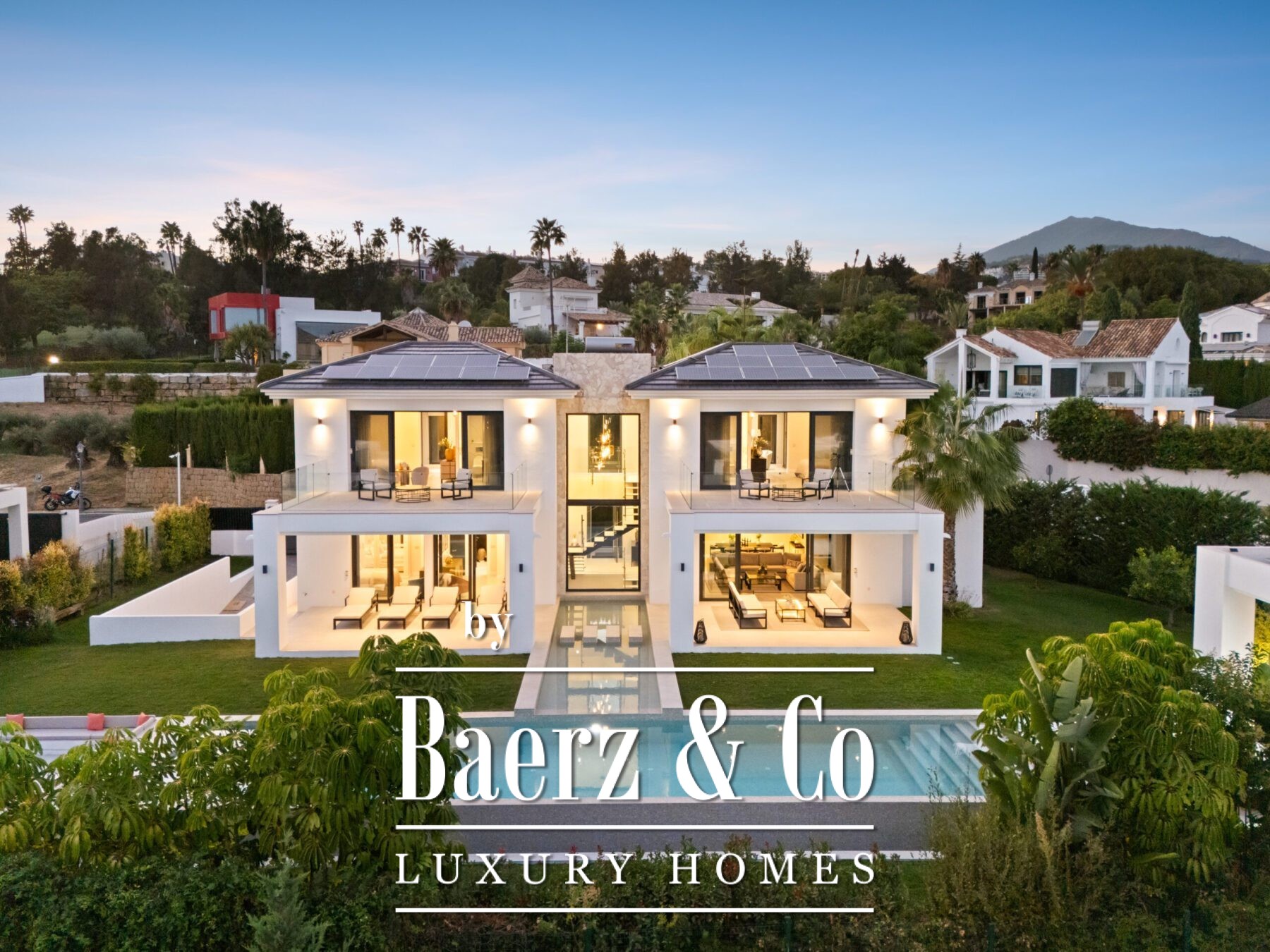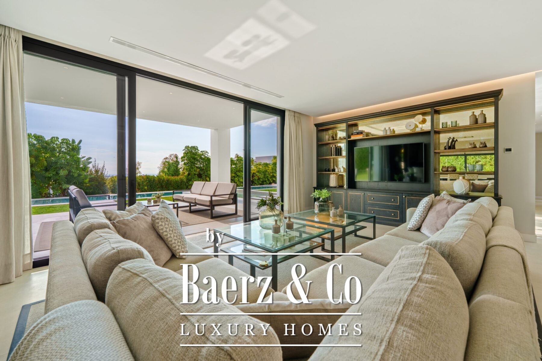 Deze eigentijdse villa in Marbella zet een nieuwe standaard voor modern wonen op een van de meest gewilde locaties van Marbella. De residentie biedt maar liefst 581 m² woonruimte, waar een flexibel open ontwerp de woonkamer, eetkamer en compleet uitgeruste keuken samenbrengt. Vloerhoge glazen schuifdeuren verbinden het interieur moeiteloos met buiten, zodat het natuurlijke licht binnenvalt en u uitzicht geniet over het privéperceel van 1.231 m².