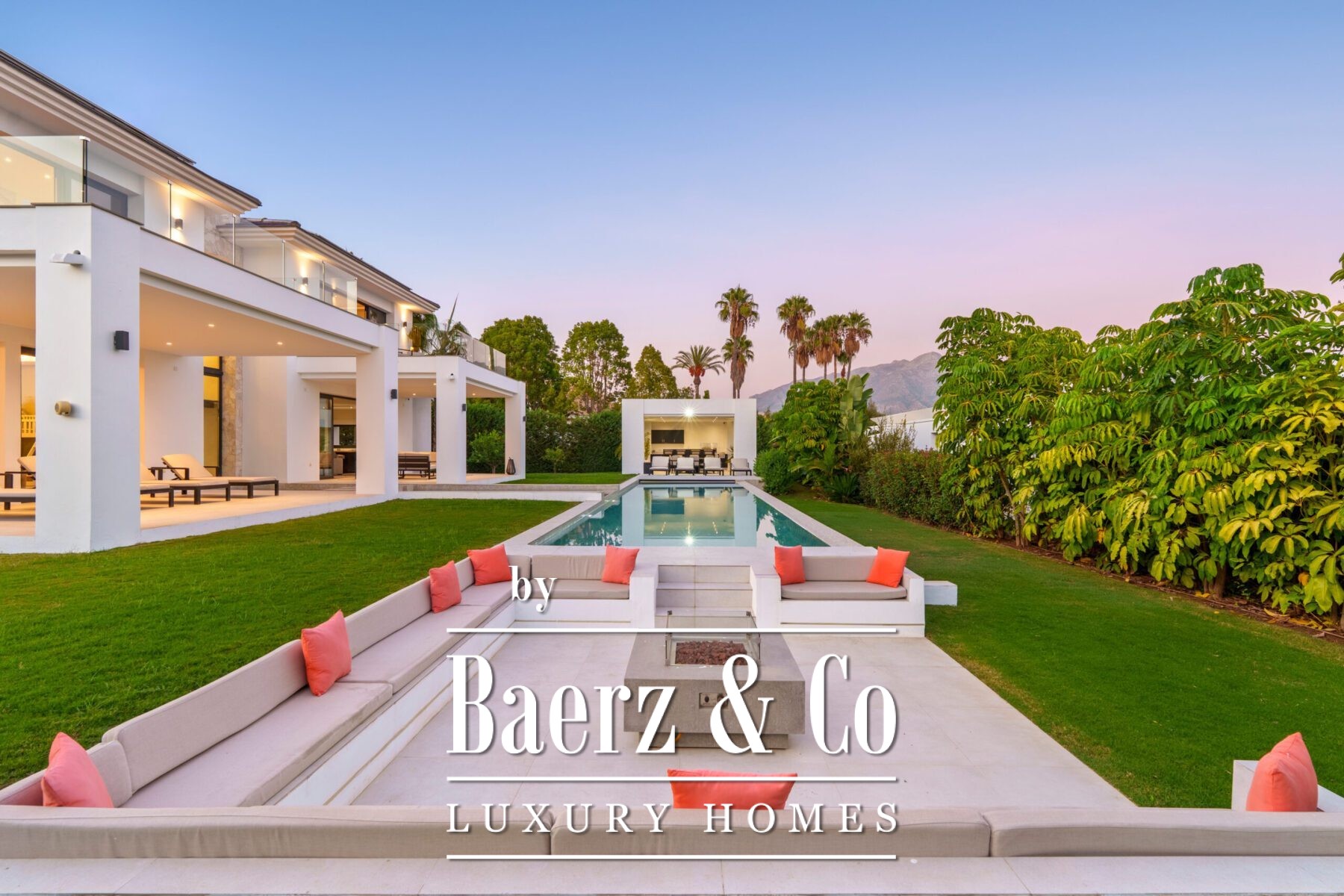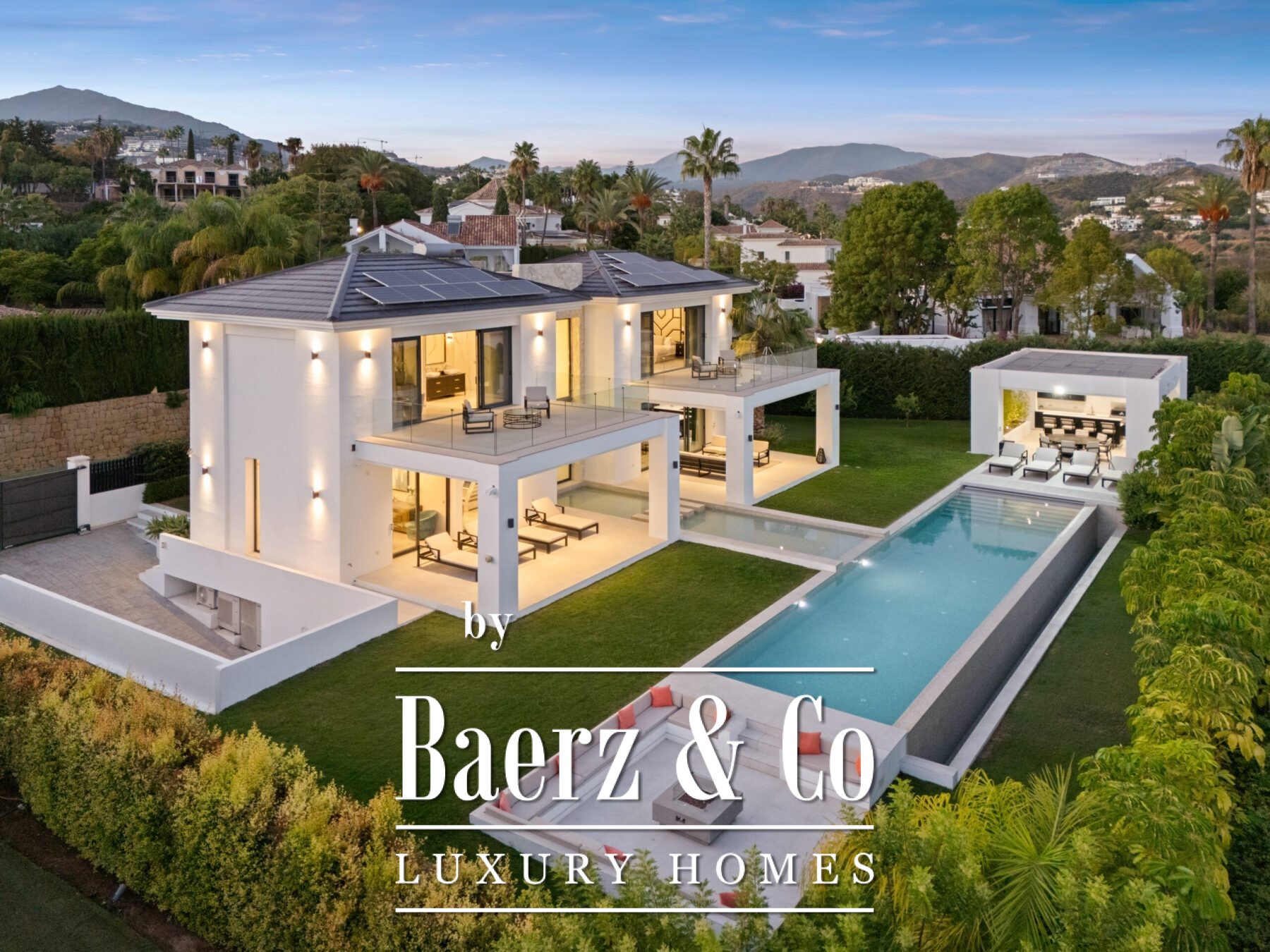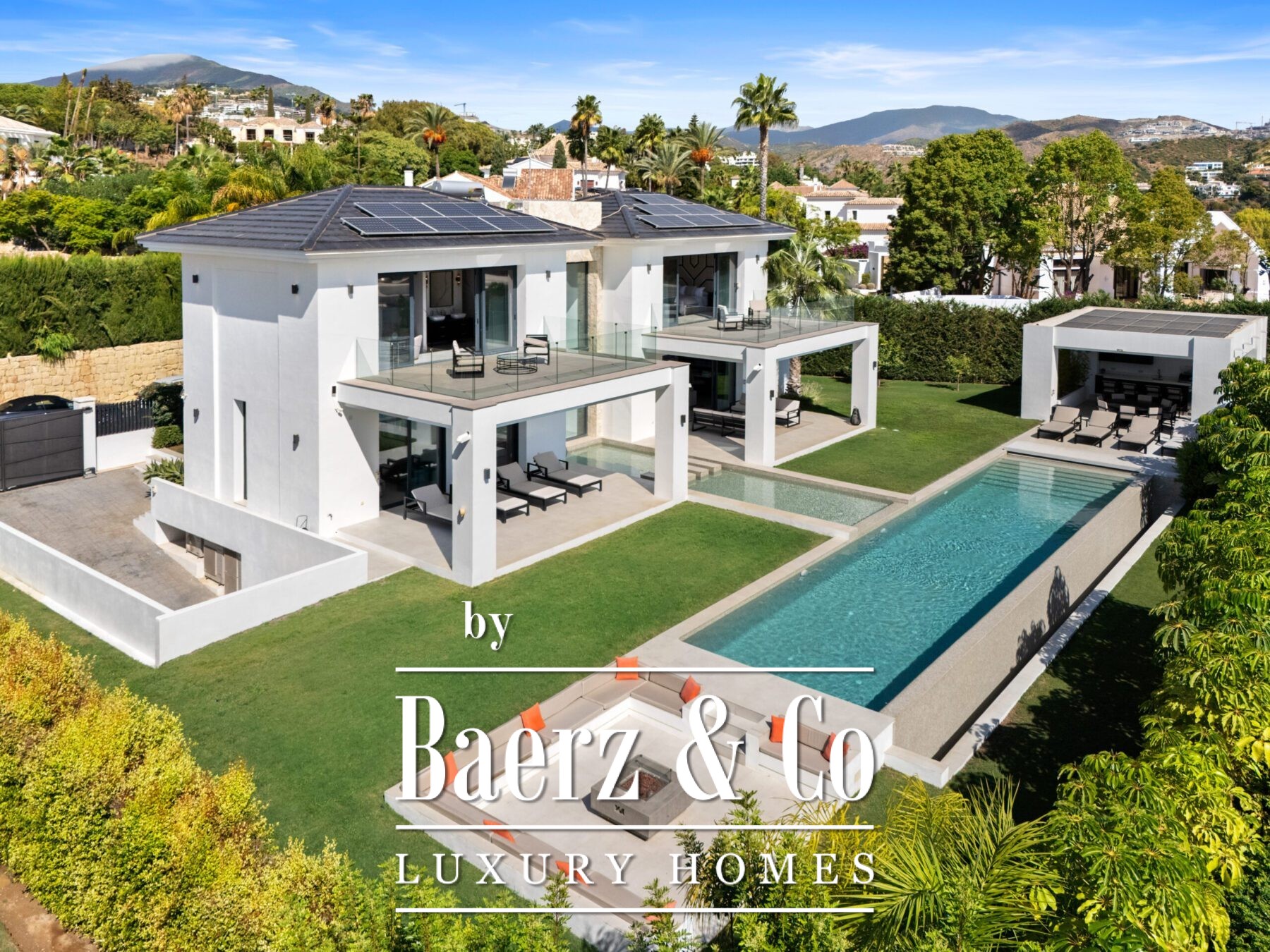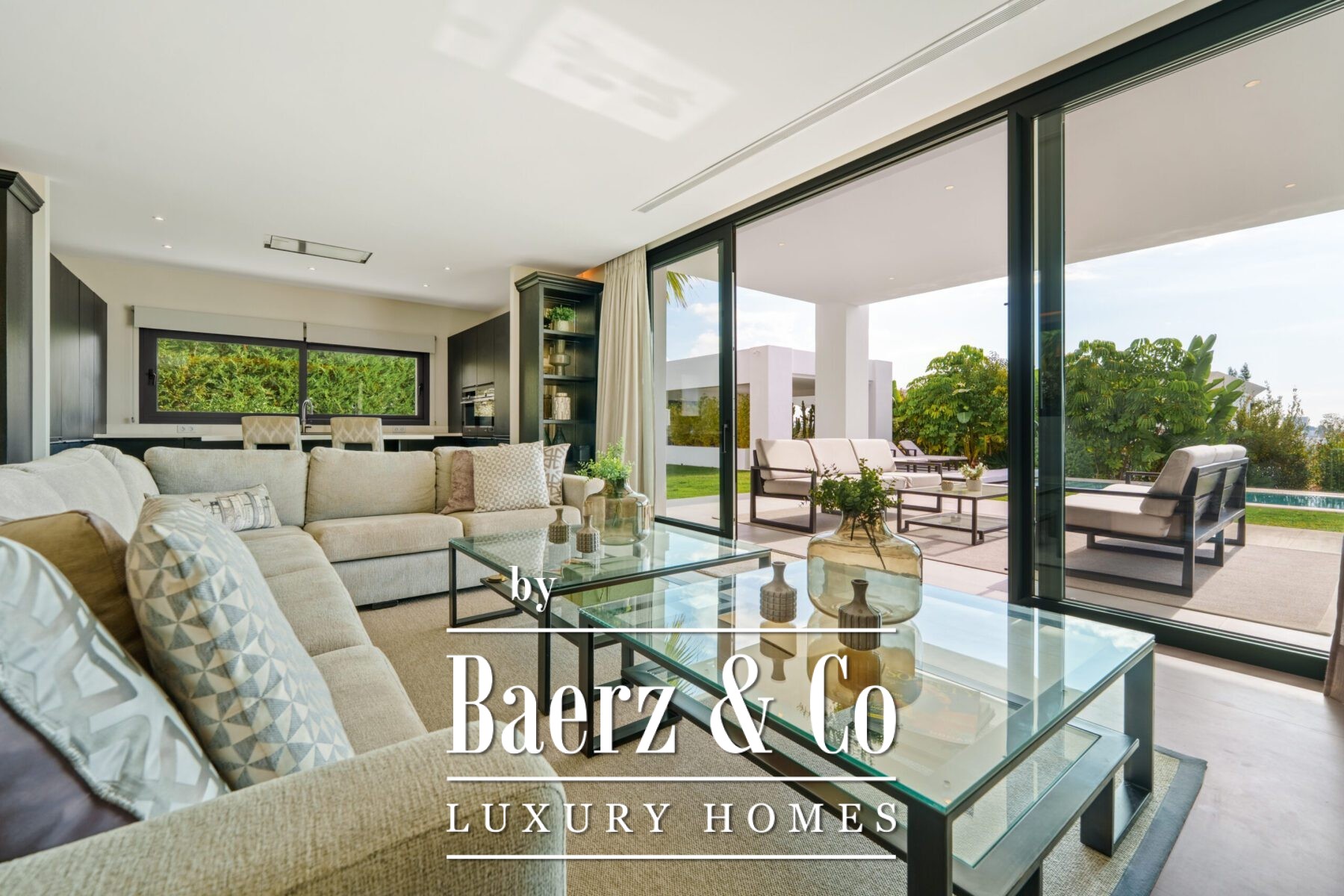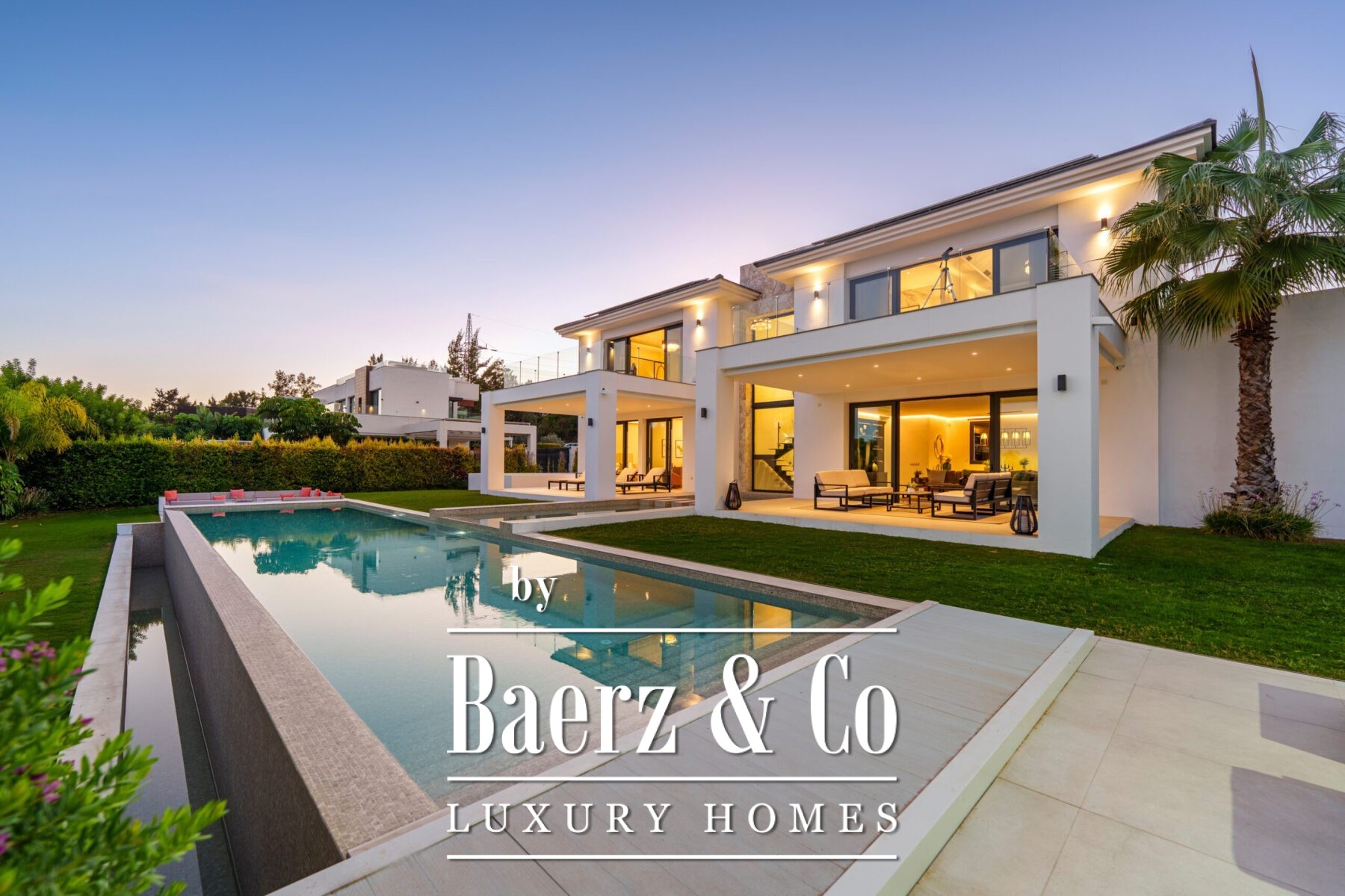 Deze eigentijdse villa in Marbella zet een nieuwe standaard voor modern wonen op een van de meest gewilde locaties van Marbella. De residentie biedt maar liefst 581 m² woonruimte, waar een flexibel open ontwerp de woonkamer, eetkamer en compleet uitgeruste keuken samenbrengt. Vloerhoge glazen schuifdeuren verbinden het interieur moeiteloos met buiten, zodat het natuurlijke licht binnenvalt en u uitzicht geniet over het privéperceel van 1.231 m².