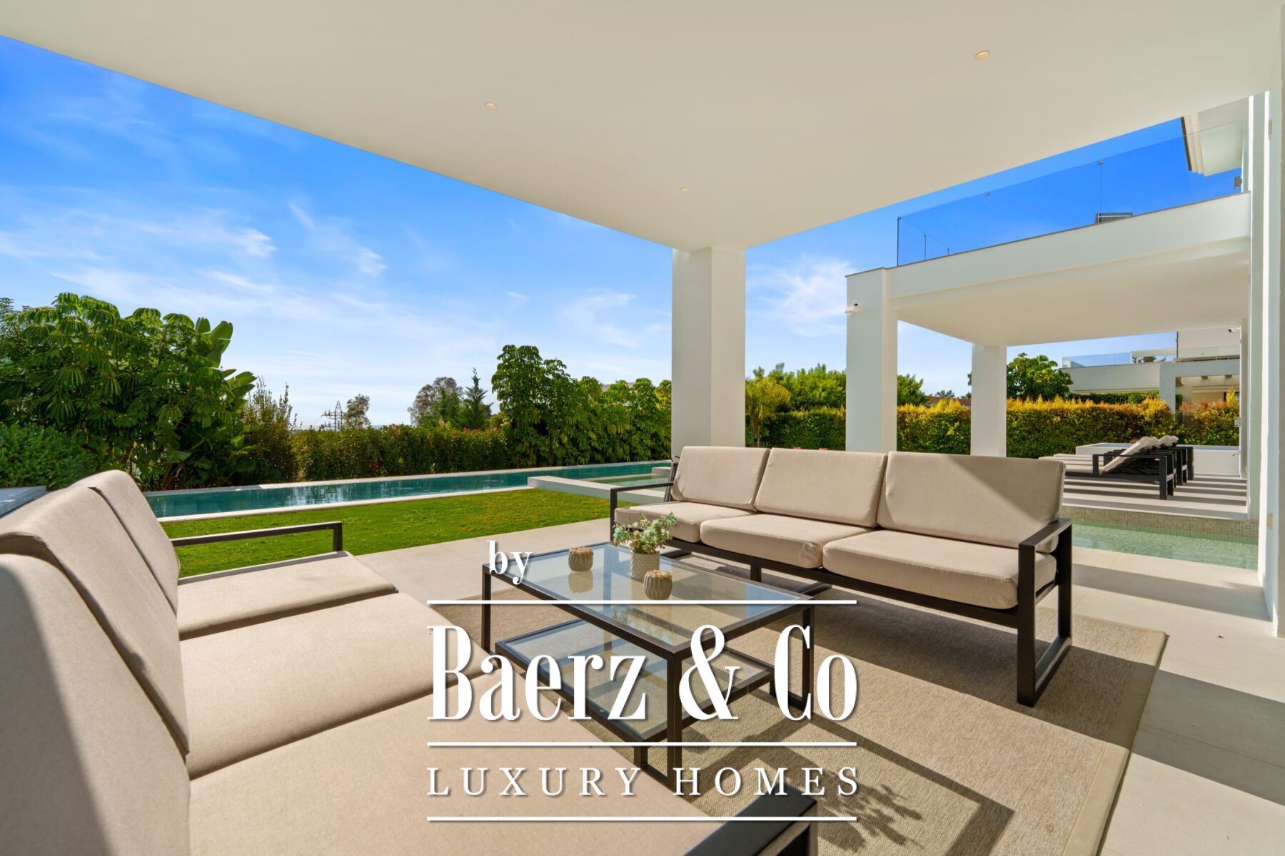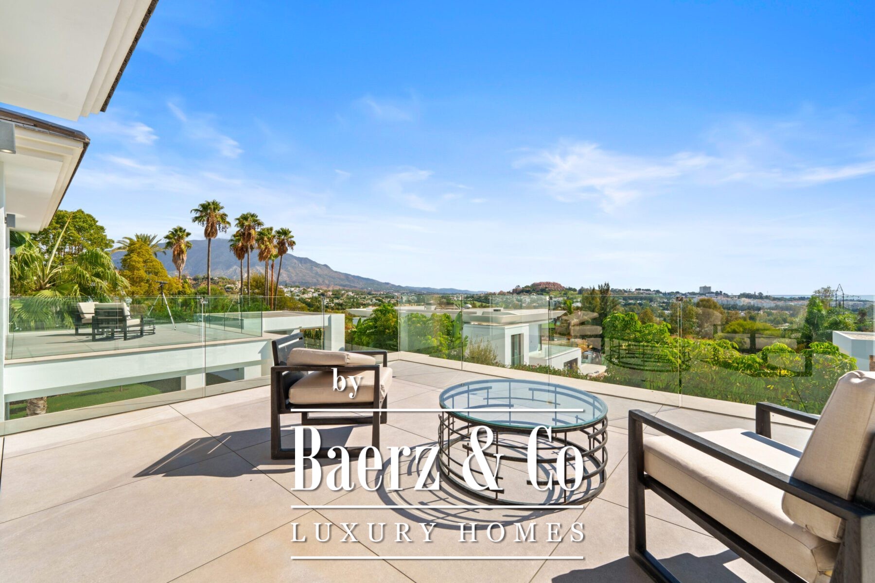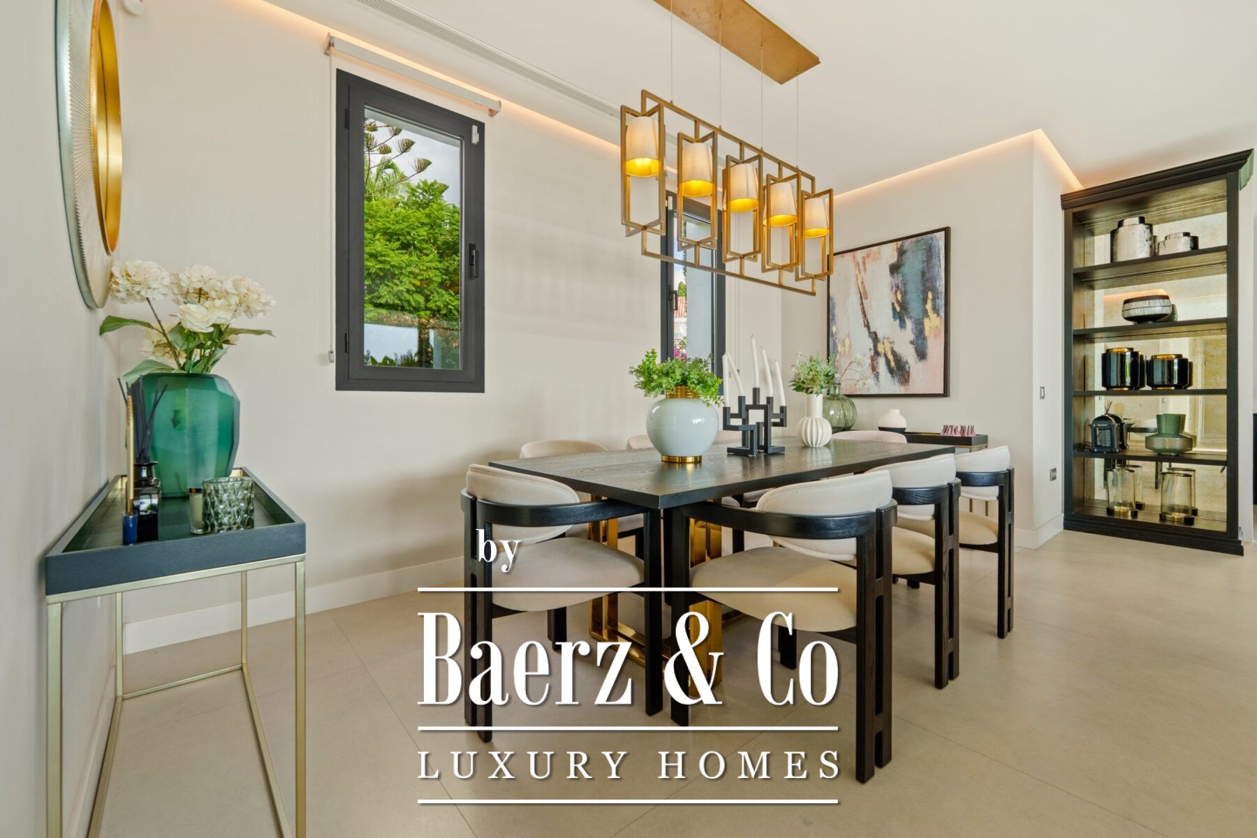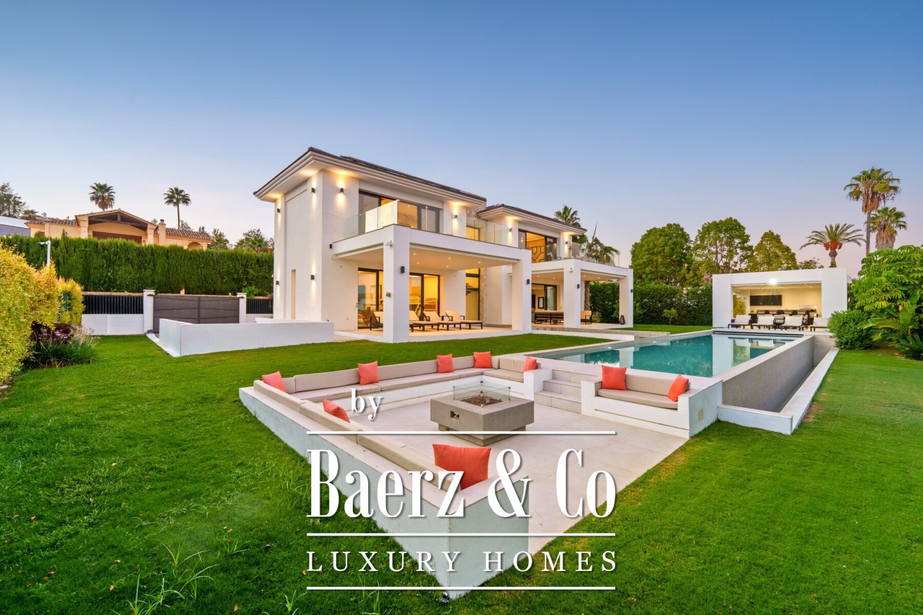 Deze eigentijdse villa in Marbella zet een nieuwe standaard voor modern wonen op een van de meest gewilde locaties van Marbella. De residentie biedt maar liefst 581 m² woonruimte, waar een flexibel open ontwerp de woonkamer, eetkamer en compleet uitgeruste keuken samenbrengt. Vloerhoge glazen schuifdeuren verbinden het interieur moeiteloos met buiten, zodat het natuurlijke licht binnenvalt en u uitzicht geniet over het privéperceel van 1.231 m².