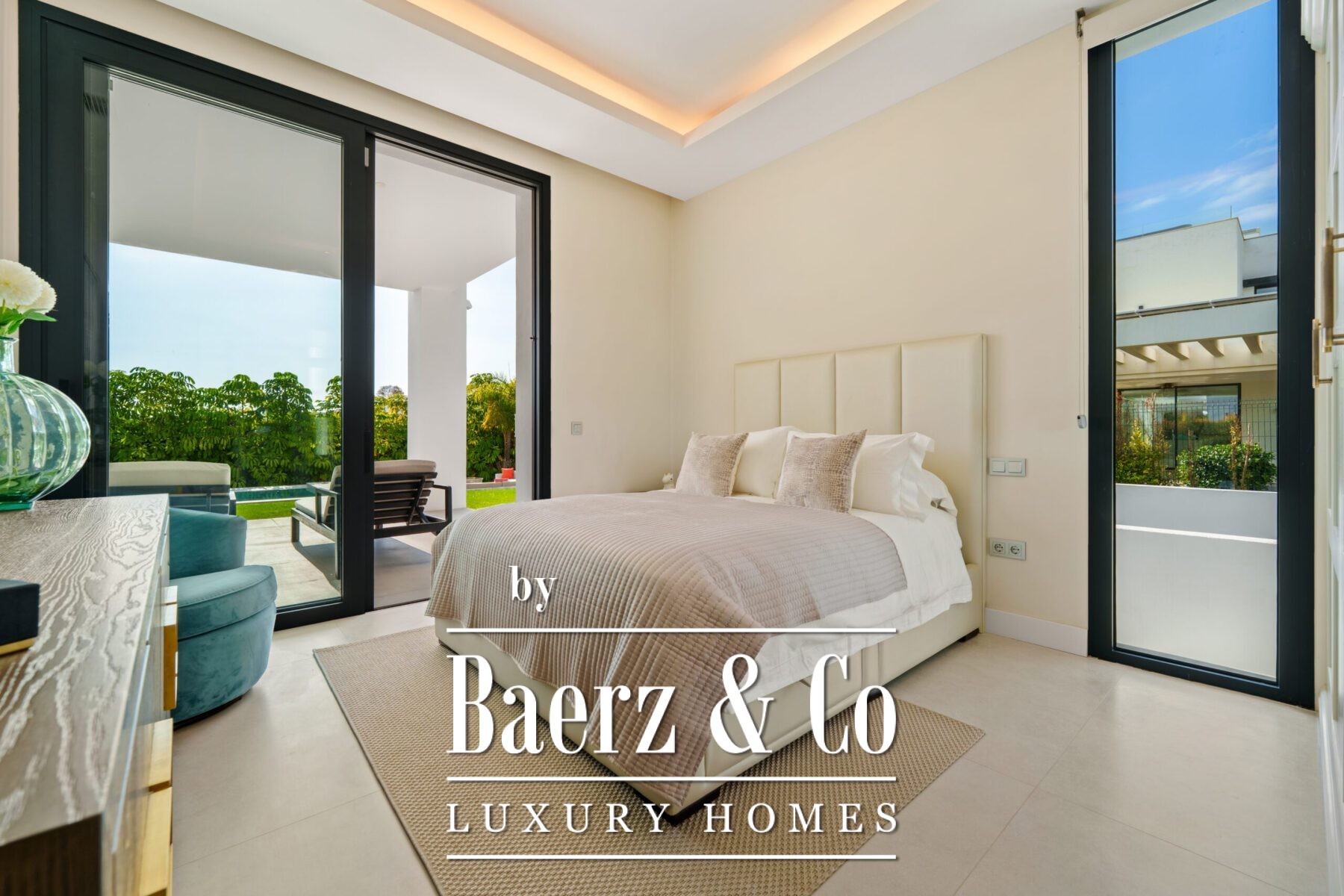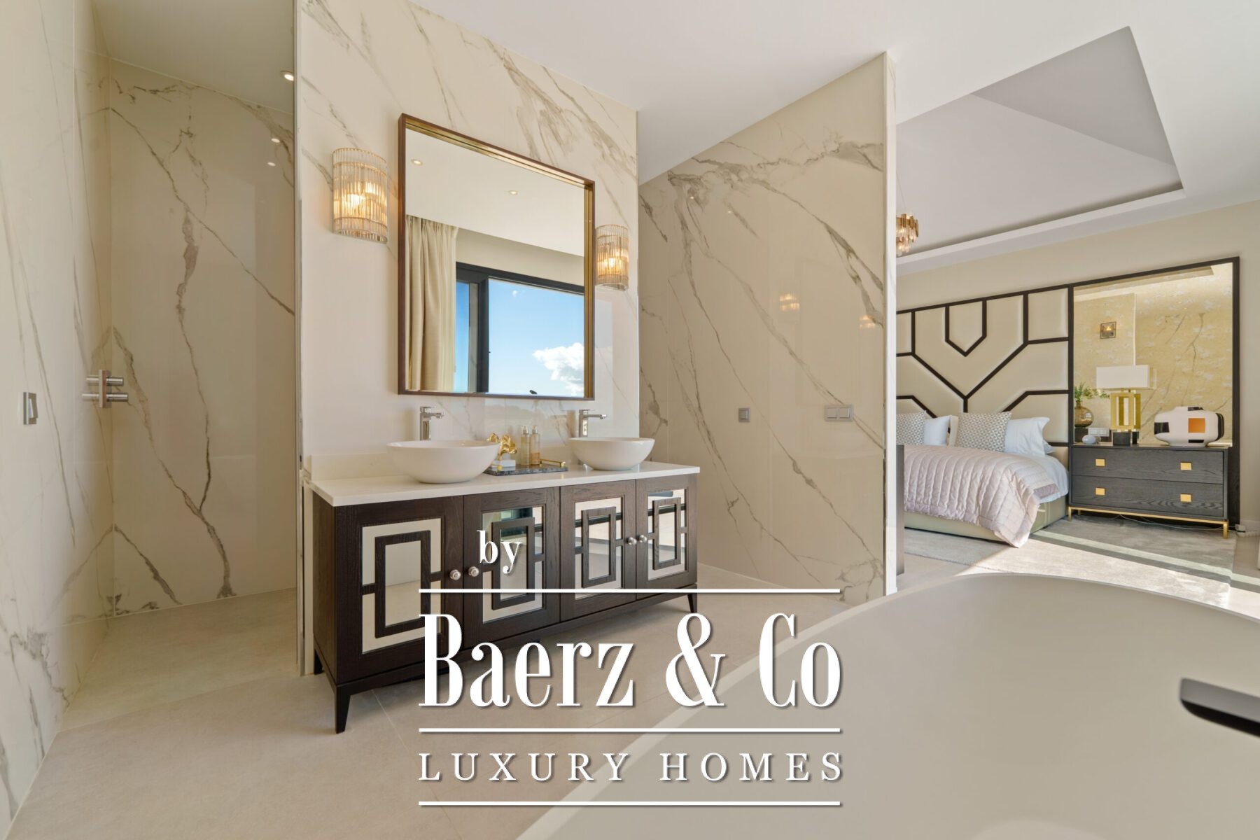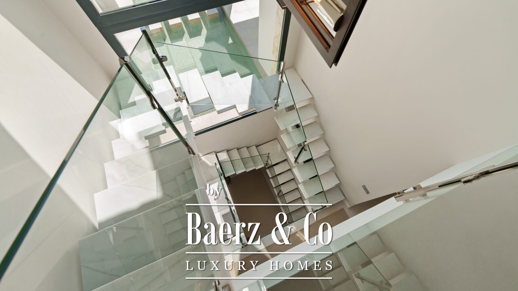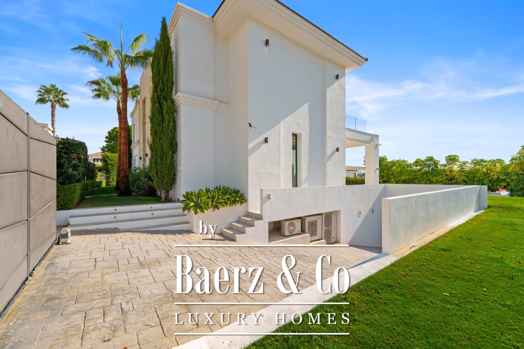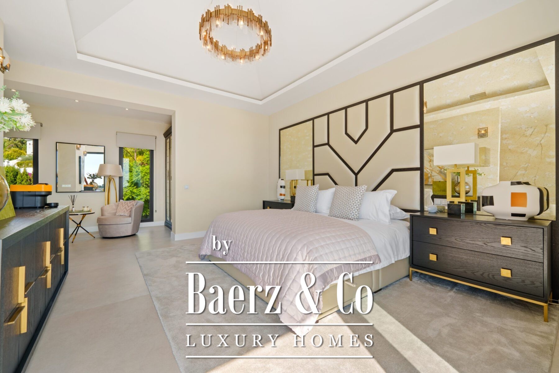 Deze eigentijdse villa in Marbella zet een nieuwe standaard voor modern wonen op een van de meest gewilde locaties van Marbella. De residentie biedt maar liefst 581 m² woonruimte, waar een flexibel open ontwerp de woonkamer, eetkamer en compleet uitgeruste keuken samenbrengt. Vloerhoge glazen schuifdeuren verbinden het interieur moeiteloos met buiten, zodat het natuurlijke licht binnenvalt en u uitzicht geniet over het privéperceel van 1.231 m².