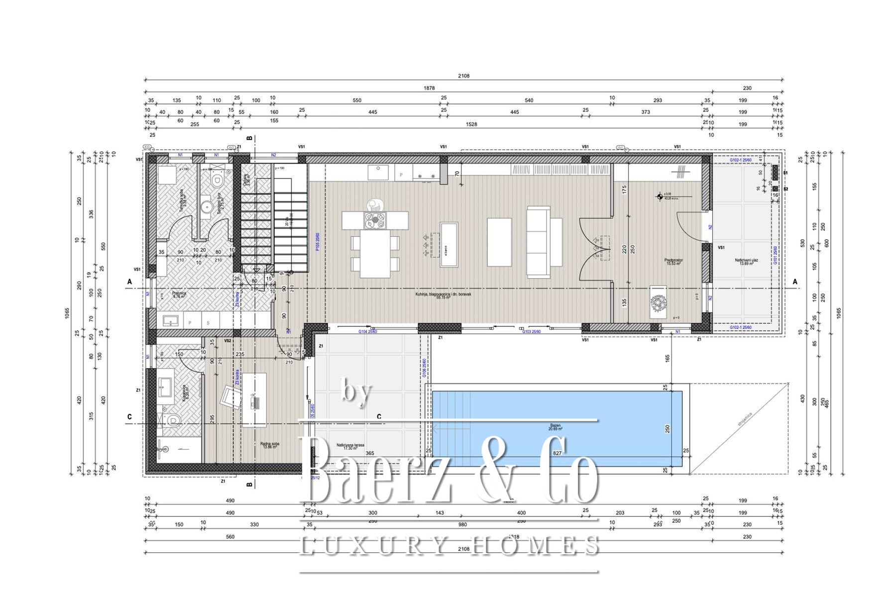 Villa Premantura Medulin ligt op een fraai aangelegd perceel van 710 m² aan de zuidrand van het Istrische schiereiland. De woning beslaat 205 m² en ademt rust dankzij sobere architectonische lijnen en het natuurlijke licht dat elke ruimte vormgeeft. De royale woonkamer op de begane grond verwelkomt u met warme tinten, maatwerkmeubilair en een sfeerbepalende open haard. Kamerhoge raampartijen bieden uitzicht op het zwembad en de tuin, waardoor binnen en buiten naadloos in elkaar overlopen. Een comfortabele keuken, een slaapkamer, een gastentoilet, diverse utiliteitsruimten en toegang tot de achtertuin faciliteren zowel ontspannen wonen als praktisch gebruik.