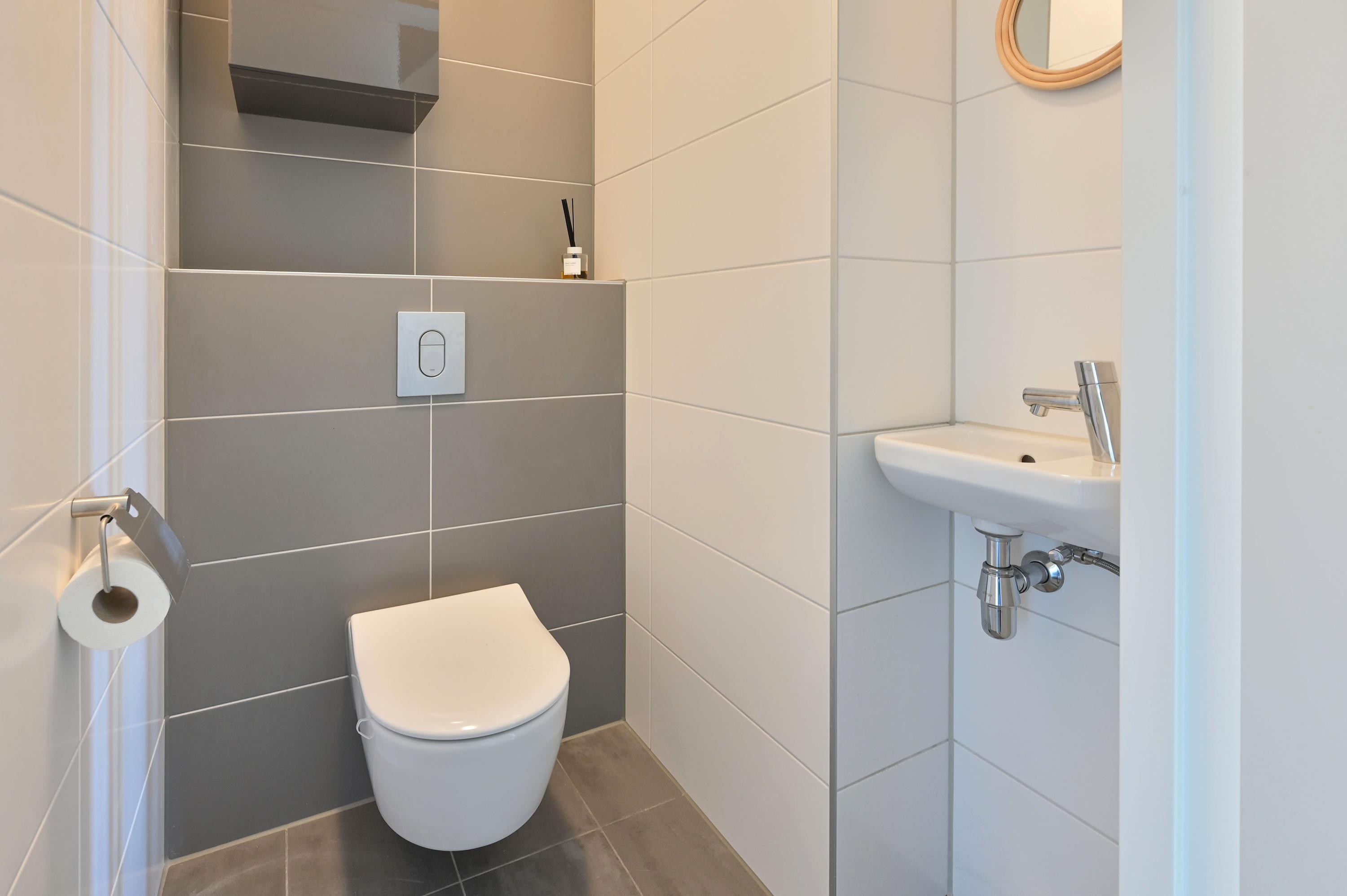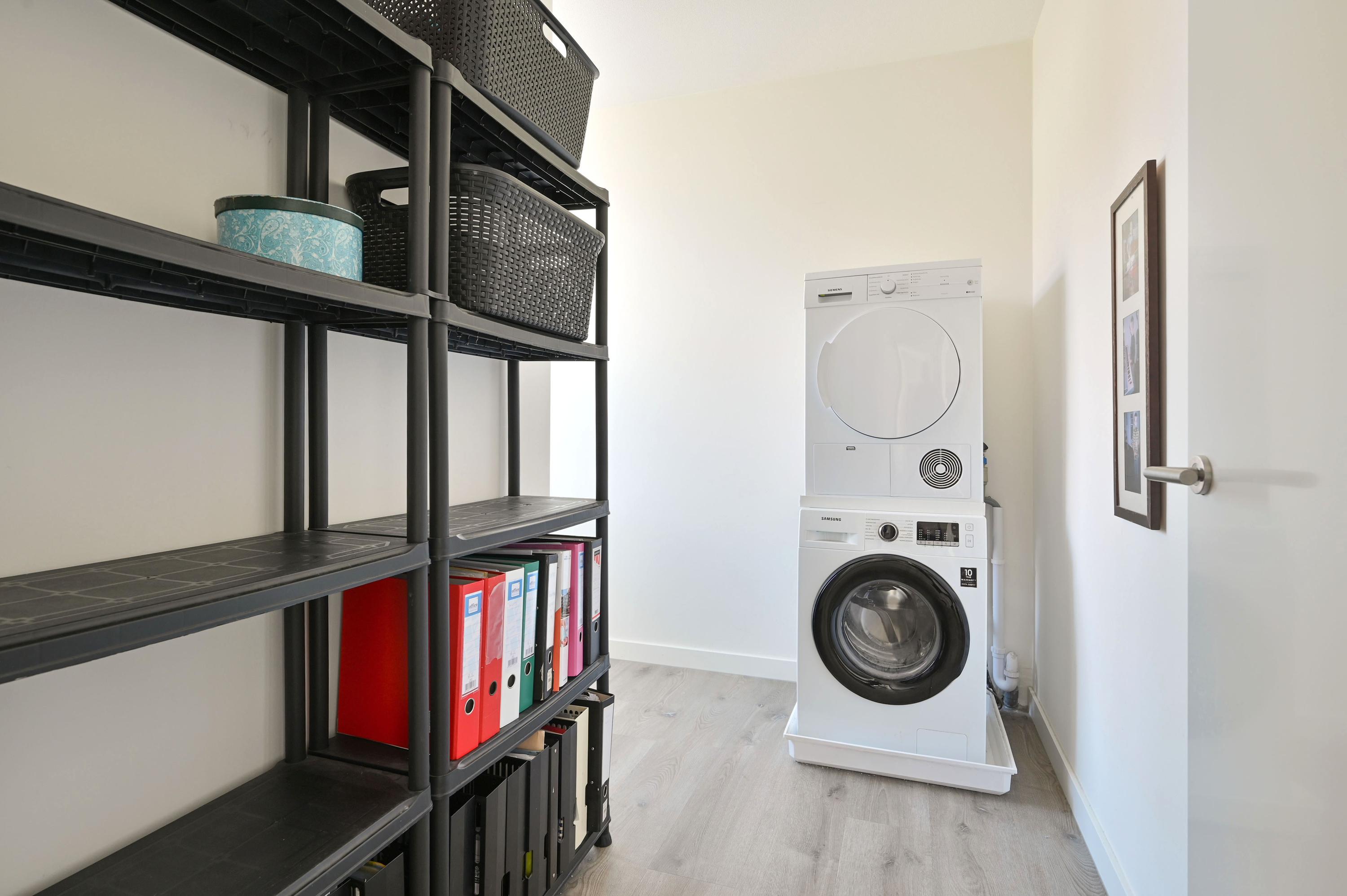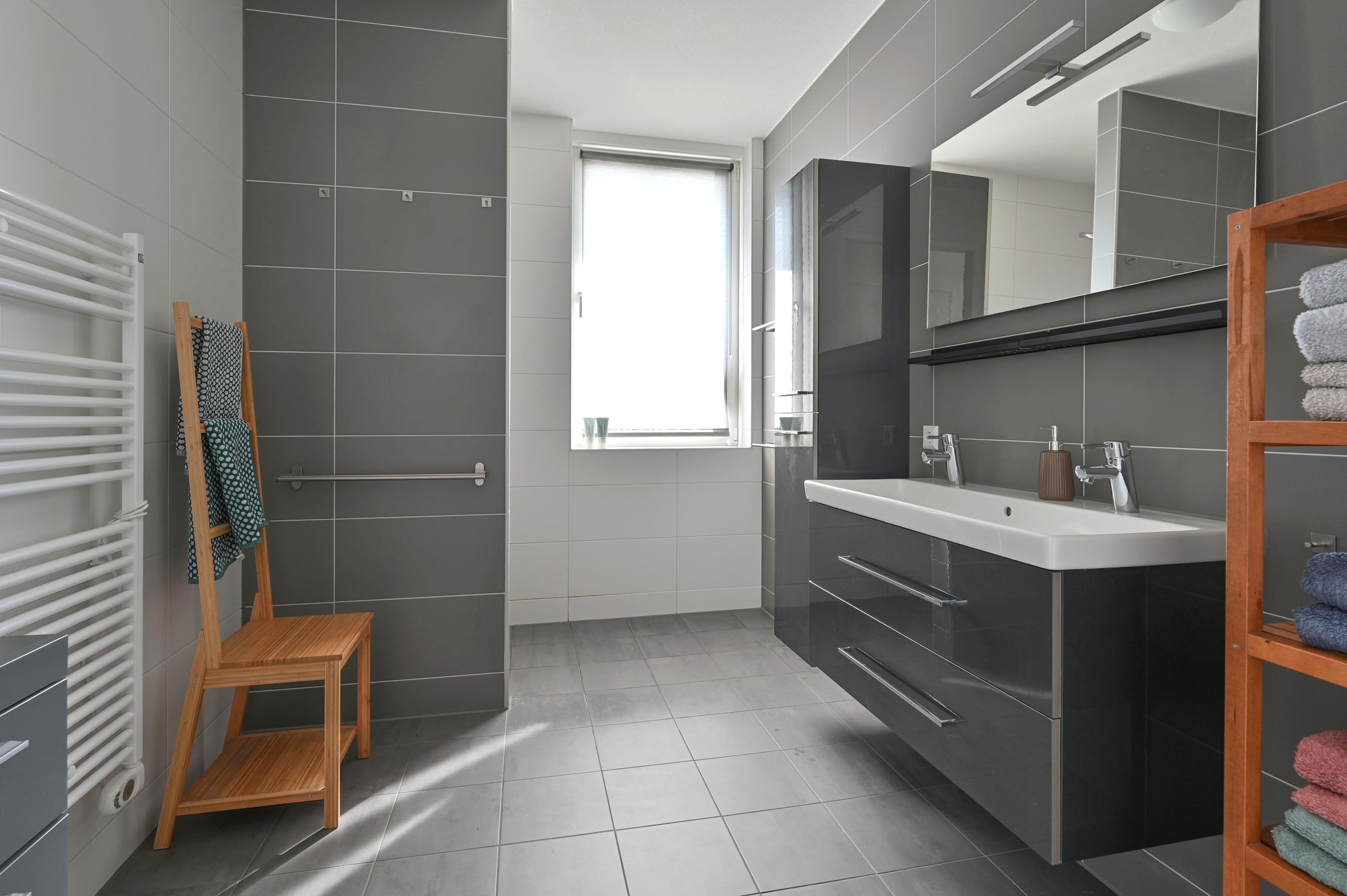 Via de vaste trap bereikt u de royale overloop, die toegang biedt tot alle vertrekken op deze verdieping. Direct links bevindt zich een praktische wasruimte met raam, voorzien van aansluitingen voor de wasmachine en de wasdroger, én genoeg ruimte voor extra opslag. Naast deze ruimte ligt een grote slaapkamer of logeerkamer, heerlijk licht dankzij het hoekraam en een extra raam. Aan de overzijde van de overloop vindt u een modern afgewerkt, separaat toilet met fontein in stijlvolle grijs-witte tinten. Daartegenover ligt de riante badkamer met raam, inloopdouche voorzien van stortdouche en handdouche, een dubbele wastafel met lades, spiegel met verlichting en een extra wandmeubel. De ruimte biedt bovendien voldoende mogelijkheden voor het plaatsen van een ligbad in de toekomst. Verder herbergt deze verdieping een technische ruimte met warmtepomp, boiler, WTW-installatie en de omvormer voor de 14 eigen zonnepanelen – met daarnaast nog volop bergruimte. Aan het einde van de gang bevinden zich weer twee royale slaapkamers: links de hoofdslaapkamer met groot hoekraam, rechts een ruime kamer met hoekraam, momenteel in gebruik als werkkamer. Over de gehele verdieping ligt dezelfde onderhoudsvriendelijke pvc-vloer in warme houtlook als beneden, compleet met vloerverwarming. Alle ramen zijn voorzien van horren en elektrische screens, die worden gevoed door de zonnepanelen – een combinatie van luxe, comfort en duurzaamheid.