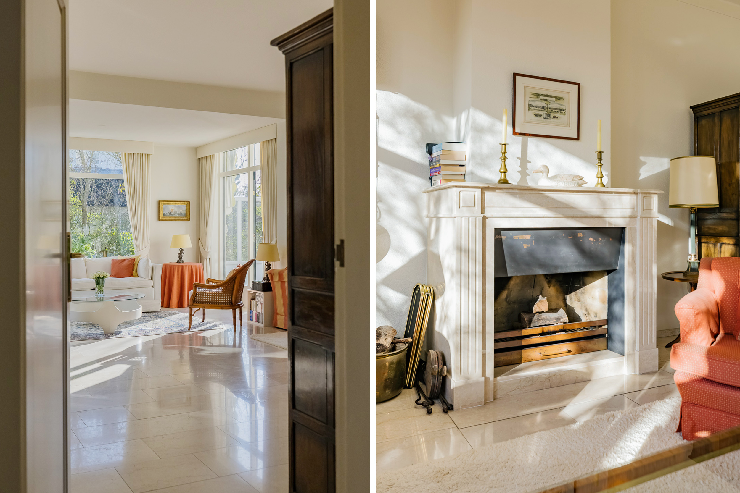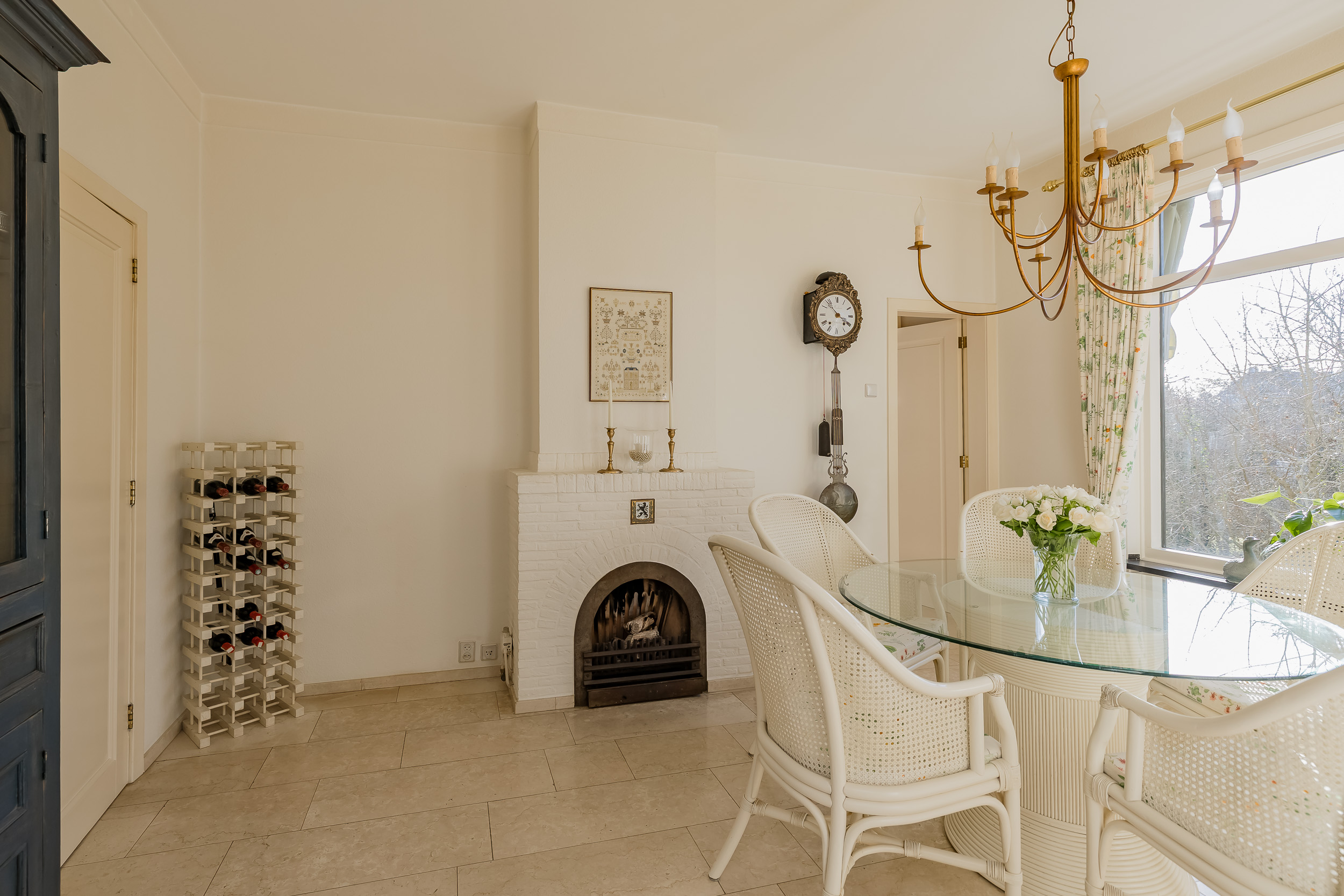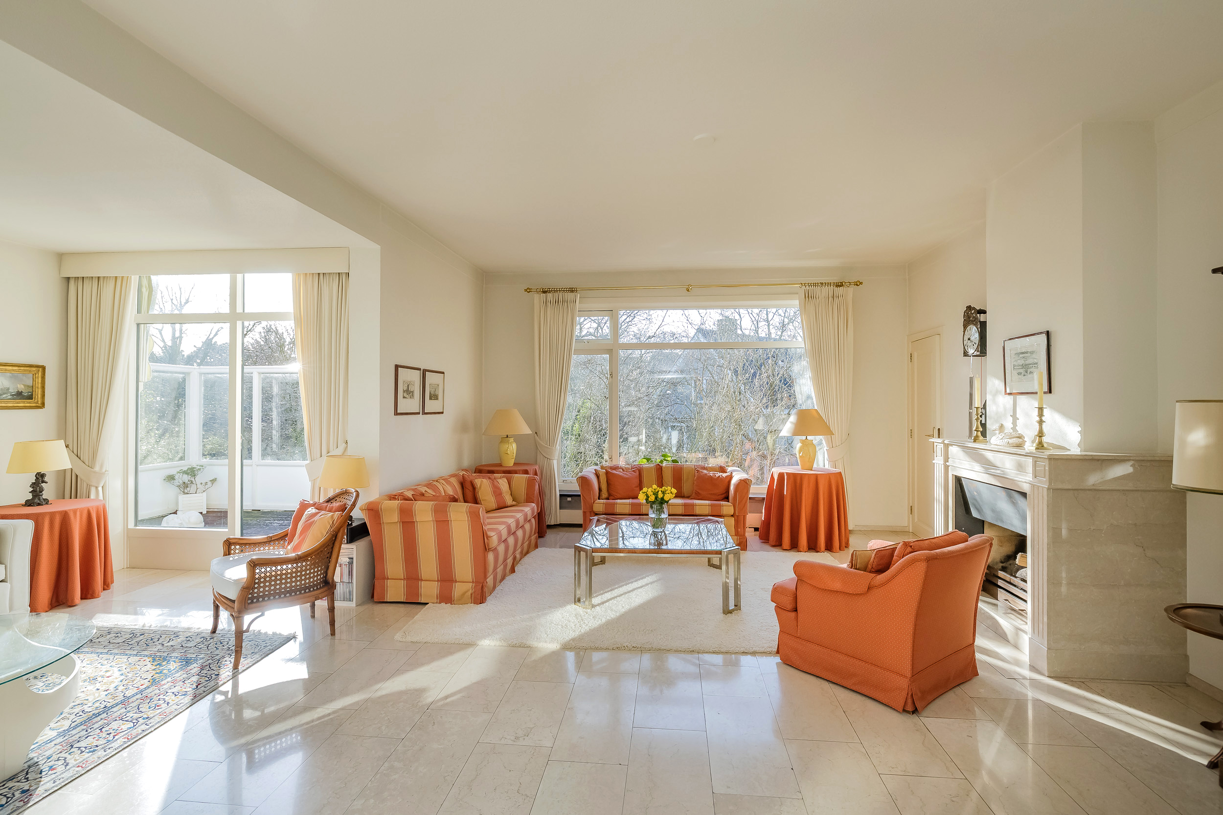 De royale woonkamer is een heerlijke leefruimte met een warme, uitnodigende sfeer. De open haard en de elegante marmeren vloer geven de ruimte karakter, terwijl de deuren vanuit de woonkamer zorgen voor een directe verbinding met de tuin. De zon draait van ’s-ochtends tot ’s-avonds om het huis wat voor een prachtige lichtinval zorgt.
