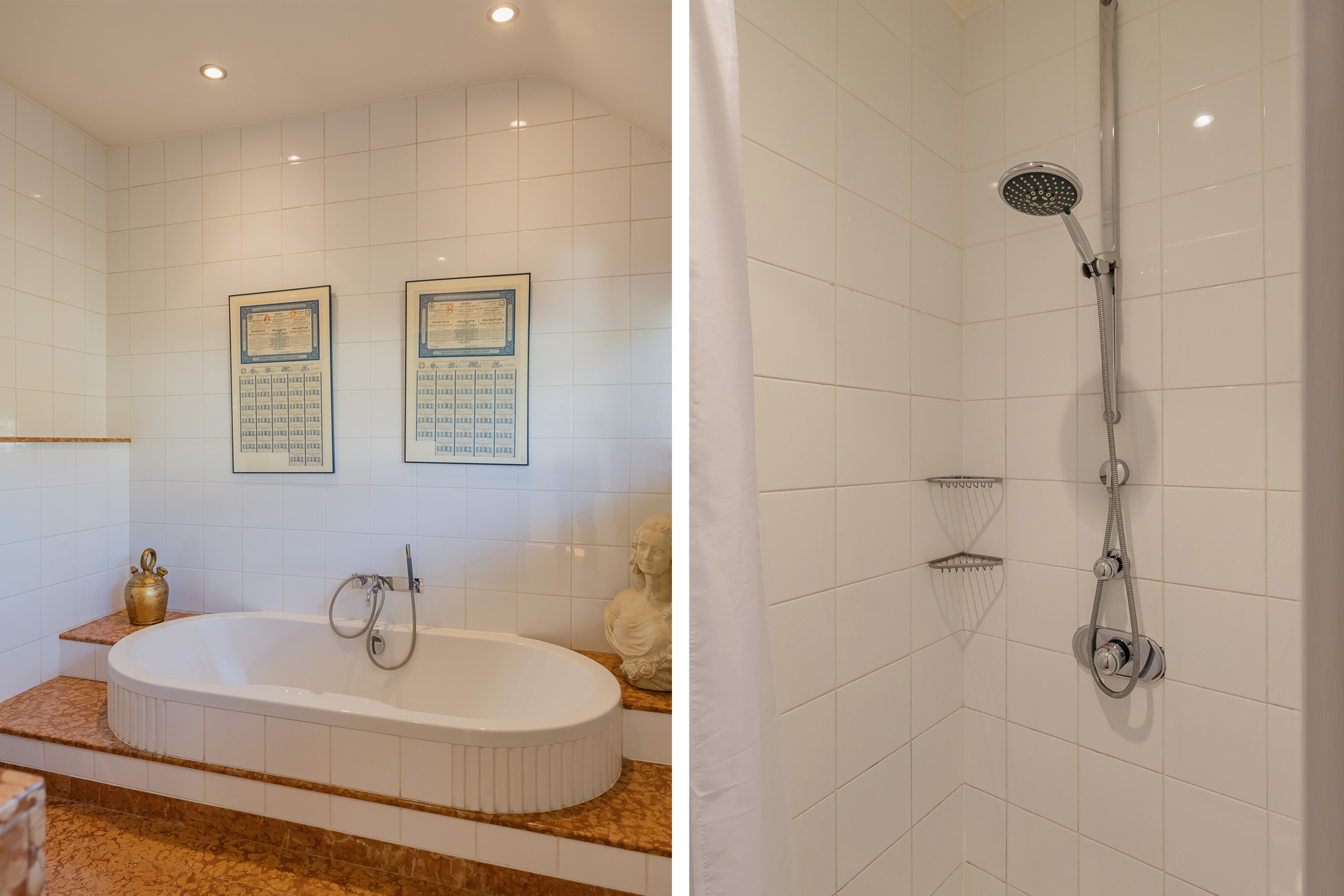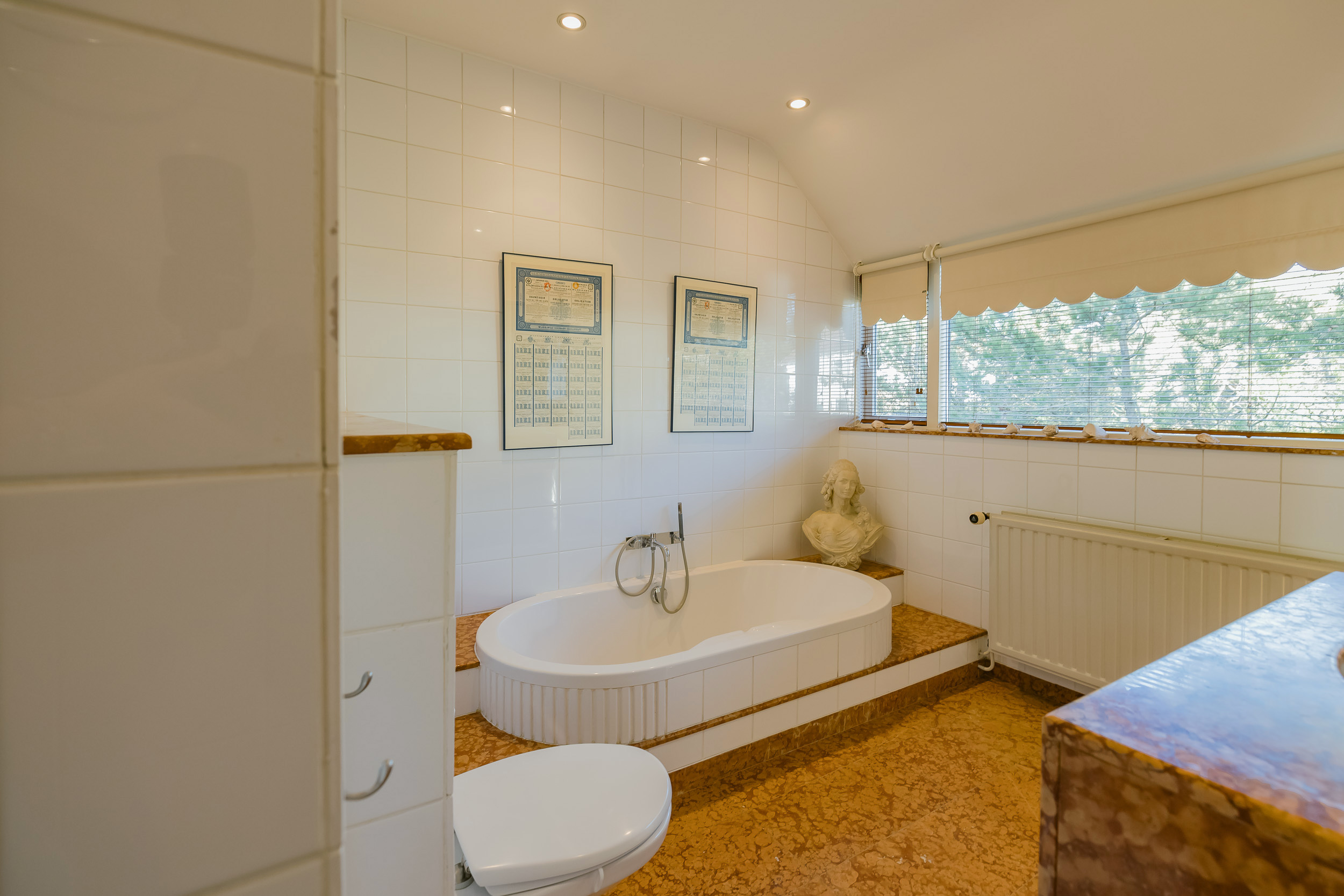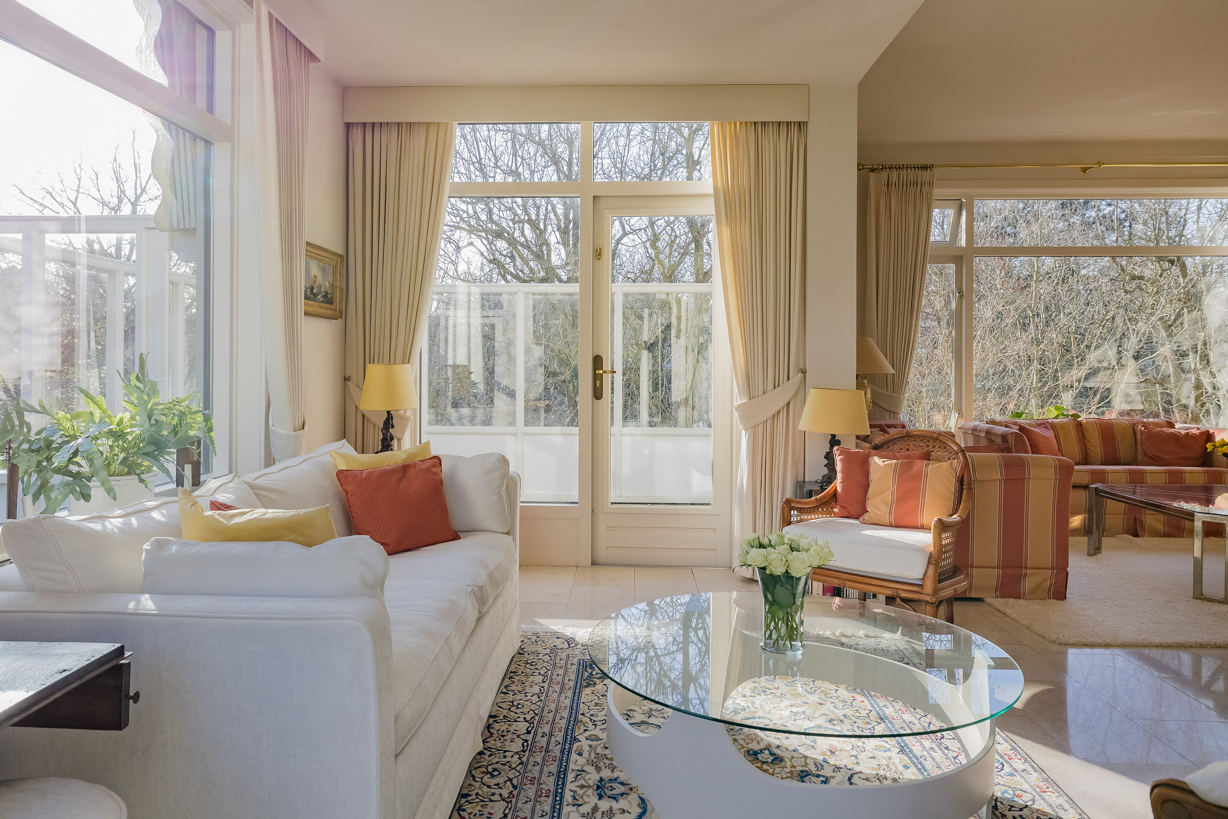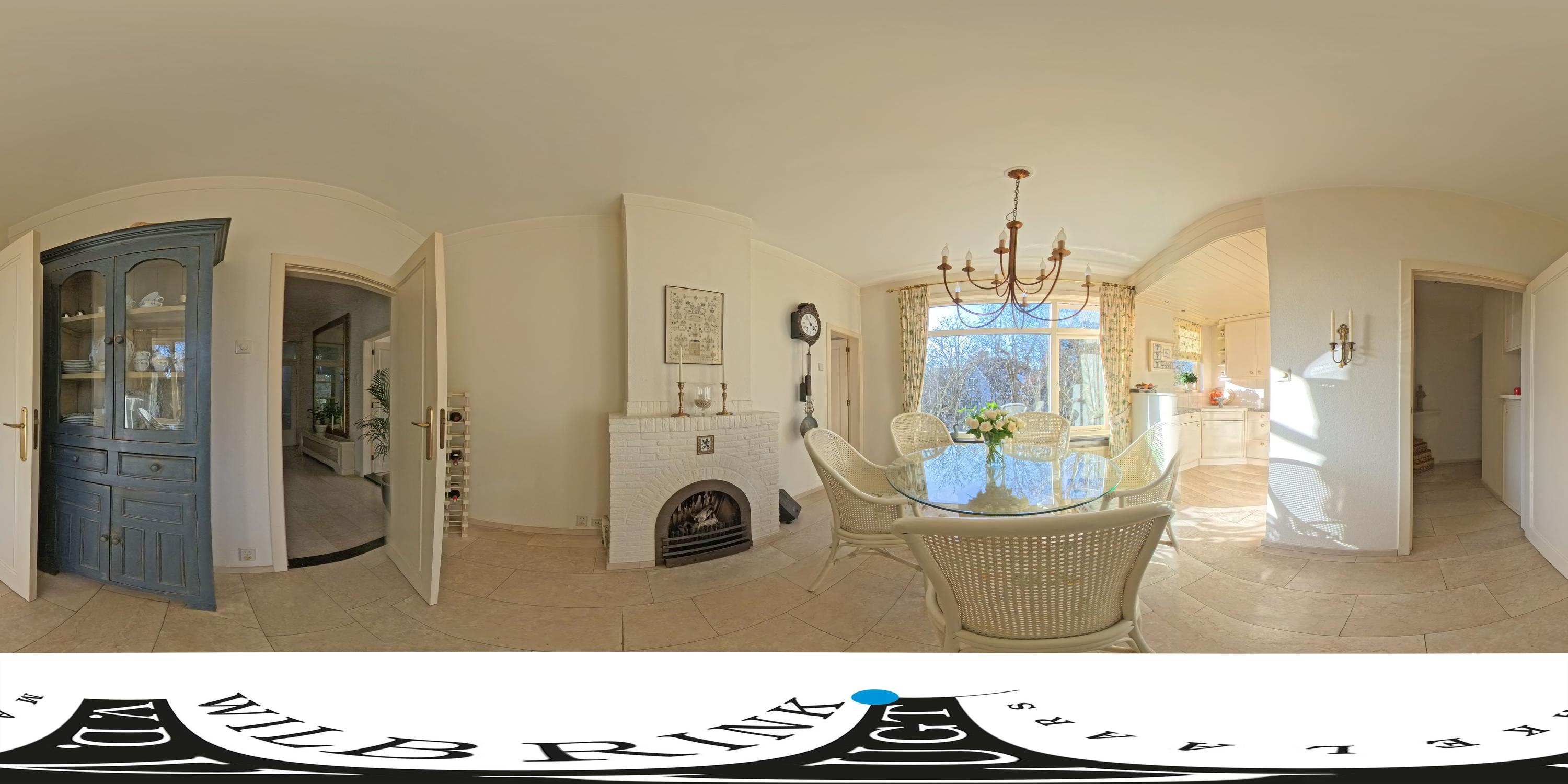 De royale woonkamer is een heerlijke leefruimte met een warme, uitnodigende sfeer. De open haard en de elegante marmeren vloer geven de ruimte karakter, terwijl de deuren vanuit de woonkamer zorgen voor een directe verbinding met de tuin. De zon draait van ’s-ochtends tot ’s-avonds om het huis wat voor een prachtige lichtinval zorgt.