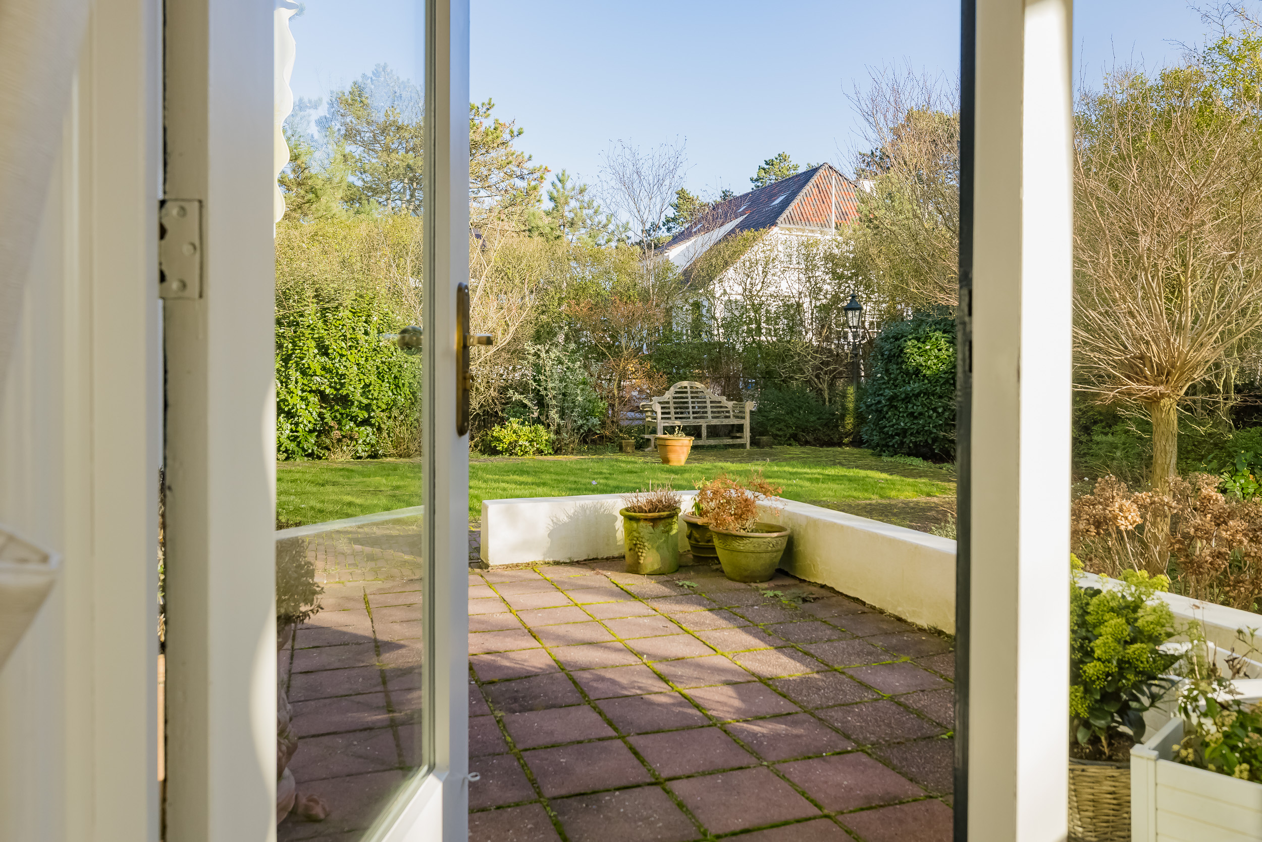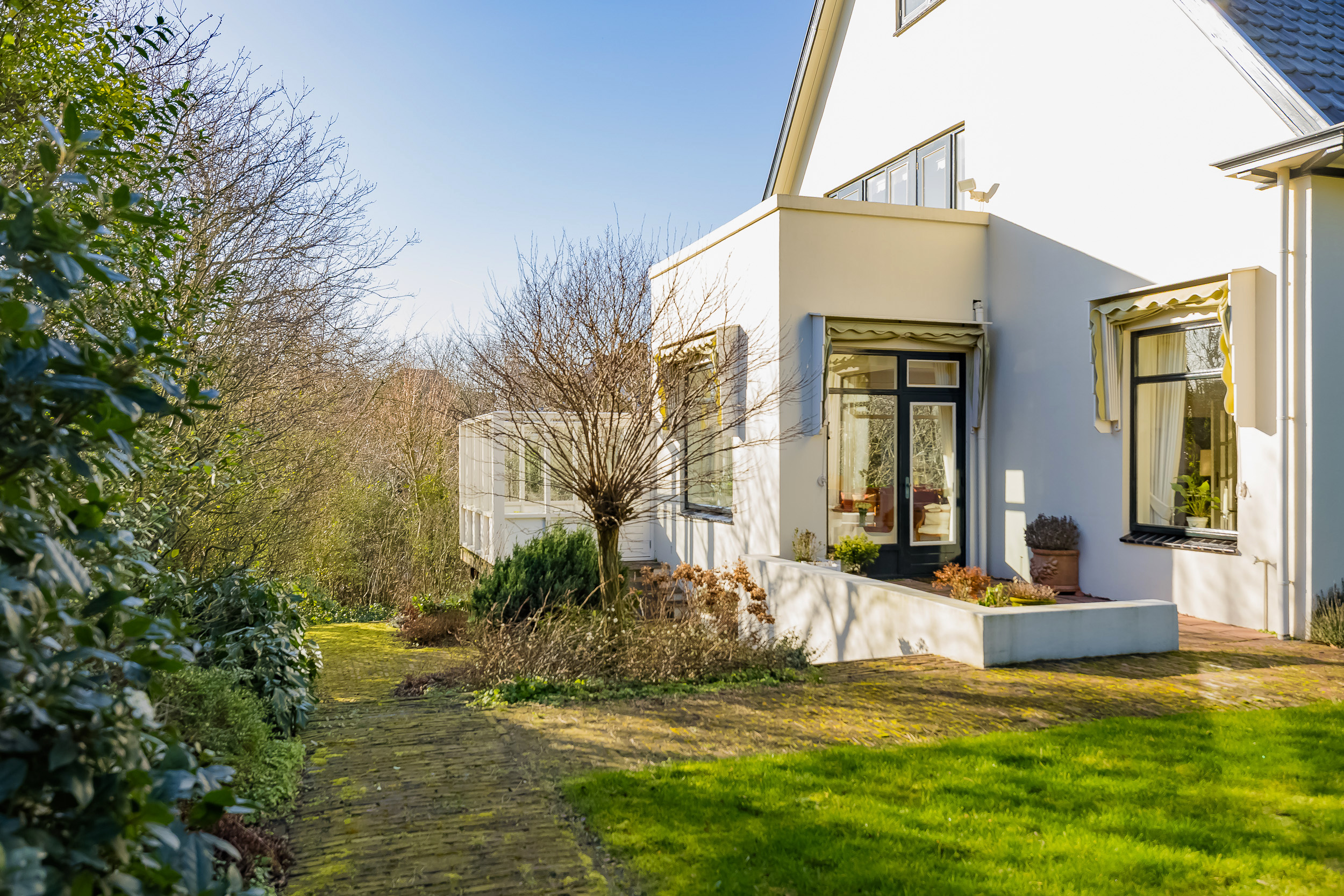 De zonnige tuin rondom de woning is groen en geeft een besloten gevoel.
