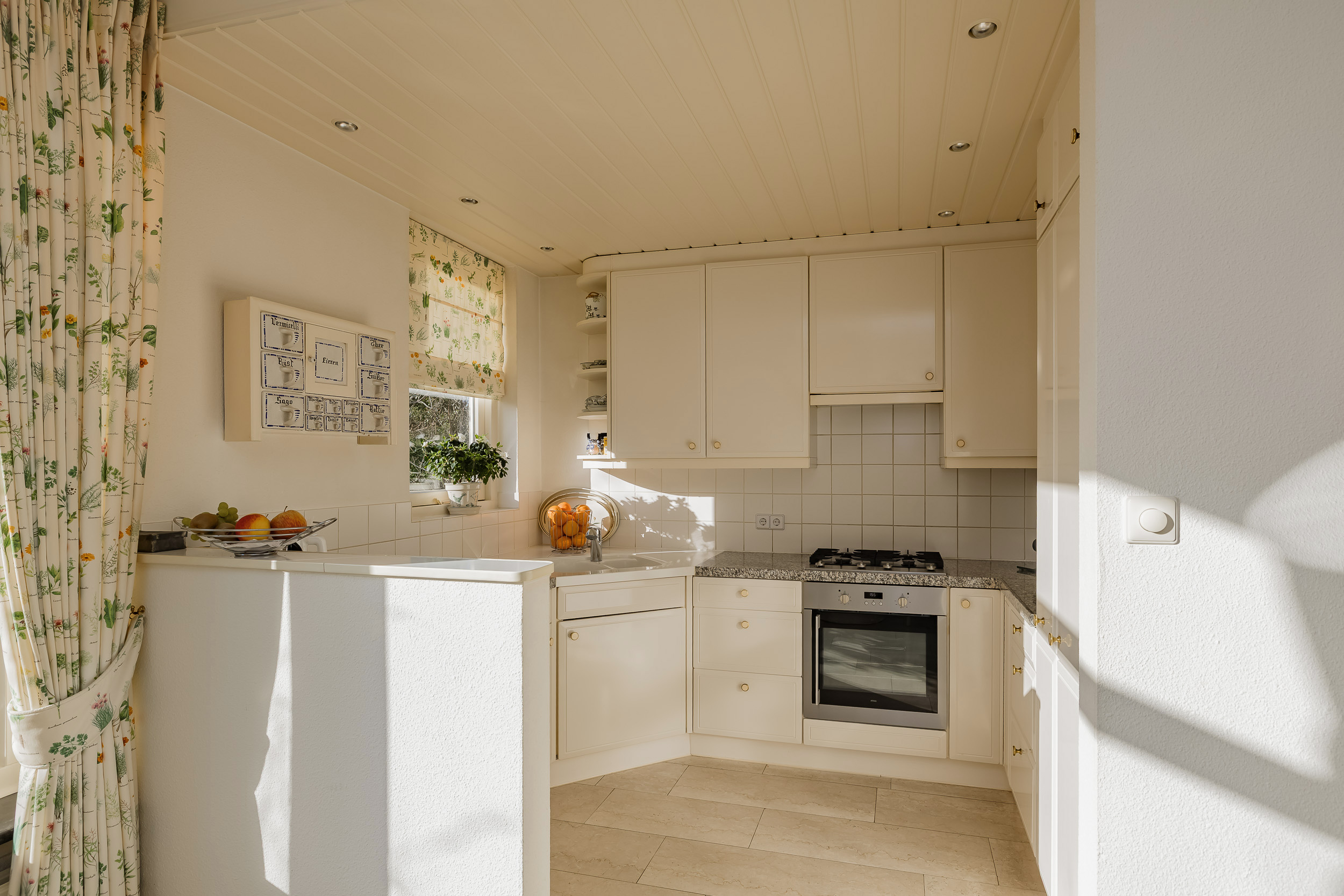 De woonkeuken is een prettige plek om samen te komen, mede door de sfeervolle originele gashaard. De keuken is uitgerust met een gaskookplaat, oven, afzuigkap, koel-/vriescombinatie en vaatwasmachine.