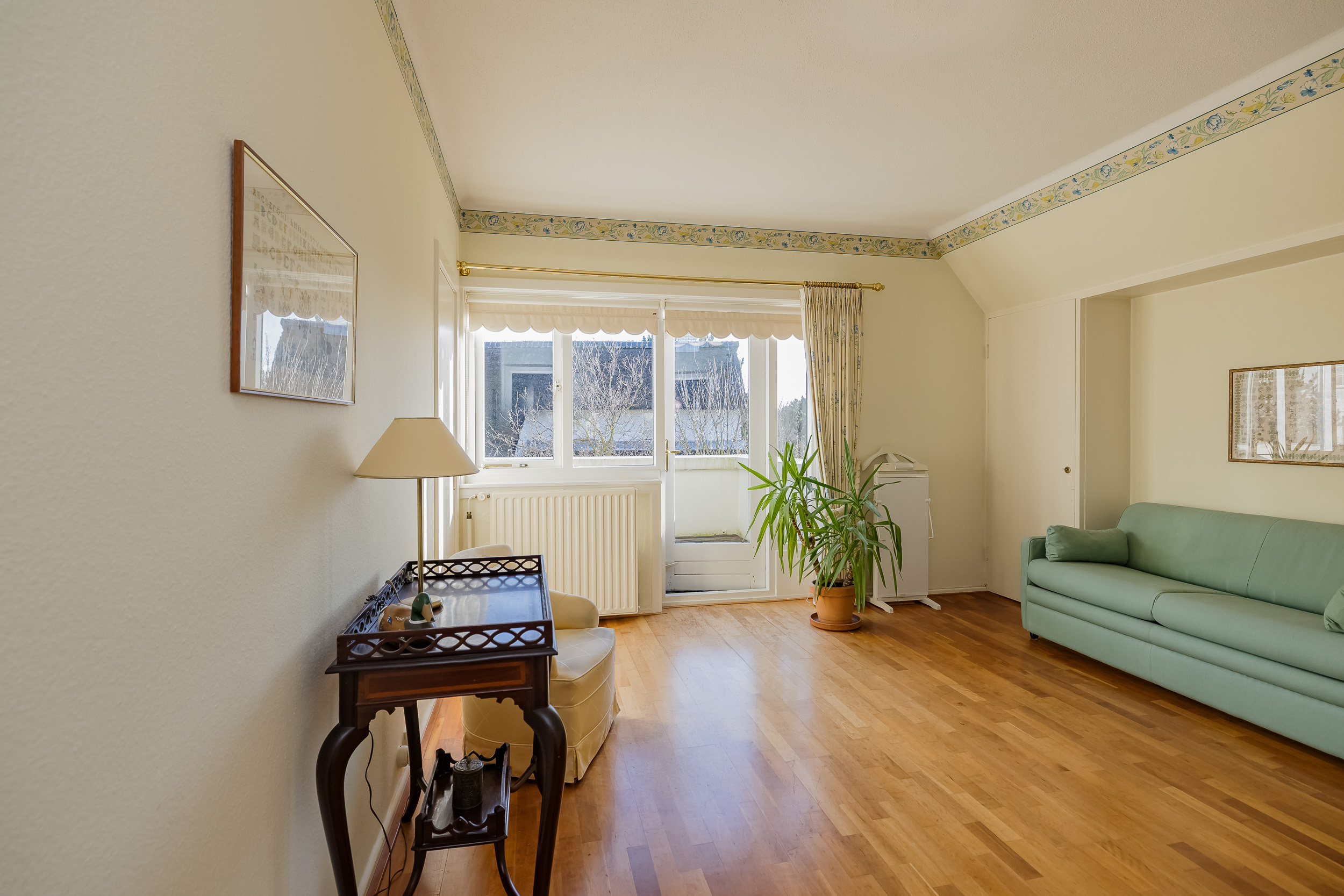 De eetkamer en-suite is met schuifdeuren handig af te sluiten van de woonkamer. Op het zonnige, met glas afgeschermde terras, geniet je al vroeg in het seizoen van de eerste zonnestralen, terwijl de deur op het terras directe toegang geeft tot de tuin.