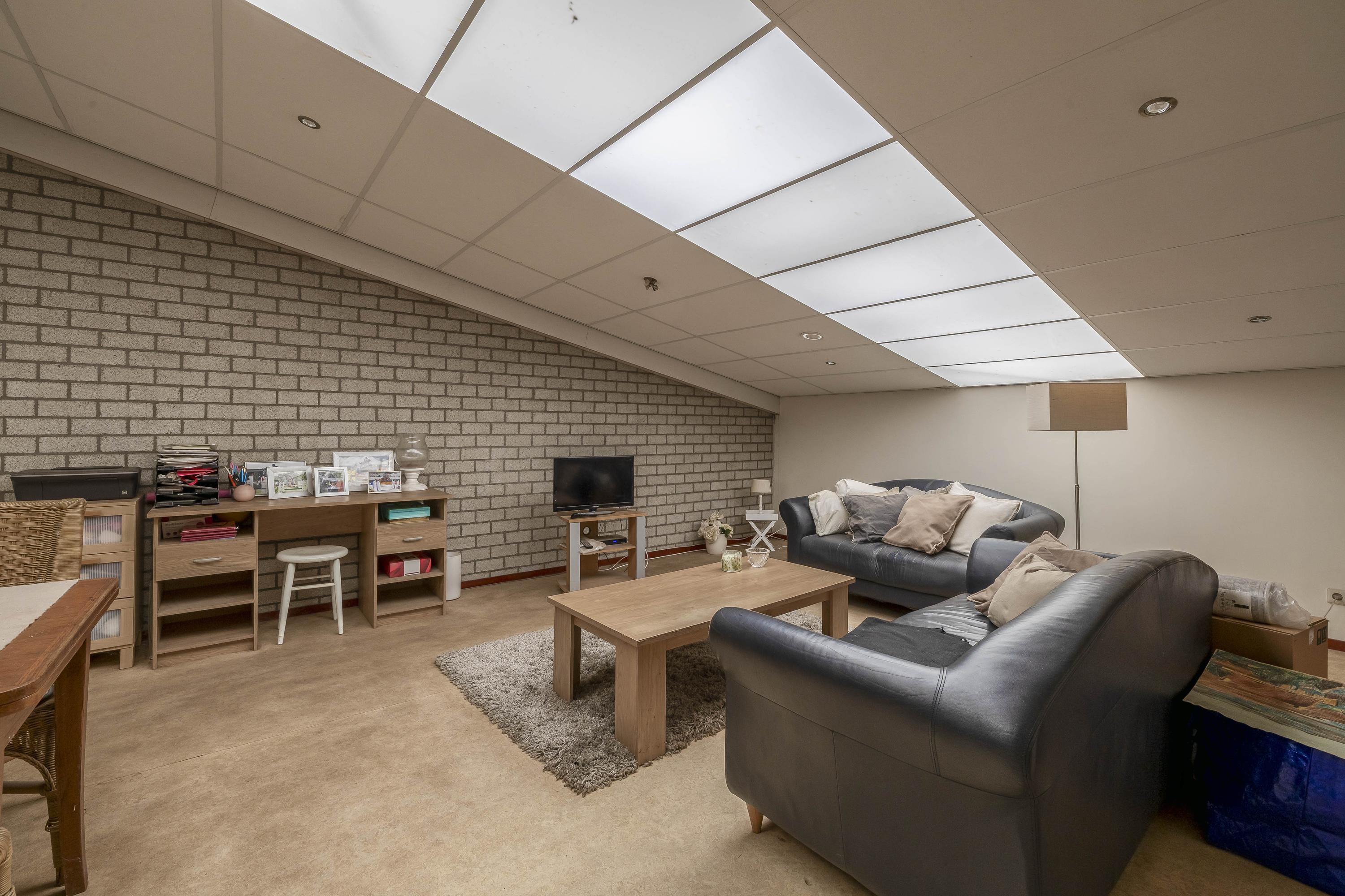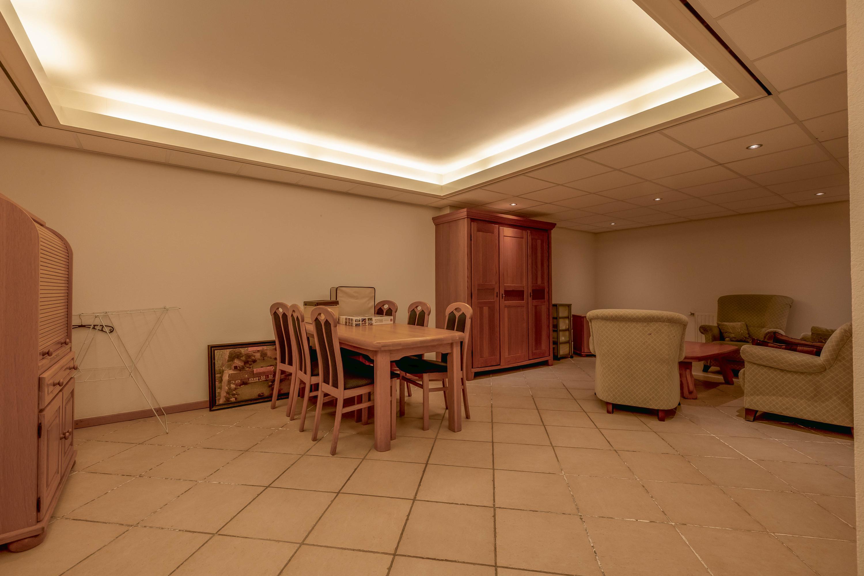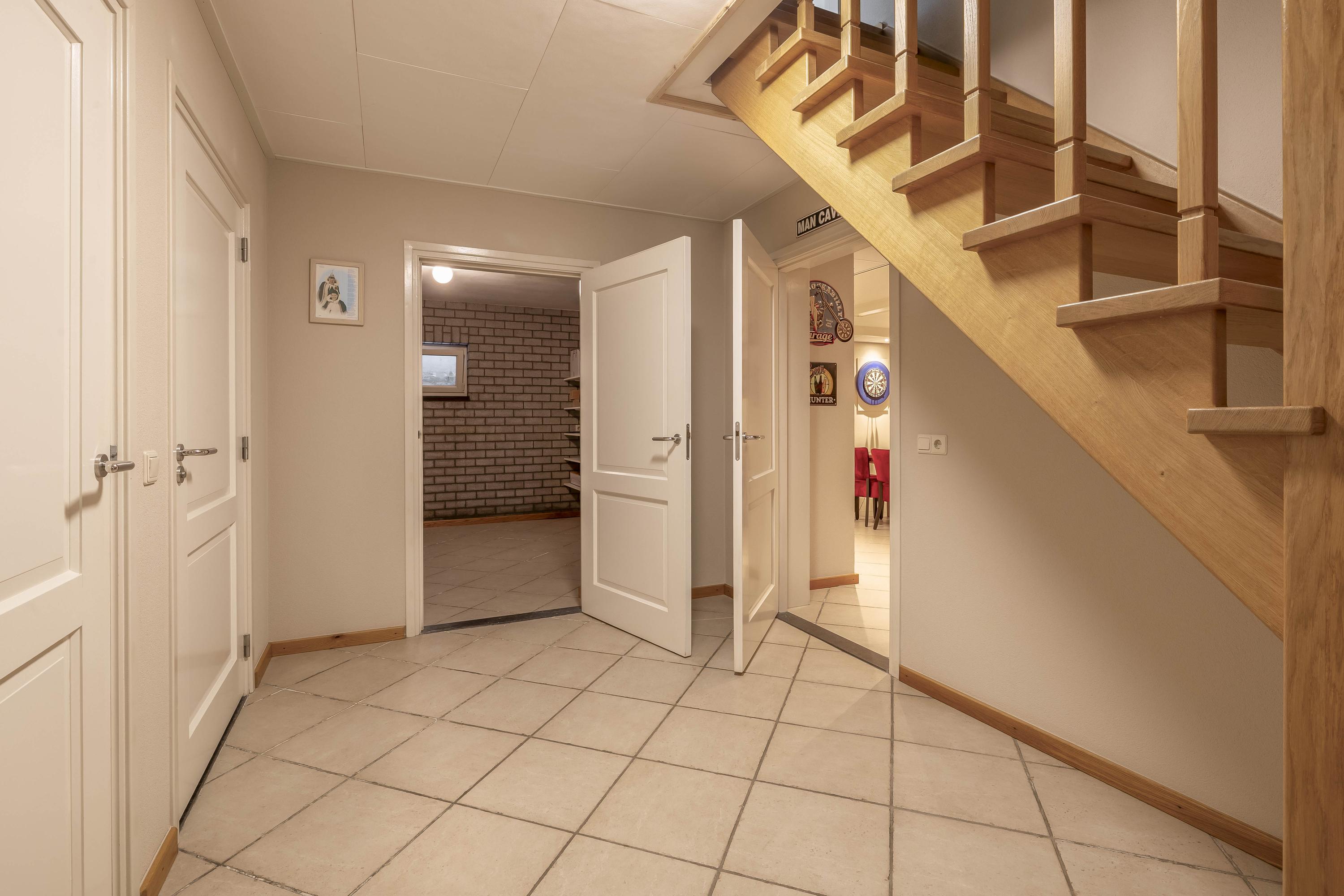 Een vaste trap biedt toegang tot de onderkelderde ruimte onder de woning. Deze kelder bestaat uit meerdere ruimtes, waaronder een 'mancave/café', een speelkamer/chillruimte en een praktische provisiekelder. De veelzijdigheid van deze ruimtes biedt talloze mogelijkheden en zorgt bovendien voor veel extra leef- en opslagruimte in de woning. De mancave/café is afgewerkt met een tegelvloer voorzien van vloerverwarming, stucwerk wanden en een plafond dat deels voorzien is van een systeemplafond en deels van stucwerk. De ruimte is uitgerust met airconditioning, wat bijdraagt aan het comfort. Deze ruimte leent zich perfect voor het organiseren van feestjes of gezellige bijeenkomsten. De speelkamer/chillruimte is afgewerkt met een tegelvloer voorzien van vloerverwarming, spachtelputz wanden en een stucwerk plafond. Deze veelzijdige ruimte biedt volop mogelijkheden en kan gemakkelijk worden ingericht voor diverse andere doeleinden, zoals een hobbykamer, thuiswerkplek of fitnessruimte. In deze ruimte zijn ook de warmtepomp, de glasvezel aansluting, de meterkast met waterontharder en de unit voor de vloerverwarming gesitueerd. De ruime provisiekelder is afgewerkt met een tegelvloer, metselwerk wanden en een stucwerk plafond. Praktische schappen zorgen voor bergruimte. De toiletruimte is geheel betegeld en verder uitgerust met een toilet (Sanibroyeur) en een fonteintje.